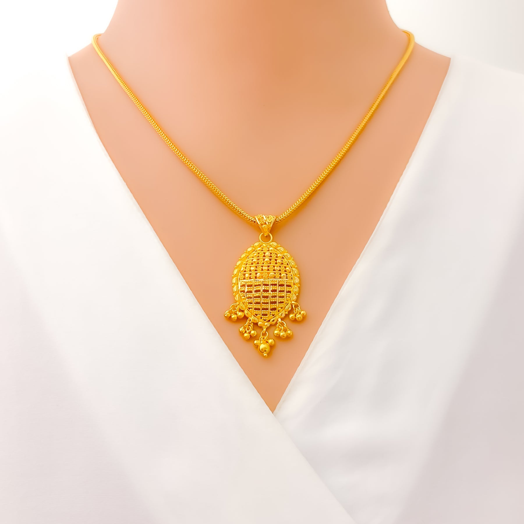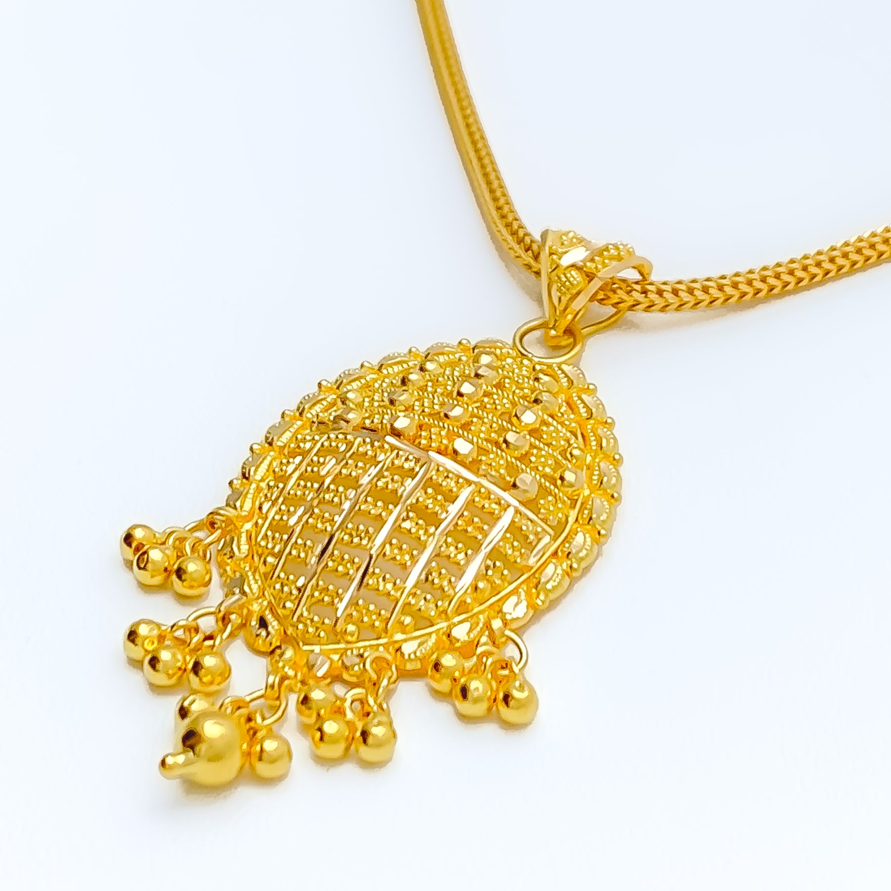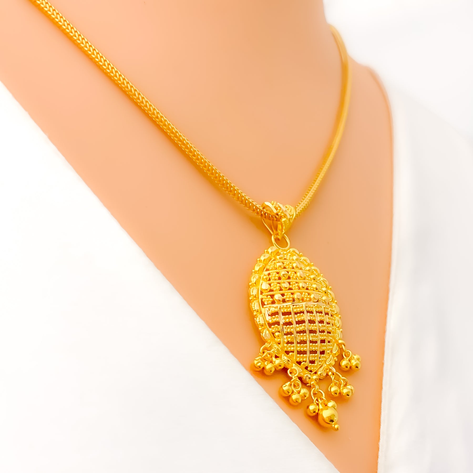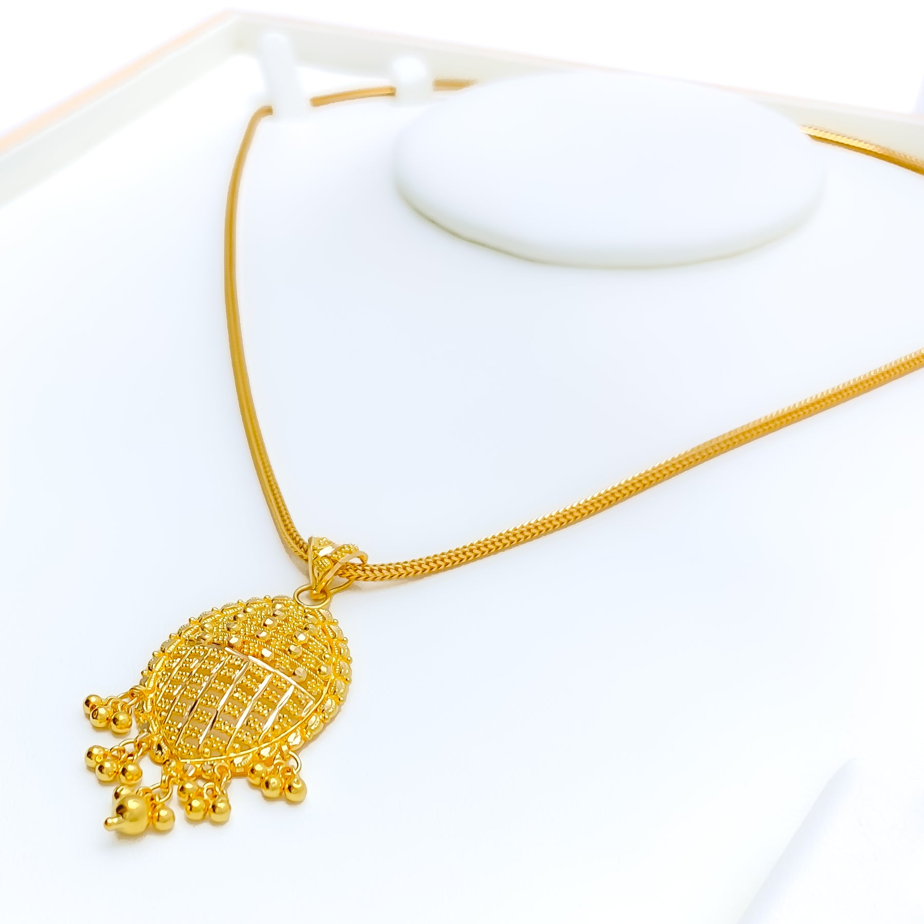 Designed with sophistication in mind, this 22k yellow gold pendant features a graceful marquise silhouette that blends traditional elegance with modern refinement. Weighing 5.8 grams, its elongated 2" form adds a flattering vertical accent to your neckline. The intricate finish brings depth and radiance, making it ideal for statement layering or solo wear. Chain not included, offering full styling flexibility.