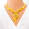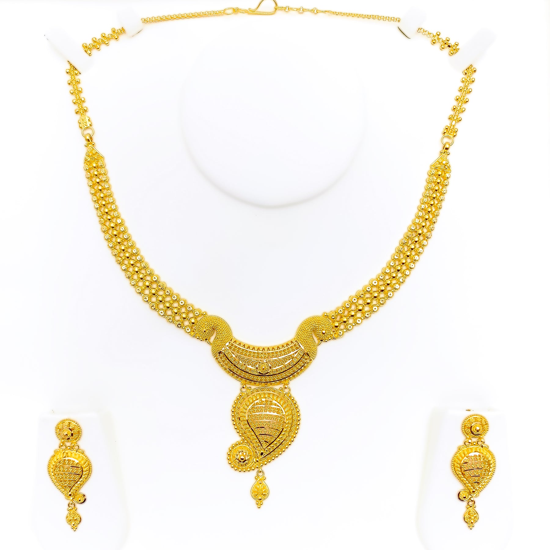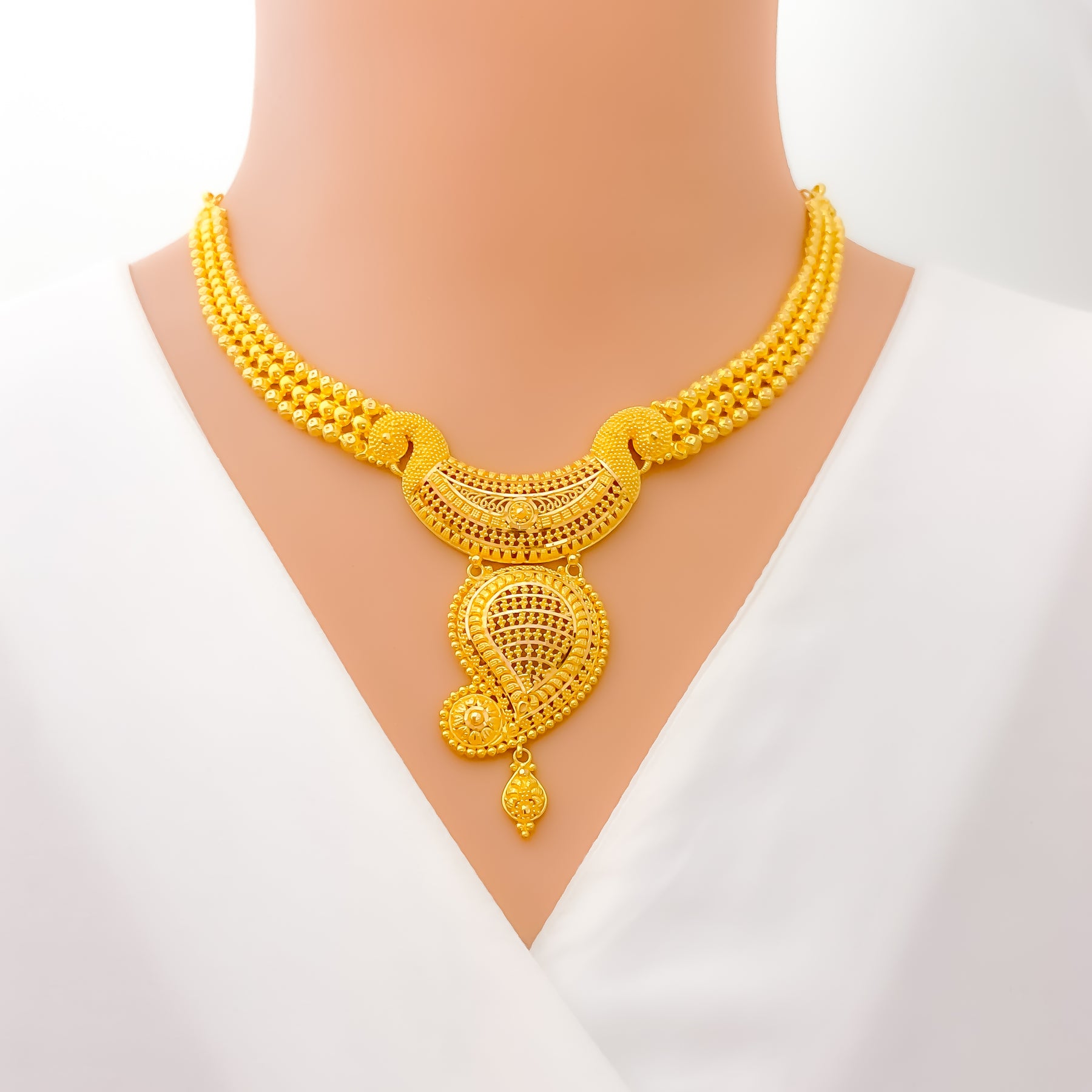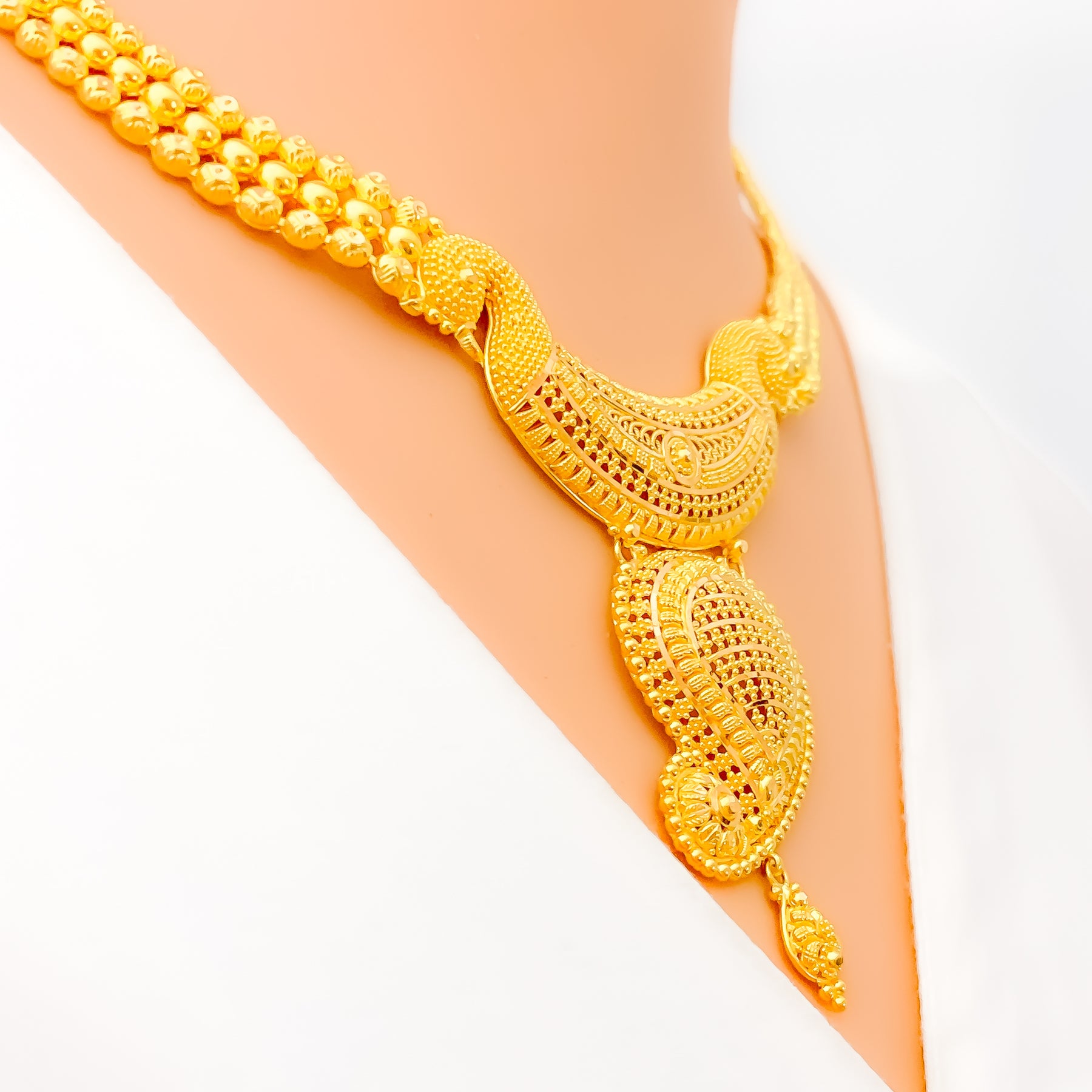Inspired by timeless motifs, this 22k gold necklace set weighs 42.3 grams and showcases intricate paisley accents sculpted in radiant yellow gold. The 17-inch necklace features a graceful 1.8-inch drop with 0.75-inch adjustable links and a secure hook lock for elegant wear. Matching 1.75-inch earrings with screw-back posts echo the ornamental artistry, completing a look steeped in cultural richness. A sophisticated blend of tradition and craftsmanship, ideal for celebrations and heirloom-worthy moments.
