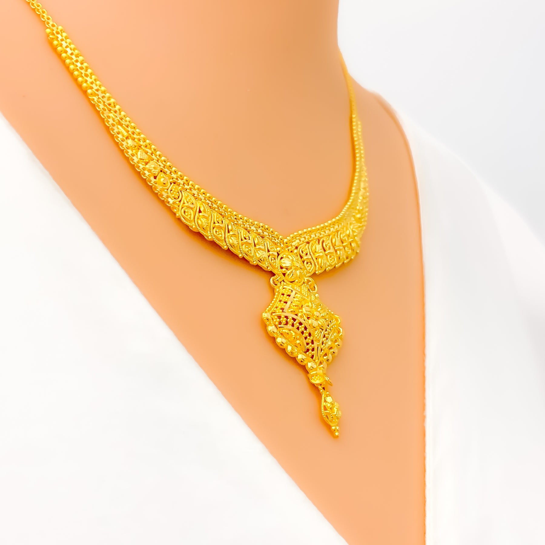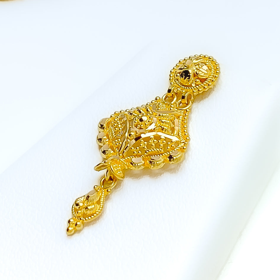Refined 22k yellow gold set weighs 20.1 grams, featuring a floral design with warm radiant elegance. The 16 inch length with 1.25 inch drop includes 1 inch adjustable links and hook lock. Matching earrings measure 1.25 inches for a balanced coordinated presence. Screw back posts ensure secure comfortable wear, delivering timeless sophistication with graceful traditional charm.