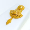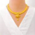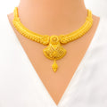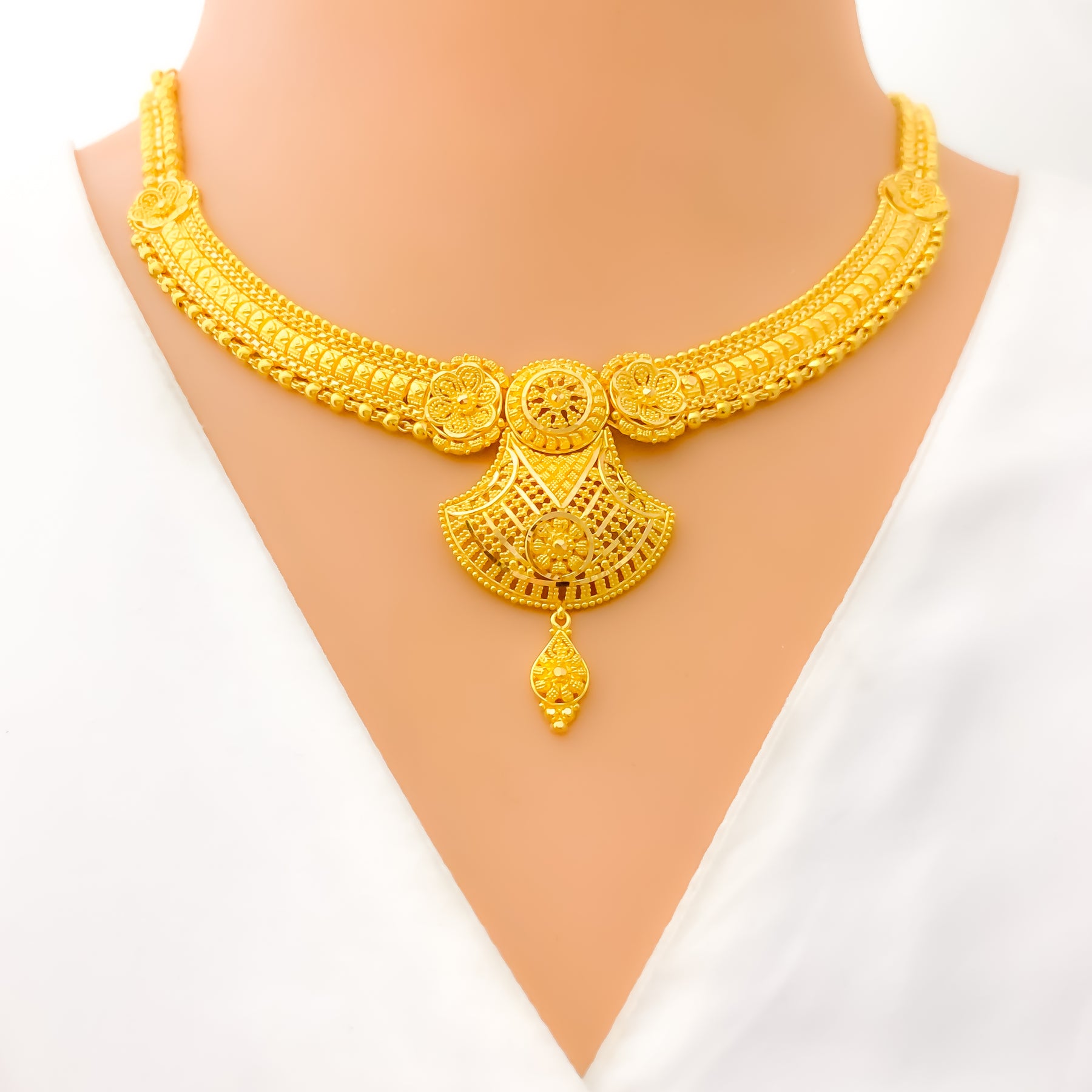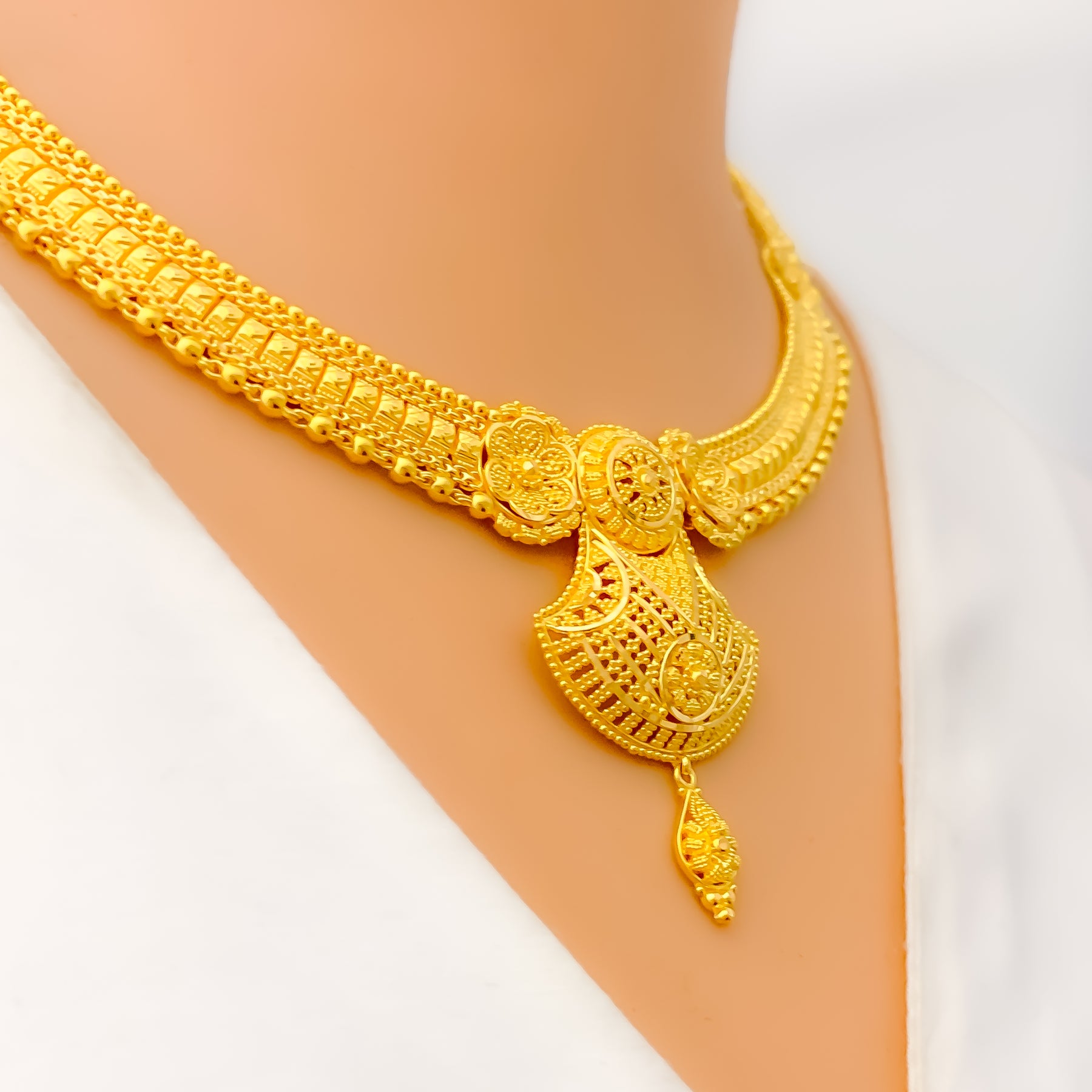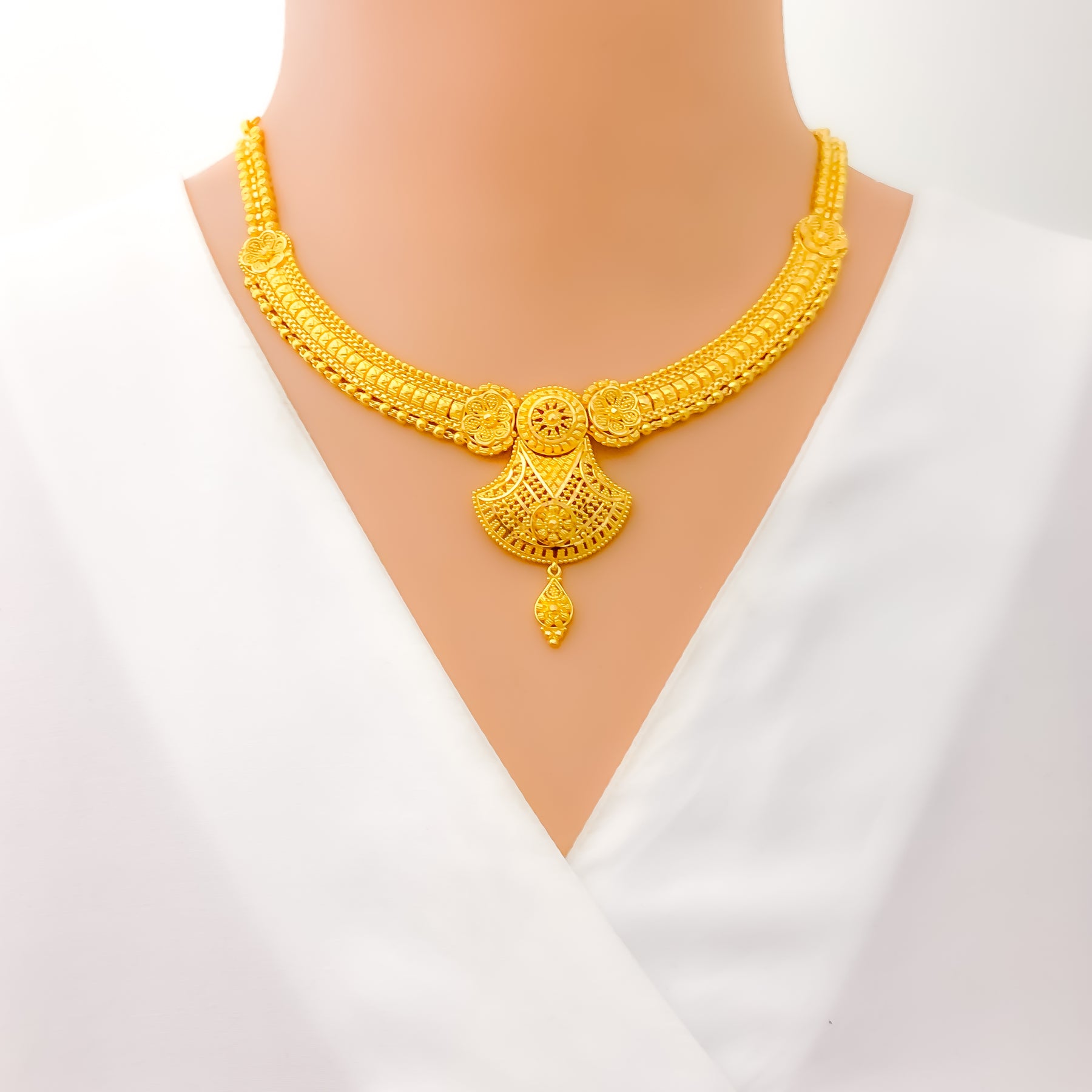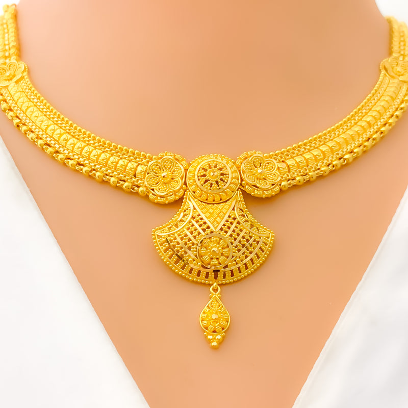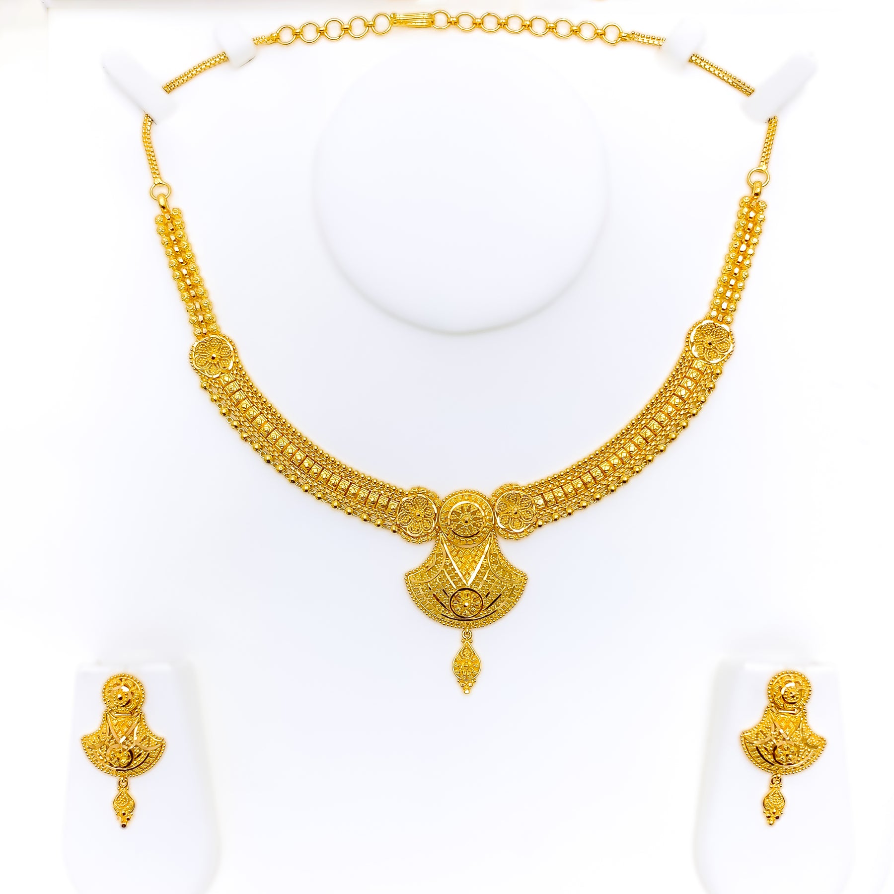 Majestic and graceful, this 38.8-gram necklace set in 22k yellow gold features a floral fanned design that radiates royal elegance. The 16-inch necklace includes a 1.5-inch drop with 1.75-inch adjustable links and secures with a hook lock. Paired with 1.4-inch screw-back earrings, it’s perfect for elevated occasions.