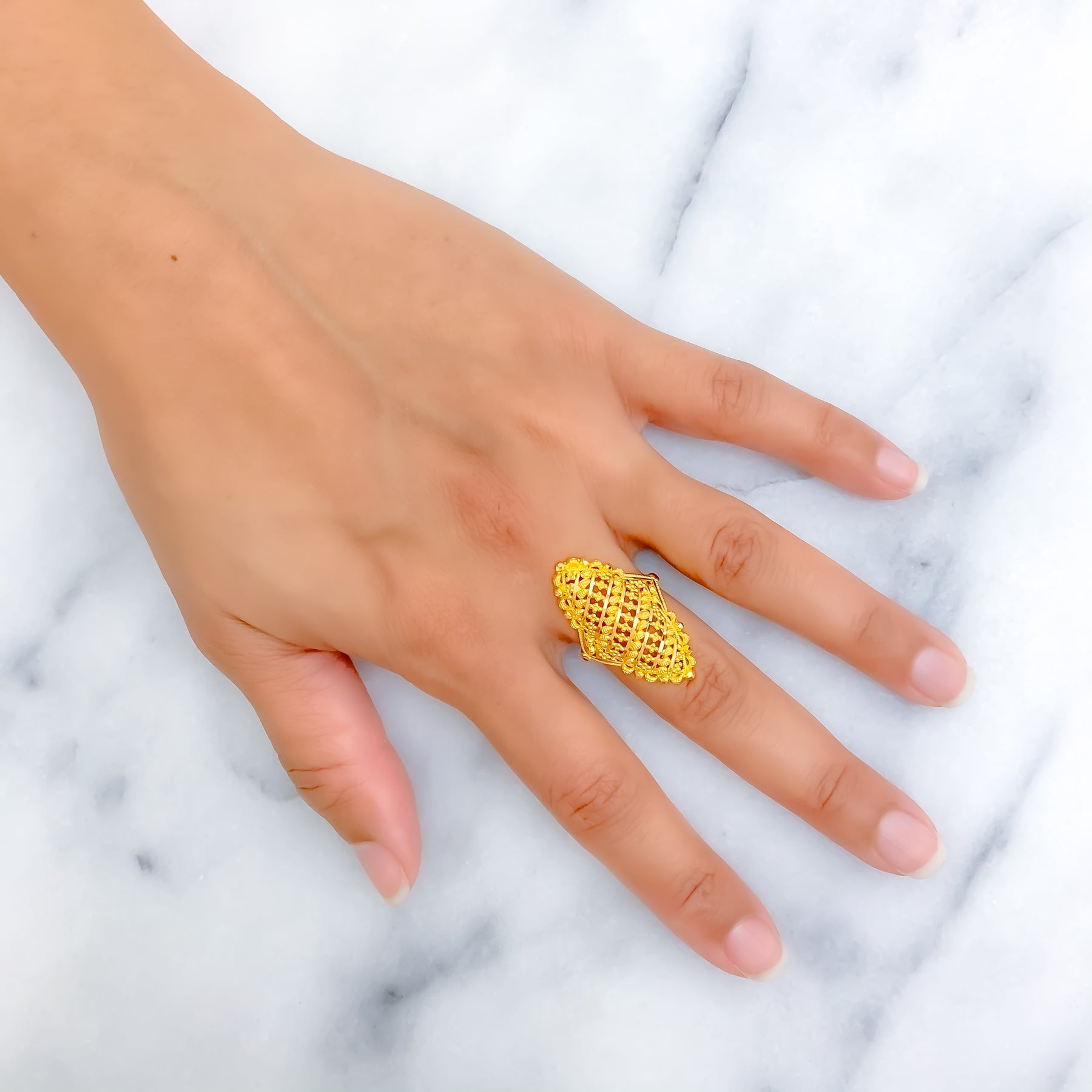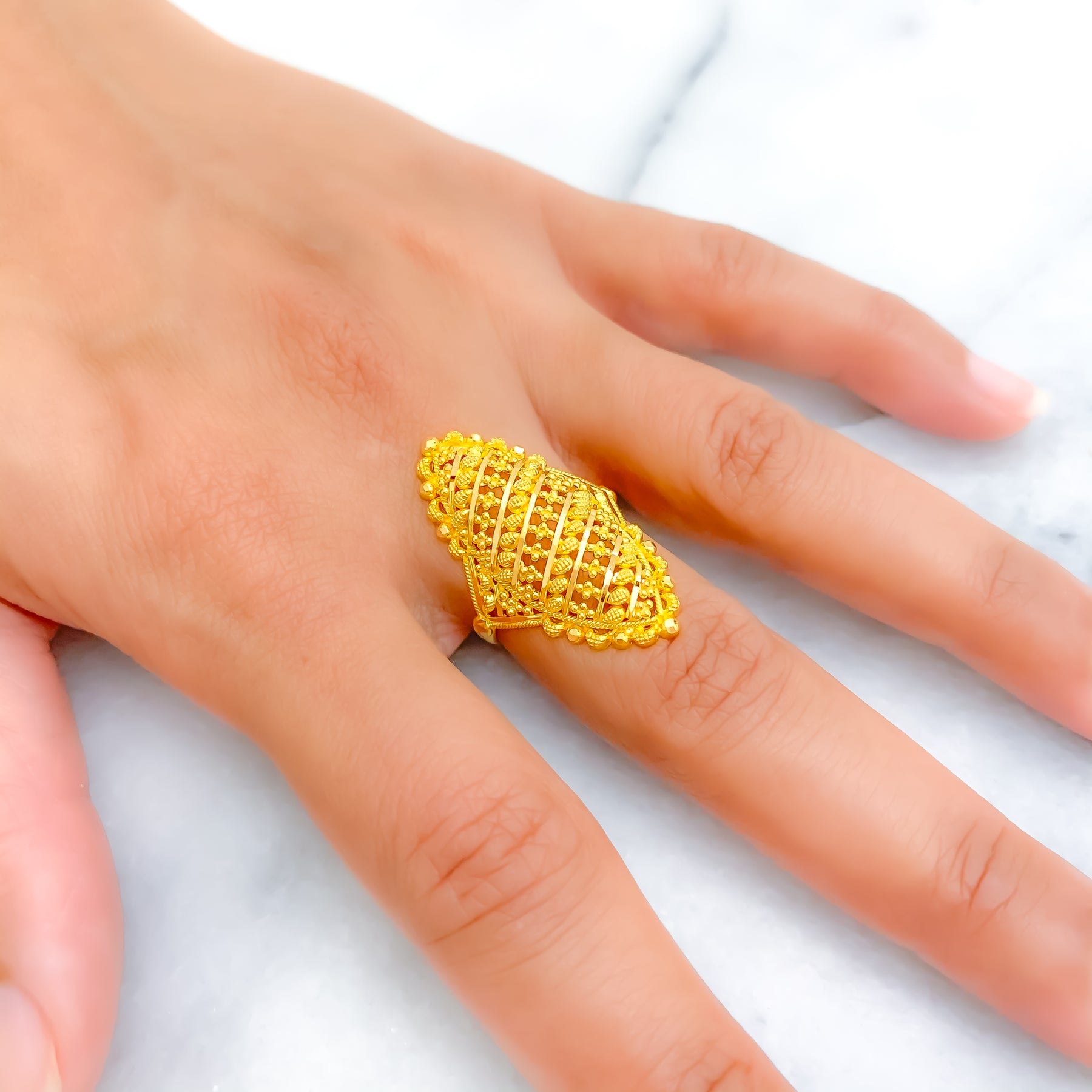 Refined 22k yellow gold ring weighs 4.3 grams, showcasing a brilliant elongated silhouette with graceful shine. The 1.25 inch length creates striking presence while maintaining elegant balance on the hand. Sized at 6.75, professional re sizing is available for added wearing flexibility. Its polished finish delivers timeless sophistication with distinctive contemporary charm.