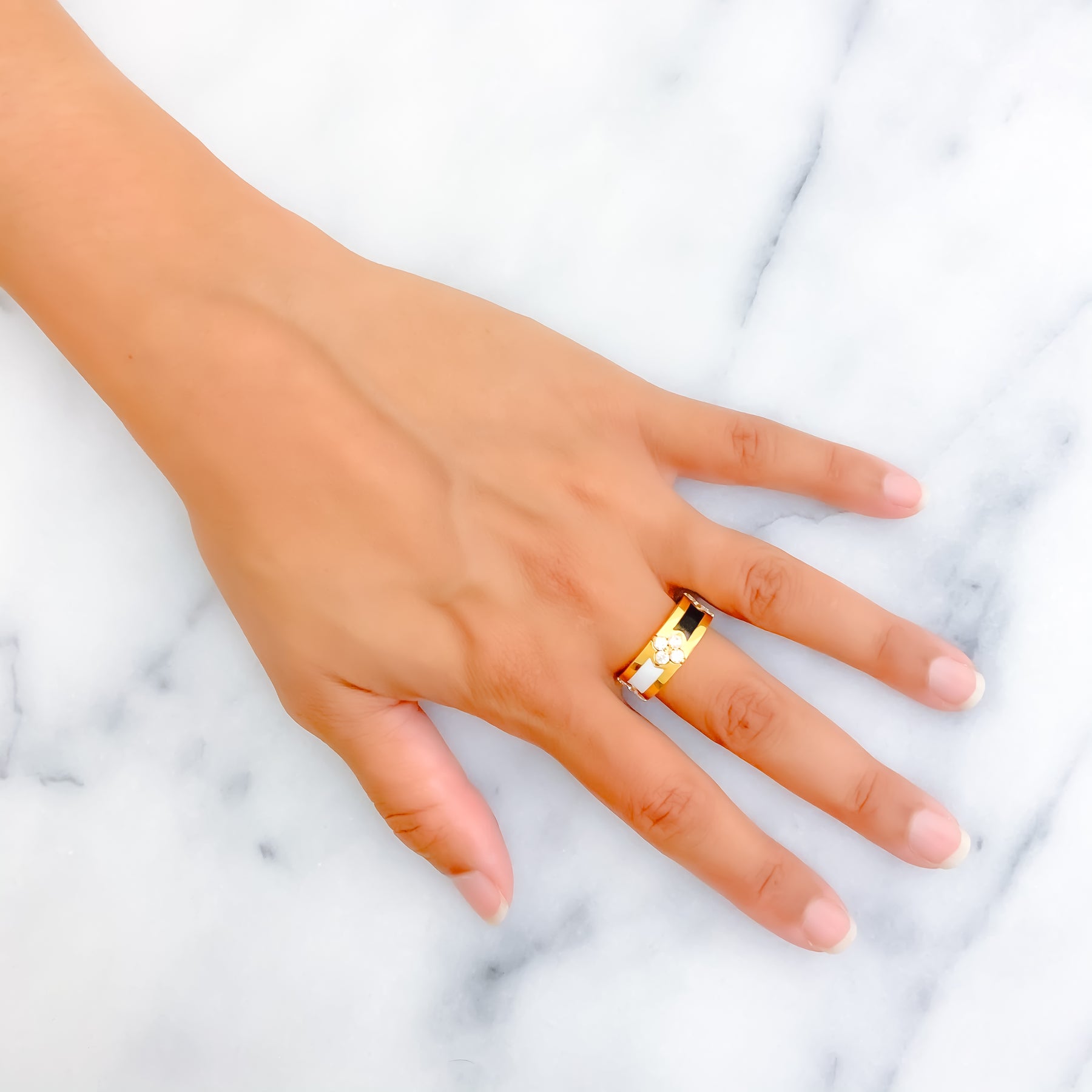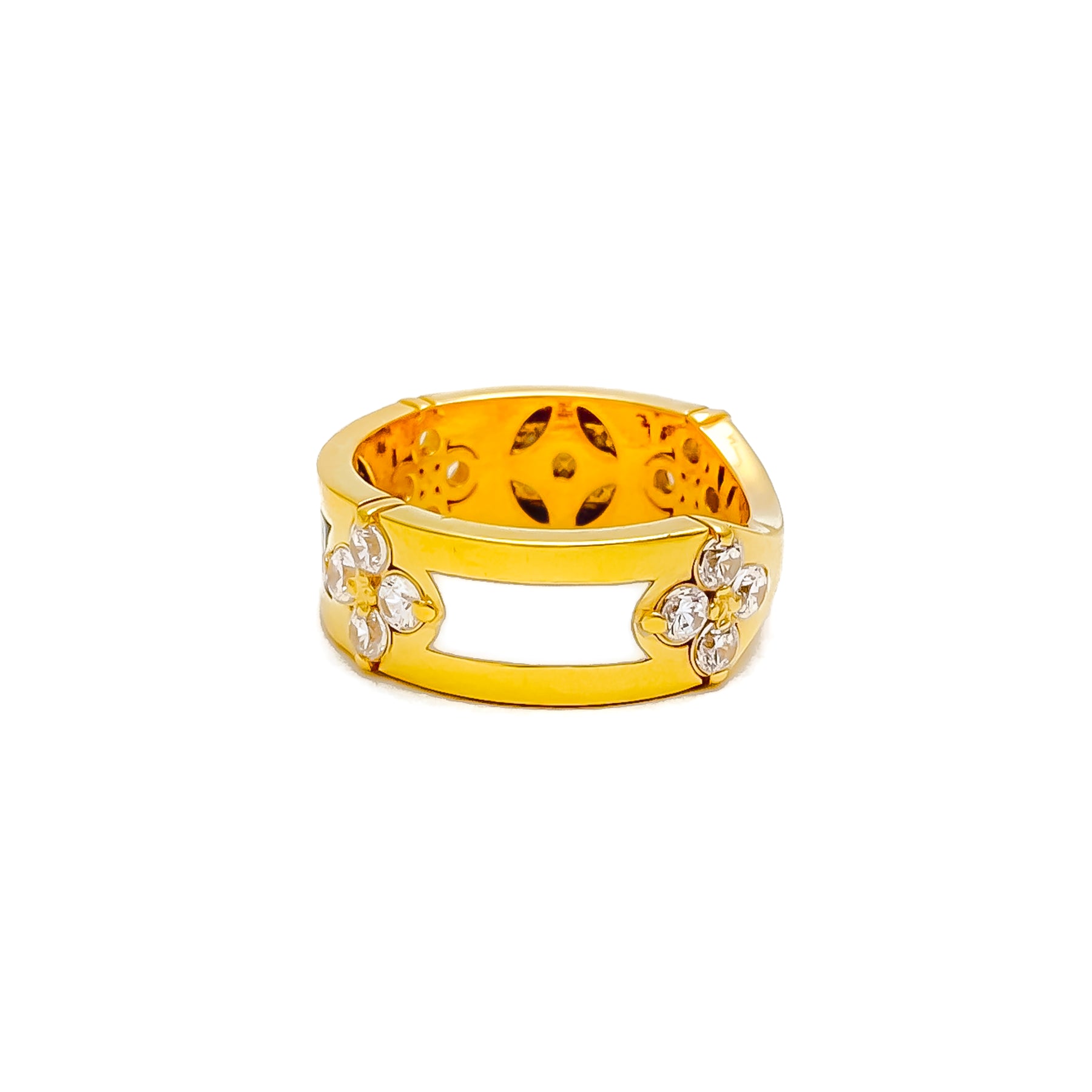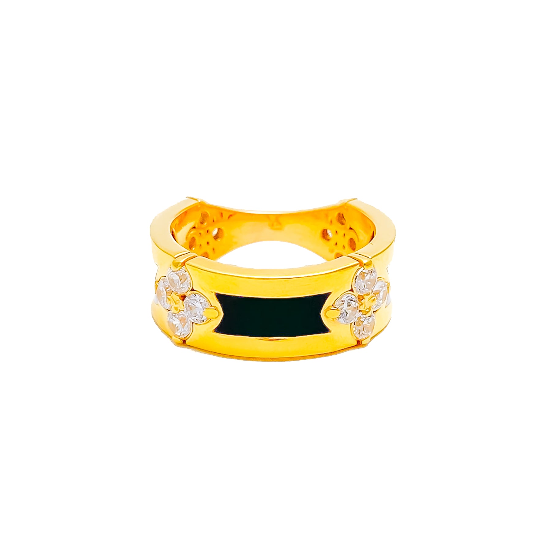 Crafted for modern flair, this dazzling 21k gold ring showcases an intricate design accented with brilliant cubic zirconia stones. Its rich yellow gold finish adds warmth and bold elegance to the 7.8-gram structure, delivering a high-polish, eye-catching presence. With a fixed size of 7.5, this ring makes a striking statement for those who love refined, fashion-forward jewelry. A flawless blend of everyday wearability and upscale charm.