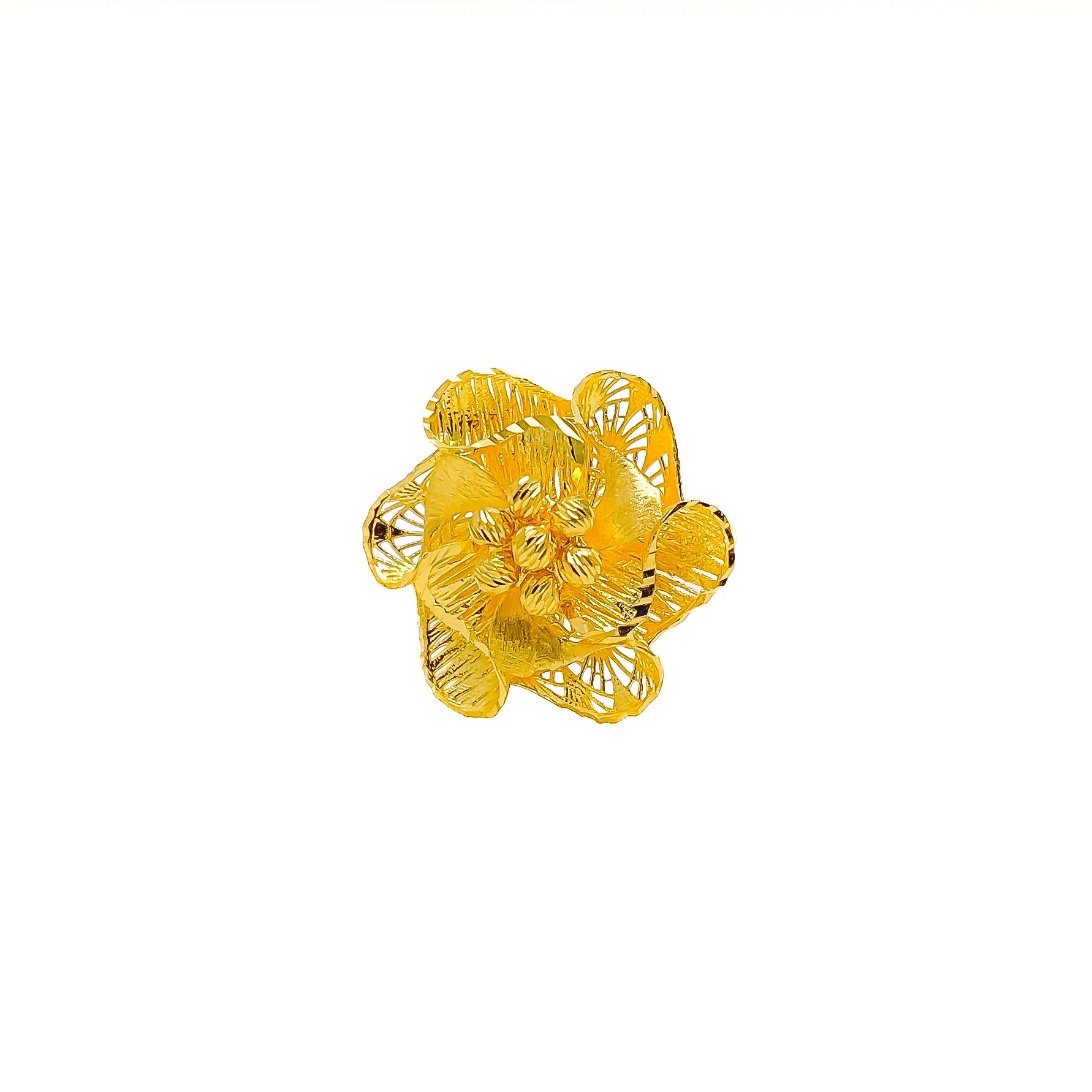 Opulently detailed, this 22k yellow gold ring weighs 4.0 grams and features a rich polished finish that beautifully enhances its lush floral design with refined depth. Sized at 7.5, it offers a comfortable, well-balanced fit that sits gracefully on the finger. Crafted as a solid piece, re-sizing is not available, preserving the integrity and precision of its original form. Charming yet elegant, this ring delivers timeless floral sophistication ideal for special occasions and elevated everyday wear.