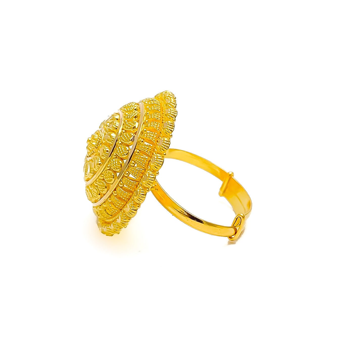 Chic 22k yellow gold ring weighs 5.2 grams, presenting a polished statement design with contemporary flair. The 0.9 inch length adds bold presence while maintaining graceful proportion on the hand. Sized at 5, it adjusts comfortably from 4 to 7 for flexible wear. Its radiant finish delivers timeless sophistication with modern expressive charm.