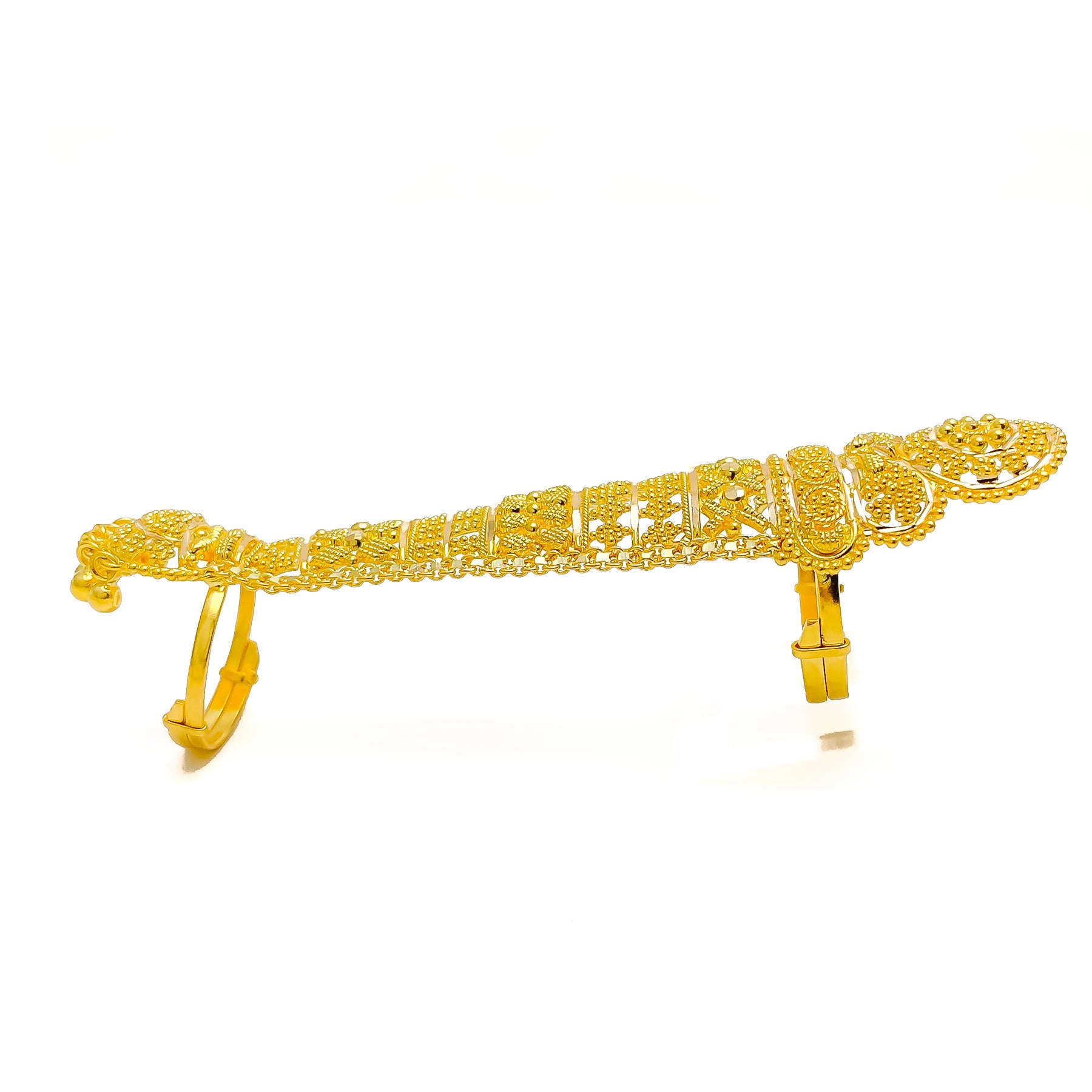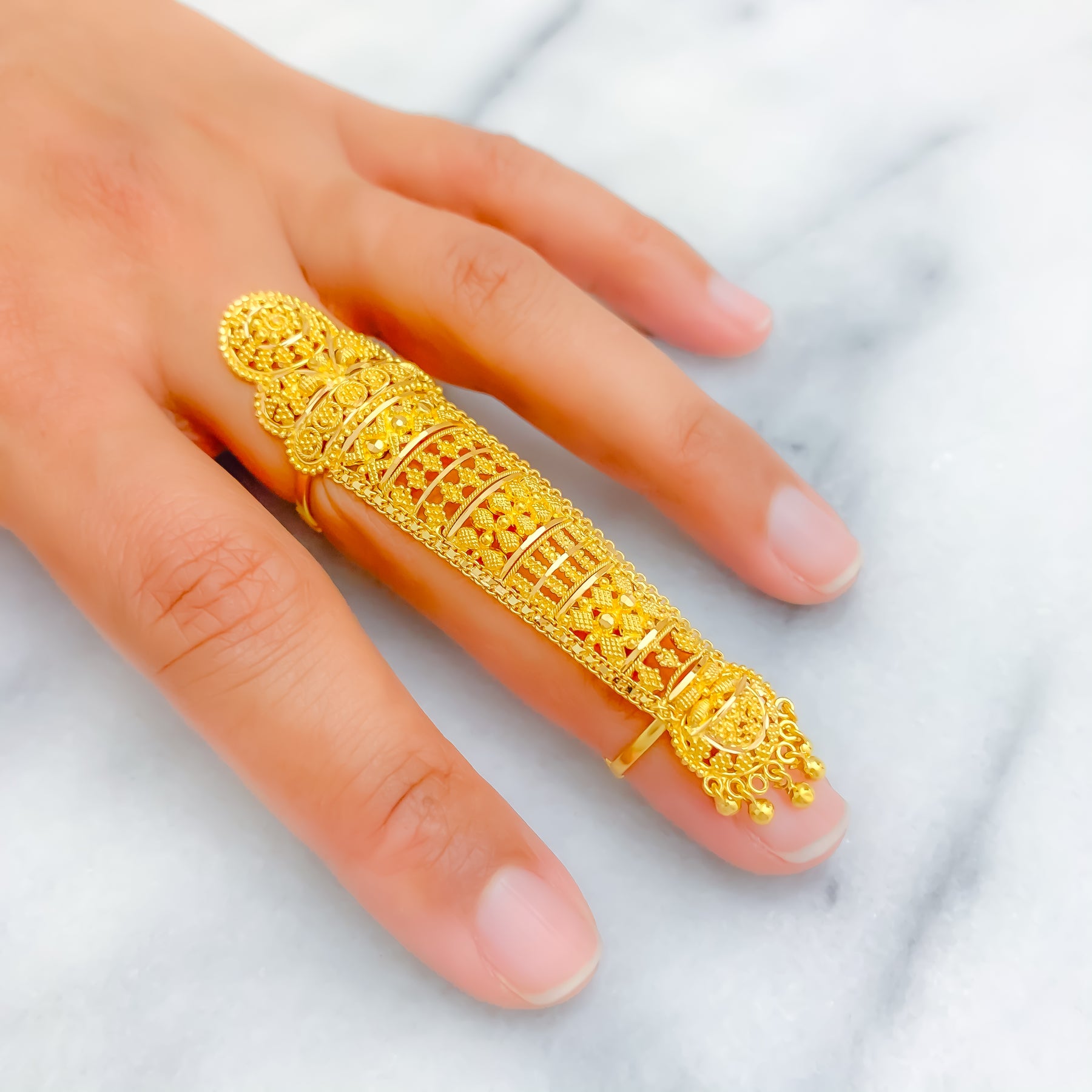Rooted in classic artistry, this heirloom-inspired overall finger ring shines in rich 22k yellow gold with elegant tasseled accents. Weighing 10.2 grams, its elongated 2.9-inch form creates a regal flow across the hand while maintaining refined balance. The dual-ring design, sized at 4.75 and 1.75, offers comfortable support with graceful symmetry. Adjustable by plus or minus one size, it delivers a personalized fit with timeless ceremonial charm.