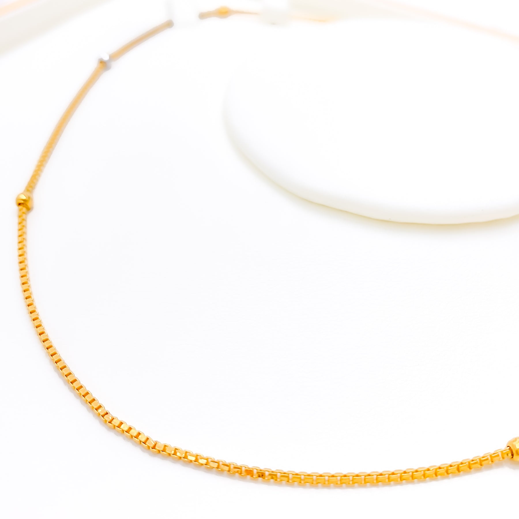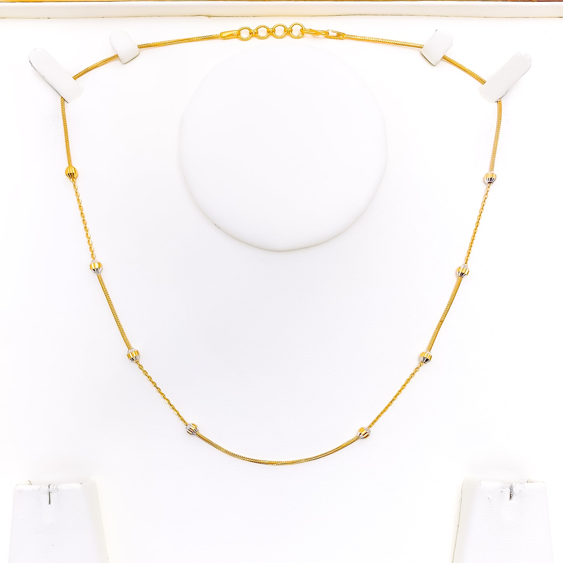 Designed with a refined balance of subtle charm and modern appeal, this 22k two-tone bead chain showcases alternating yellow and white gold accents that bring soft dimension to its slender 1mm profile. Its 6.4-gram weight offers an ultra-light feel while maintaining a luxurious presence, making it perfect for everyday elegance. The 18-inch length rests gracefully along the neckline, ideal for wearing alone or enhancing with a small pendant. Finished with a secure lobster lock, it delivers effortless sophistication in a timeless, versatile style.