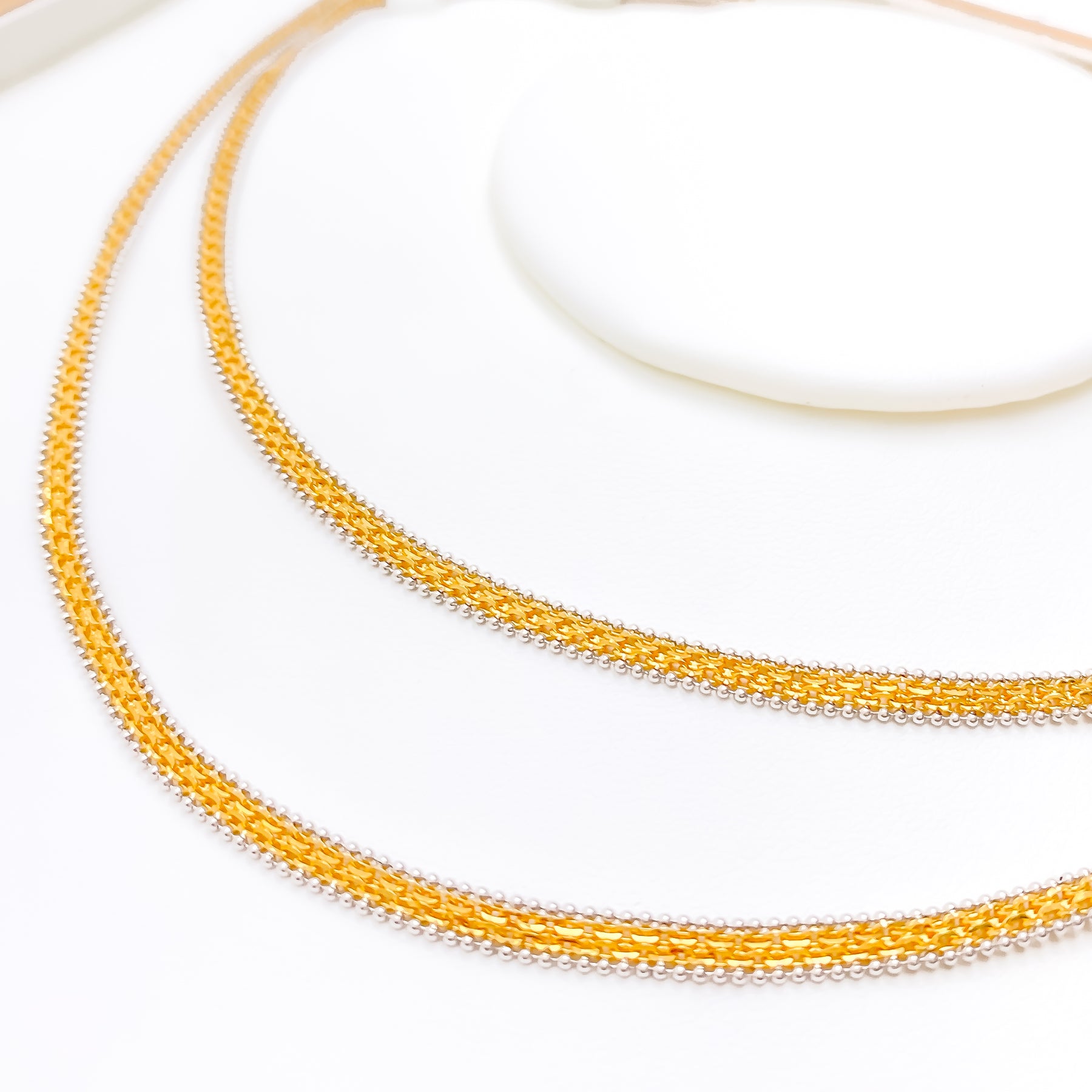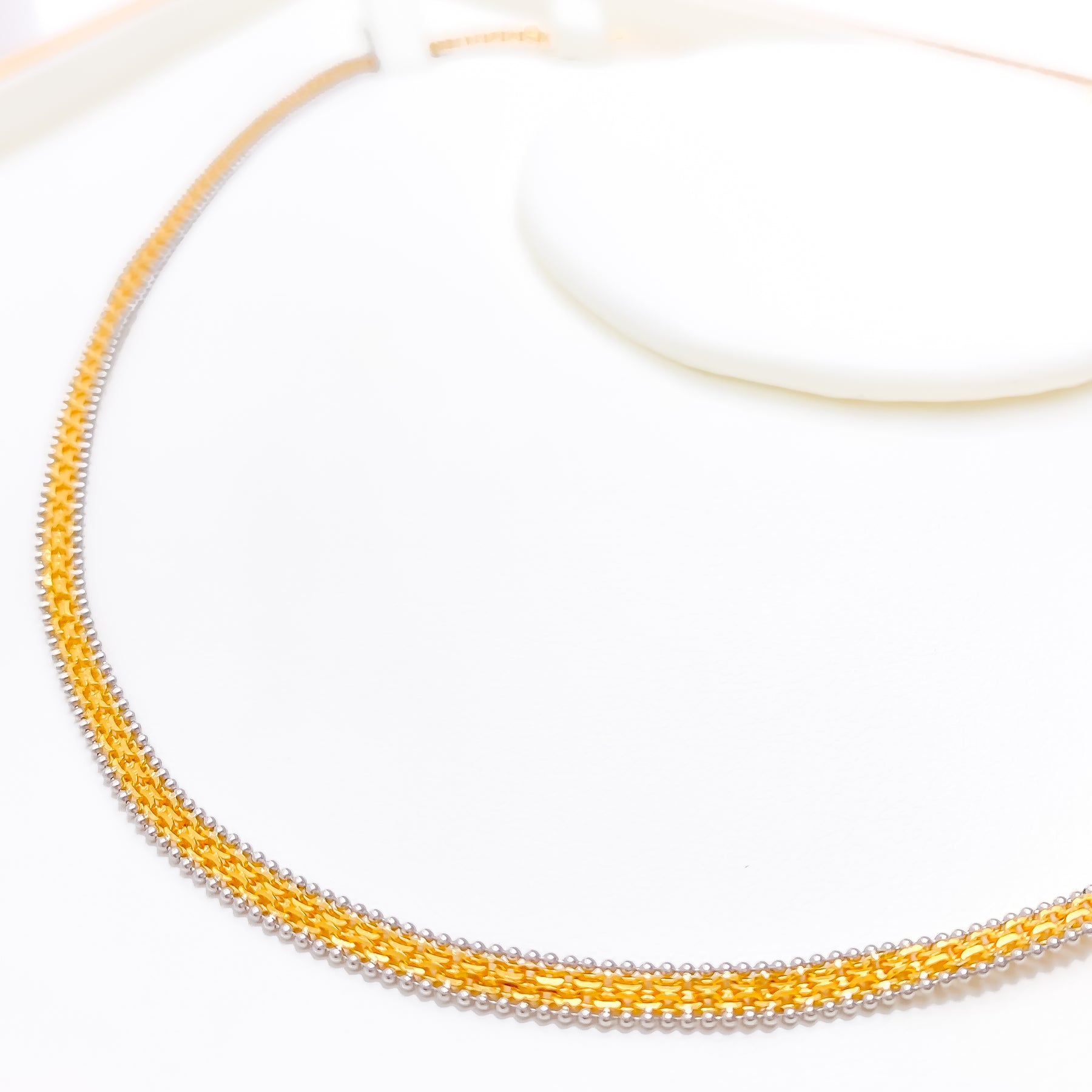 Blending rich yellow gold with bright white accents, this refined flat chain showcases a bold 4mm width that delivers striking presence and smooth, radiant shine. Its 11.3-gram weight provides a substantial yet comfortable feel, making it an ideal choice for everyday luxury or special occasions. The 18-inch length rests gracefully along the neckline, offering a balanced look that complements both minimalist and statement pendants. Secured with a dependable lobster lock, it stands out as a polished two-tone essential with elevated appeal.