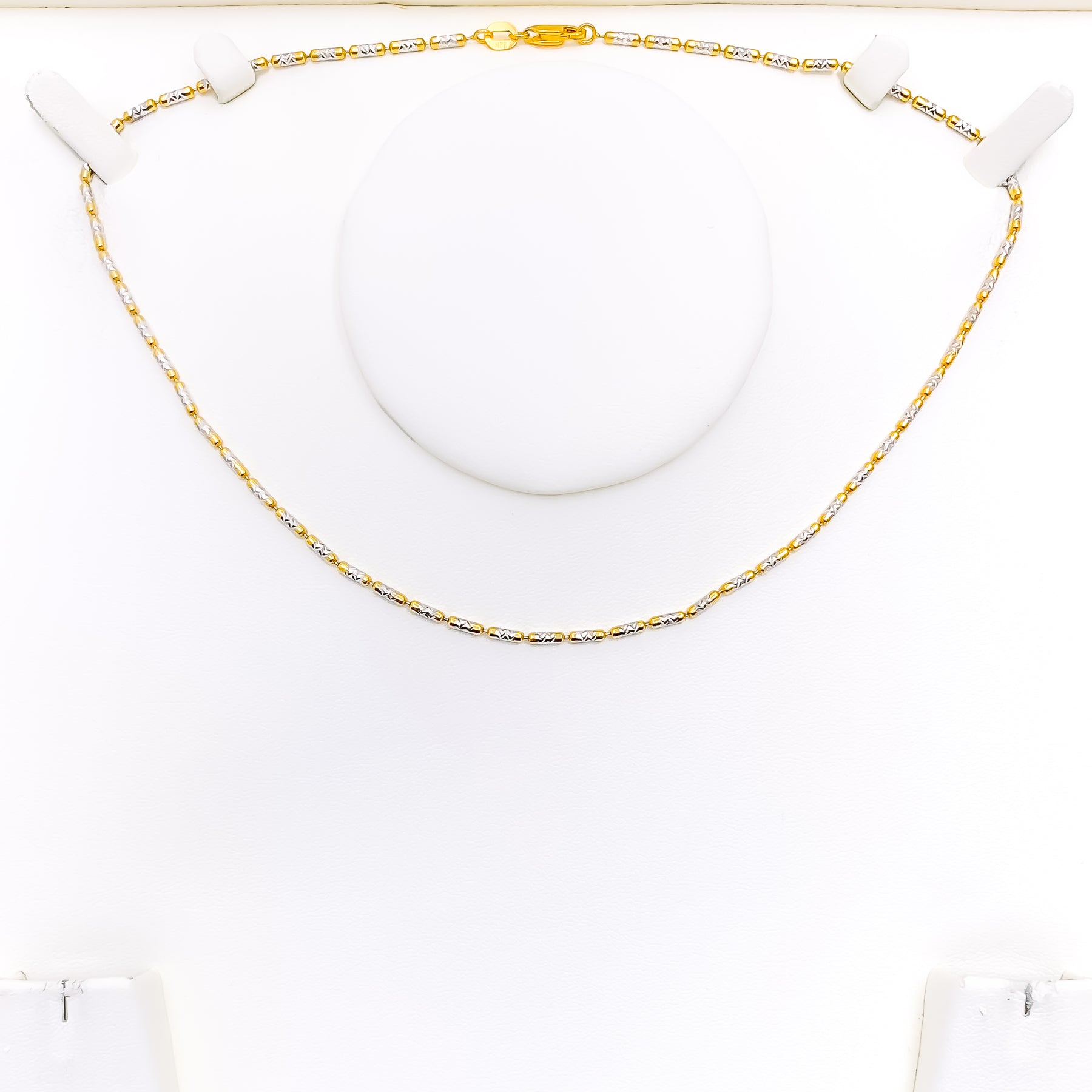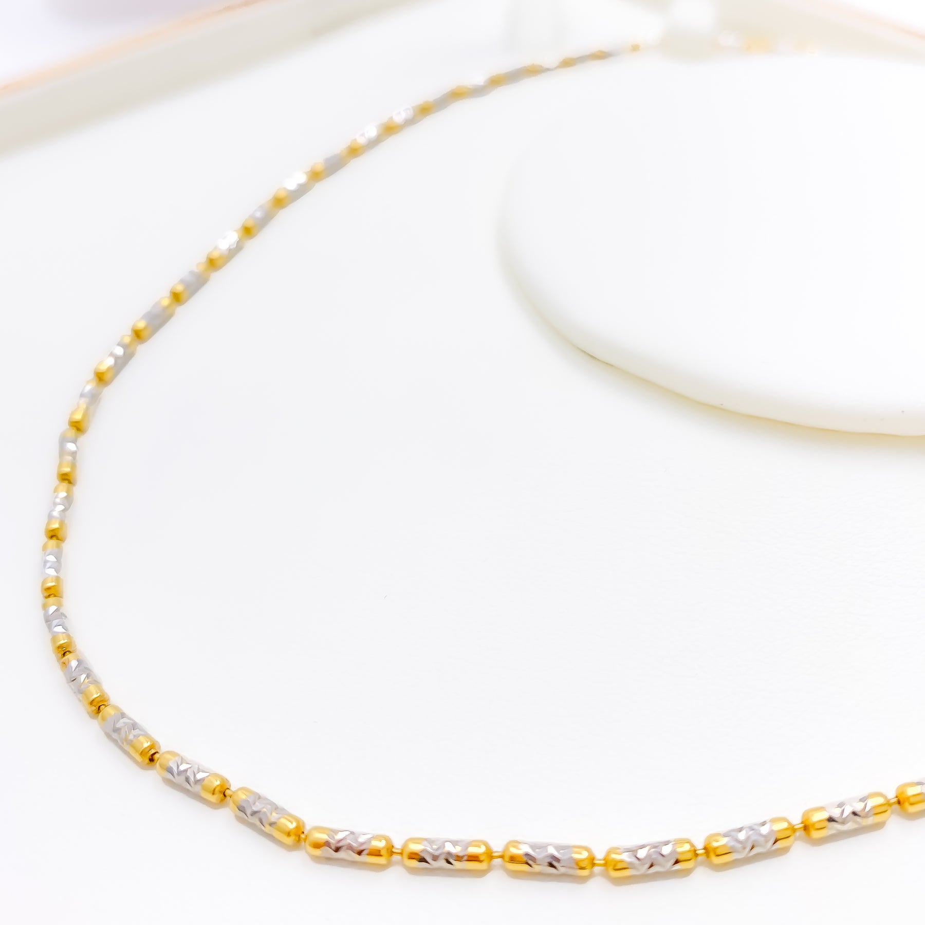 Designed with striking contrast, this 22k gold chain highlights elongated yellow and white gold barrel links that create a sleek, reflective pattern throughout its 16-inch silhouette. Weighing 8.9 grams, it balances substance with comfort, making it ideal for refined everyday styling or layering with statement pieces. Its 1.5mm width offers a noticeable yet polished presence that enhances the modern two-tone appeal. Completed with a secure lobster lock, this radiant chain adds sophistication and versatility to any collection.