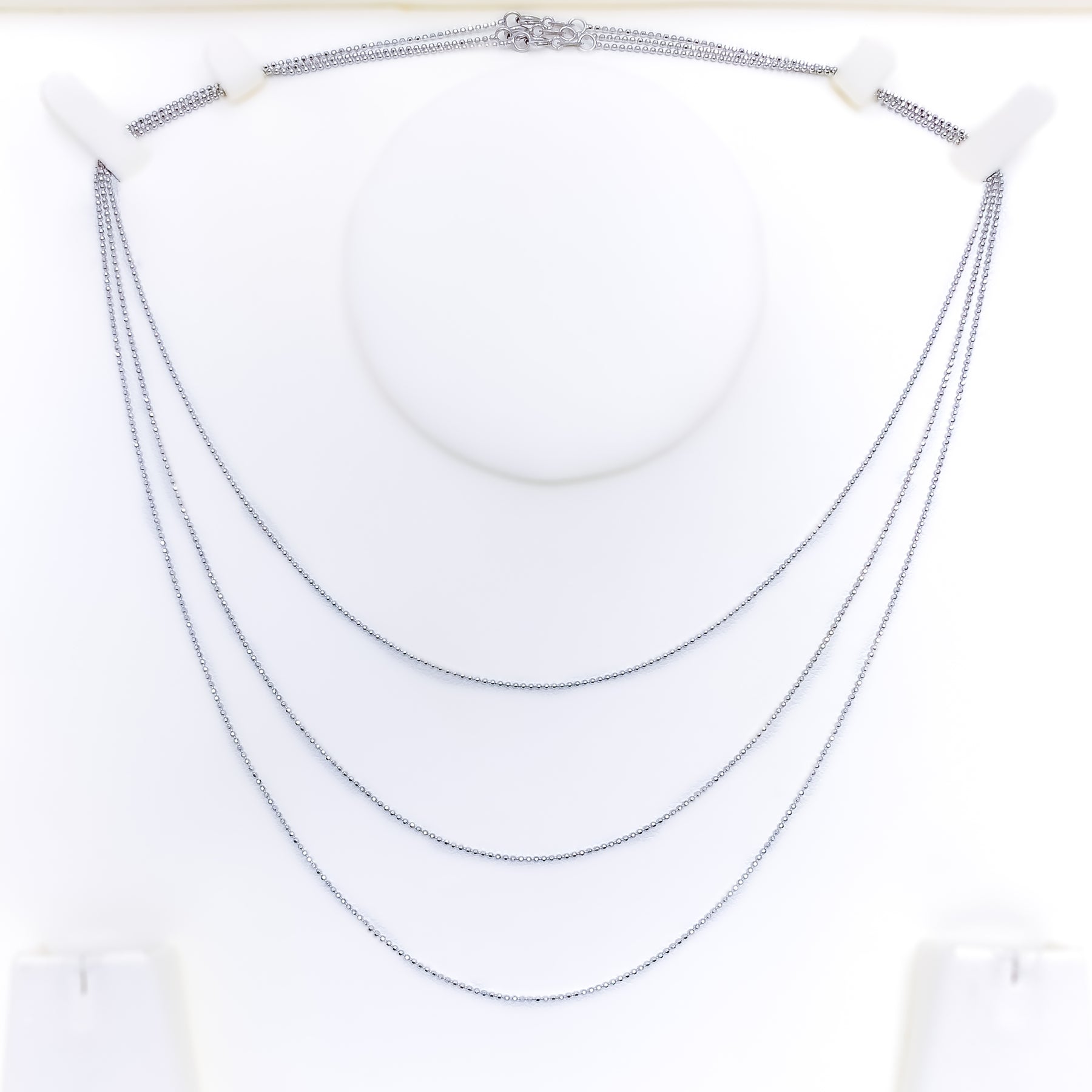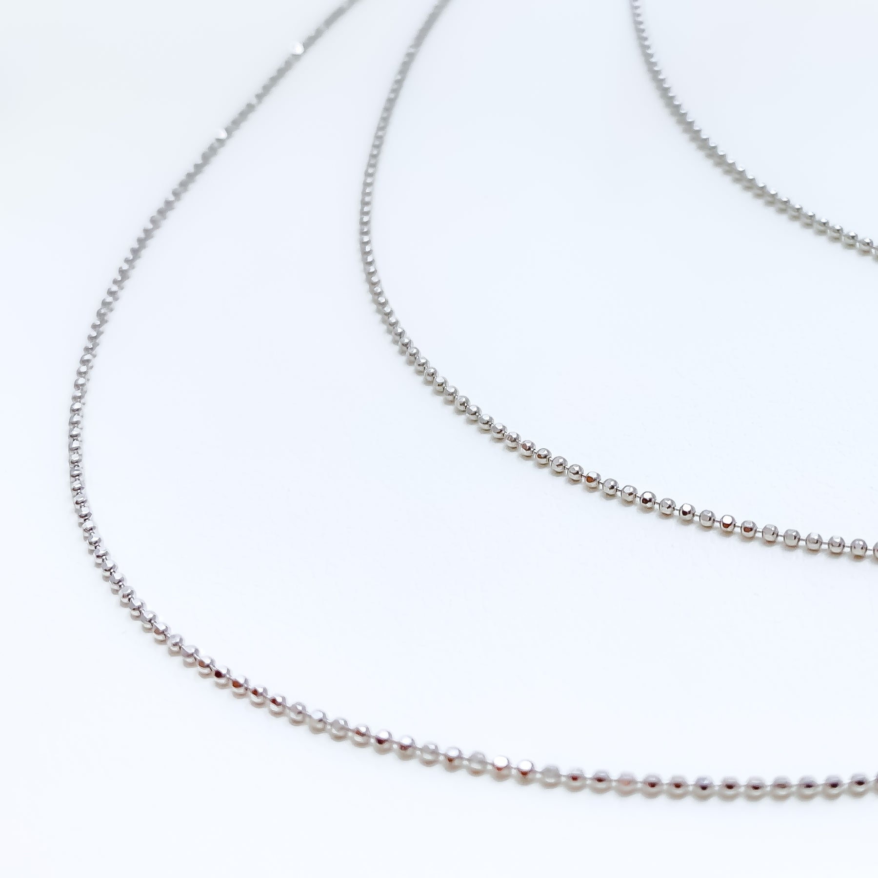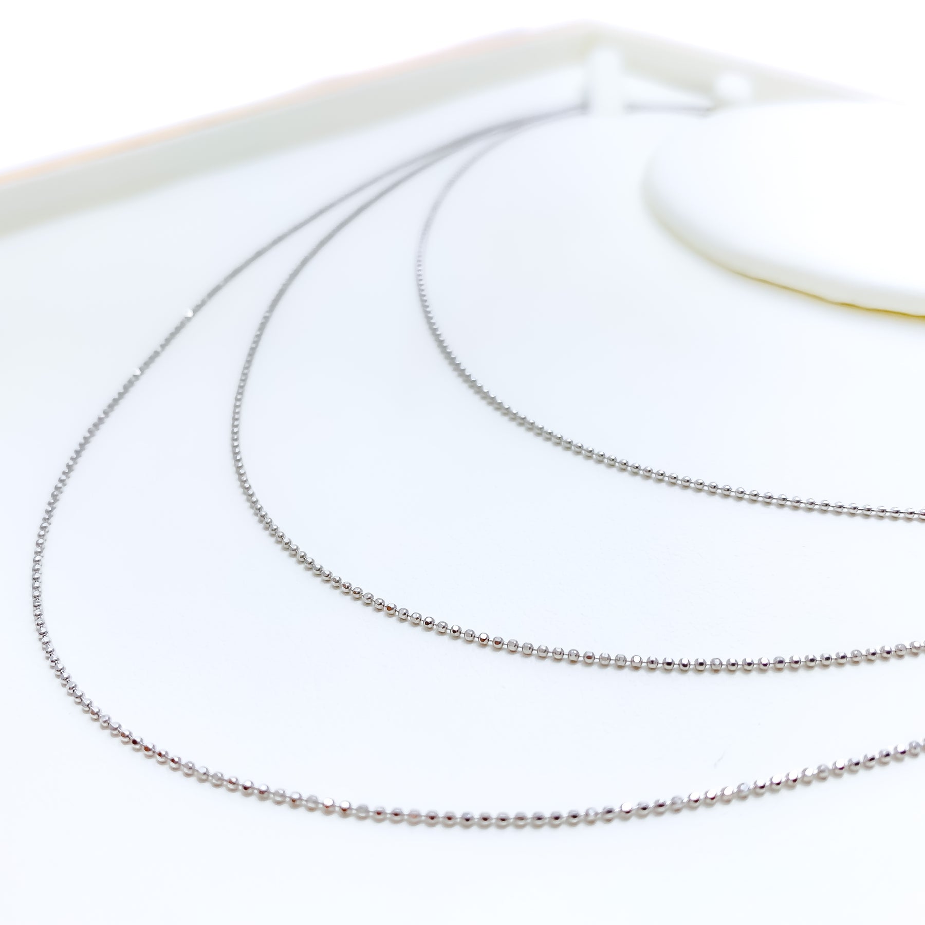 Delicately designed for everyday elegance, this 18k white gold bead chain adds a refined shimmer to any look. Weighing 1.8 grams with a slim 1mm width, its 16-inch length rests gracefully at the collarbone. The polished white gold finish brings a clean, modern glow to its minimal silhouette. Secured with a lobster ring lock, it’s perfect for layering or wearing solo with quiet sophistication.