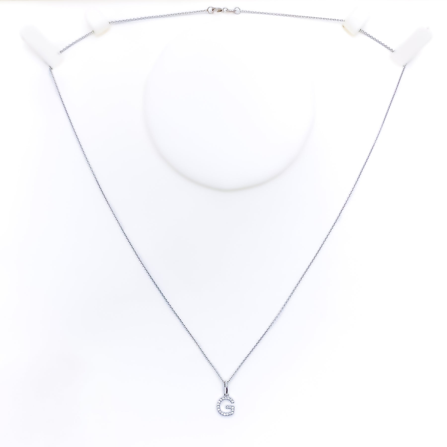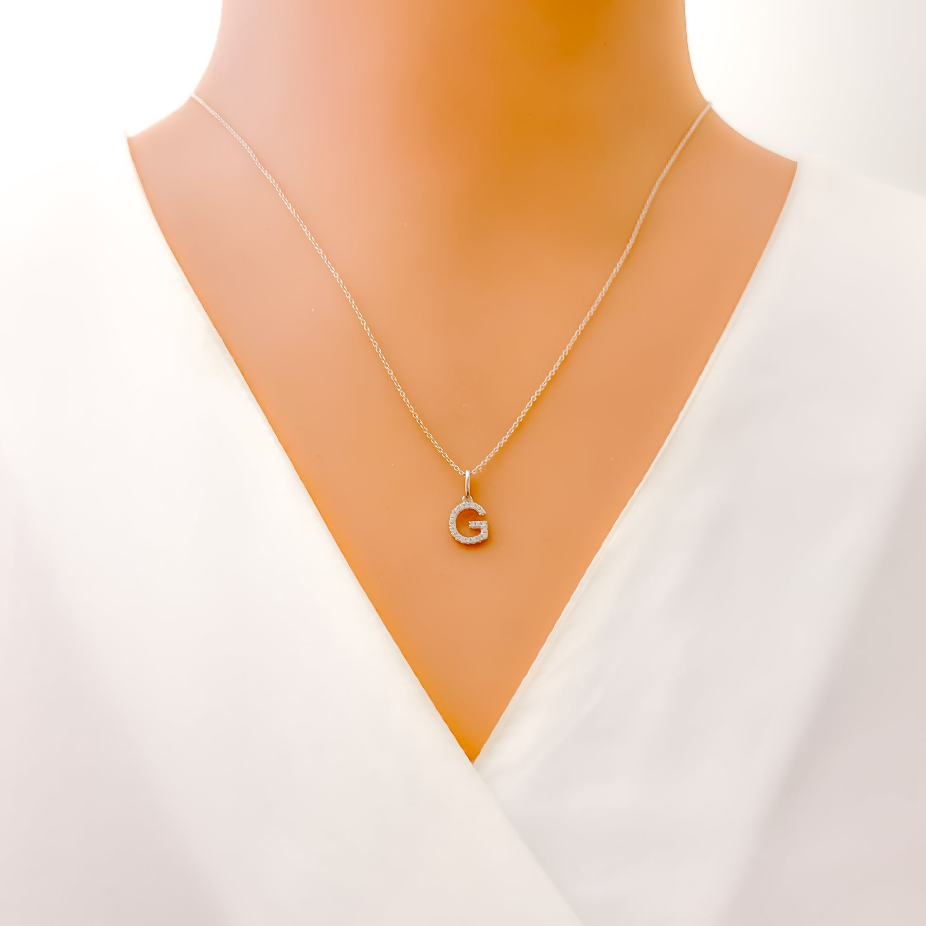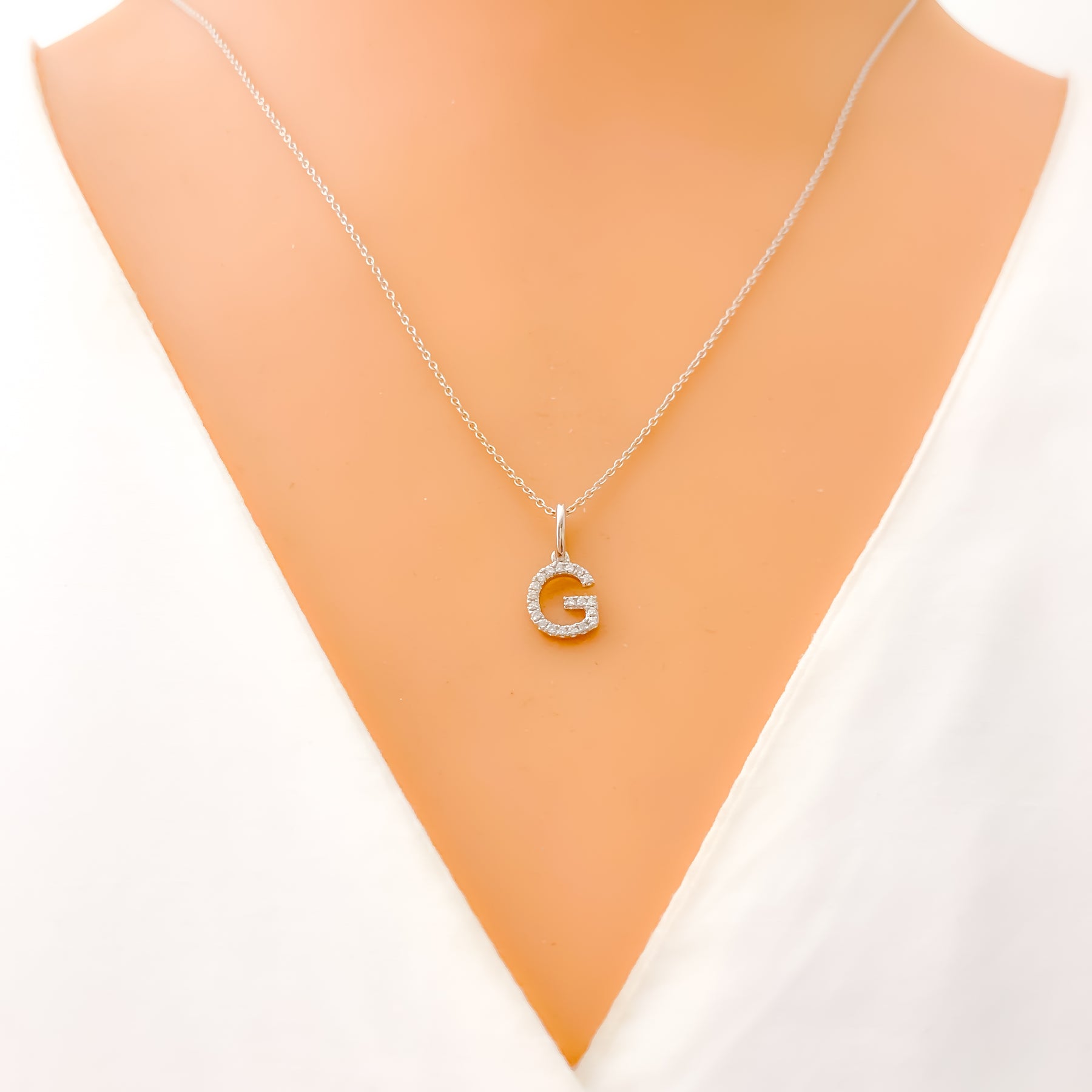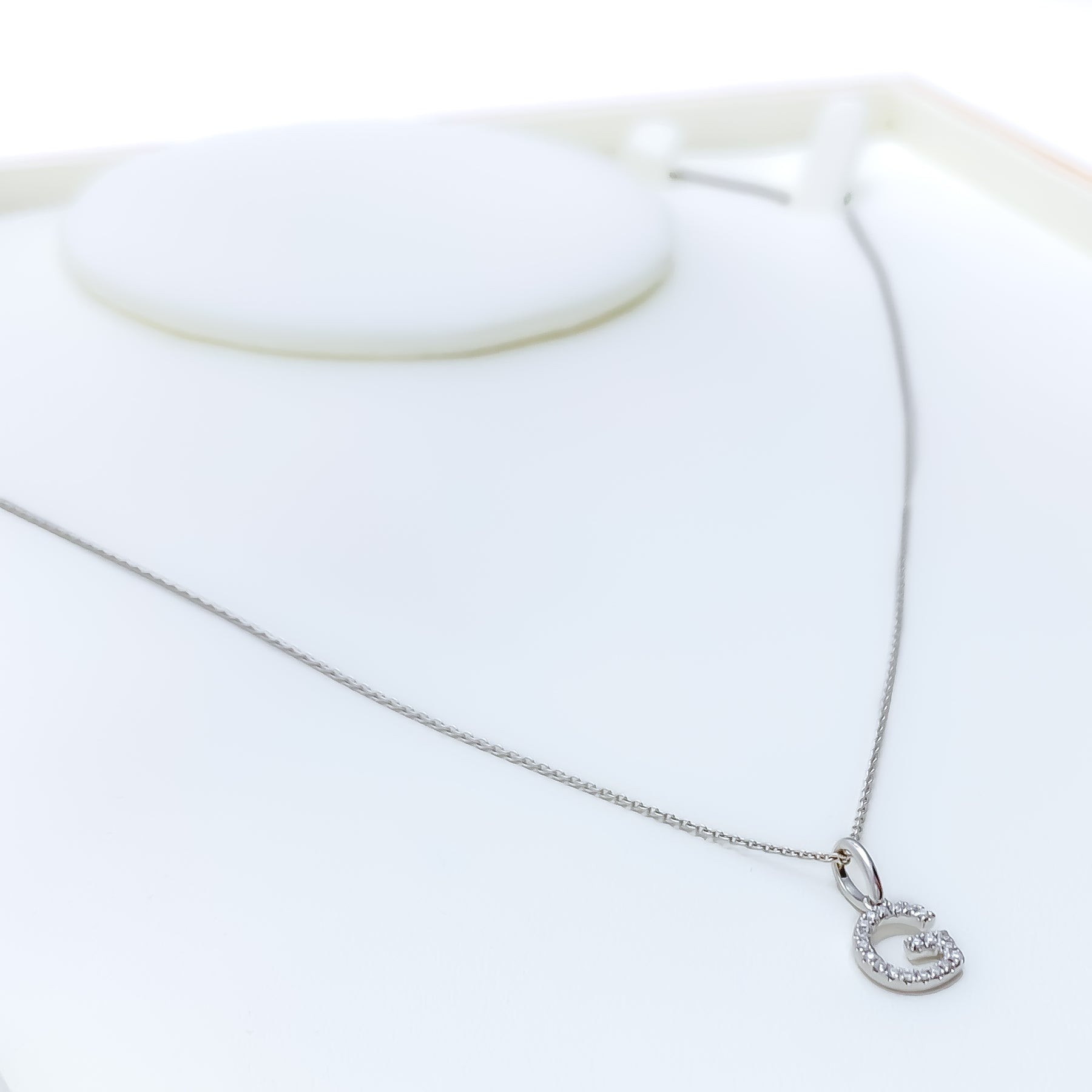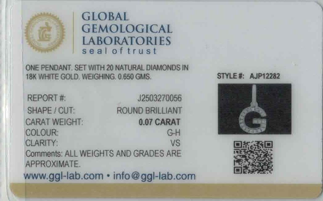 Sleek and radiant, this 18k white gold pendant showcases the letter G adorned with a 0.07ct VS-quality diamond for refined sparkle. Weighing 0.65 grams and measuring 0.6 inches in length, it offers a clean, modern look with a personalized touch. The bright white finish enhances the brilliance of the diamond accent. Chain not included, and it comes GGL certified for assured authenticity and quality.