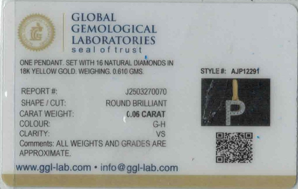 Thoughtfully crafted in 18k yellow gold, this pendant features the letter P adorned with a sparkling 0.06ct VS-quality diamond. Weighing 0.61 grams and measuring 0.6 inches in length, it delivers a refined balance of elegance and personal charm. The polished finish enhances its radiant appeal. Chain not included, and it comes GGL certified for assured authenticity and lasting quality.