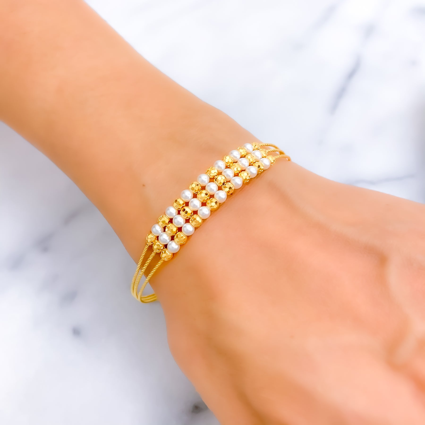 Dazzling Triple Lined 22k Gold Flexi Bangle Bracelet W/Pearl