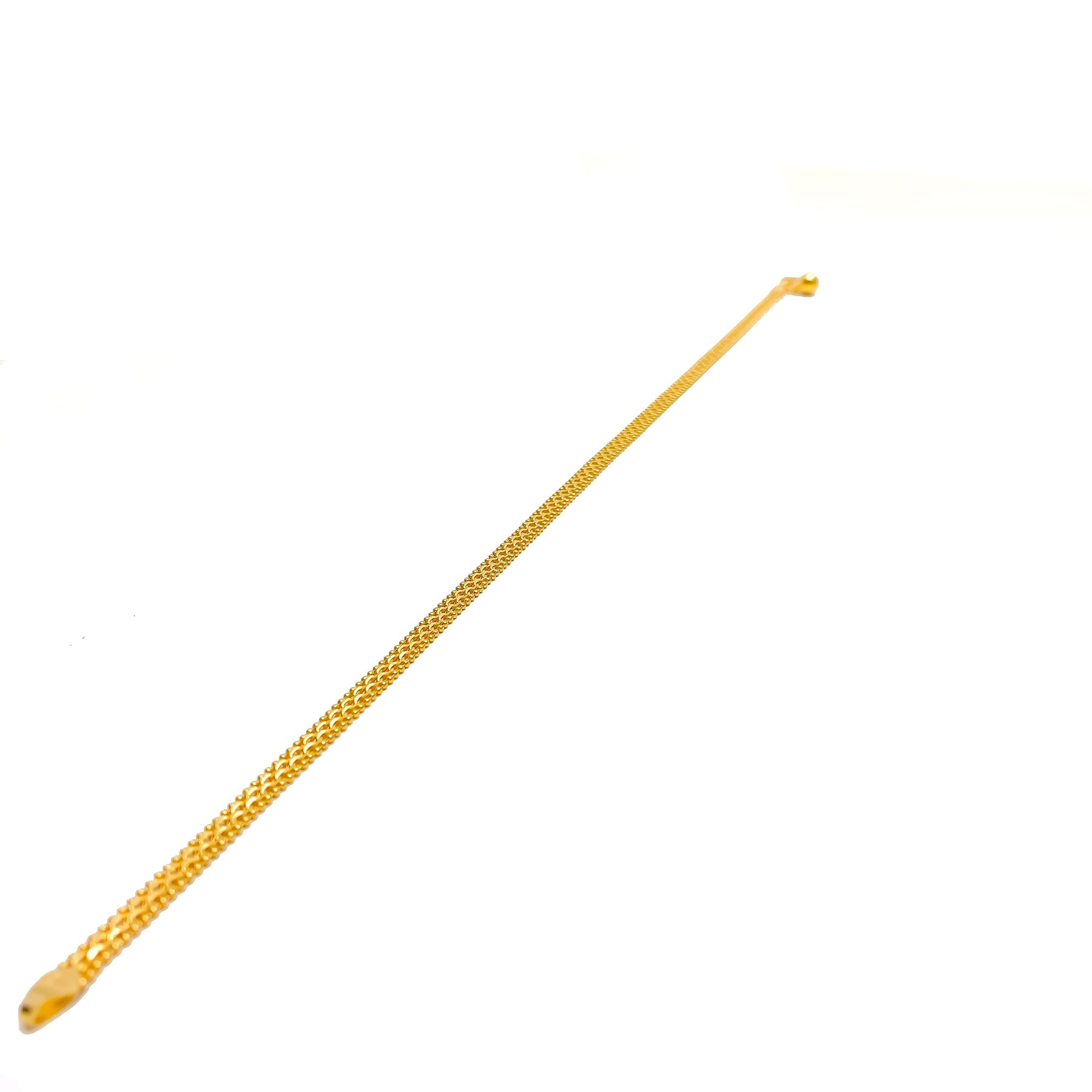 Expressed with graceful refinement, this 22k gold anklet presents a polished 6.6-gram profile that lies elegantly along its smooth 9.8-inch length. Its warm yellow-gold finish enriches each delicate link with radiant depth and timeless charm. The tasteful structure offers a balanced blend of dressy sophistication and everyday versatility suited for many looks. Completed with a secure lobster lock, it brings a precious touch of golden elegance to any elevated ensemble.