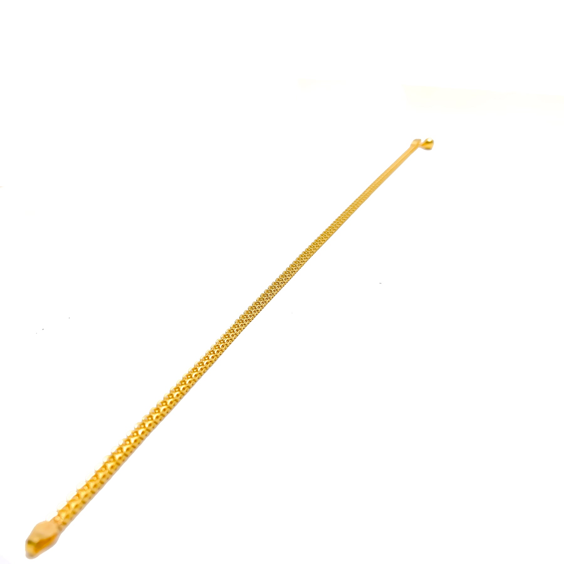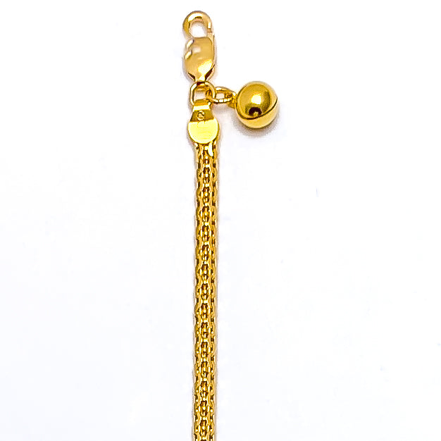 Defined with polished finesse, this 22k gold anklet features a smooth 10.2-gram profile that flows elegantly along its refined 11-inch length. Its warm yellow-gold finish enhances each link with radiant depth and a glossy, timeless appeal. The streamlined design offers a versatile blend of everyday comfort and elevated sophistication suited for many styles. Secured with a reliable lobster lock, it delivers a sleek touch of golden brilliance to any ensemble.