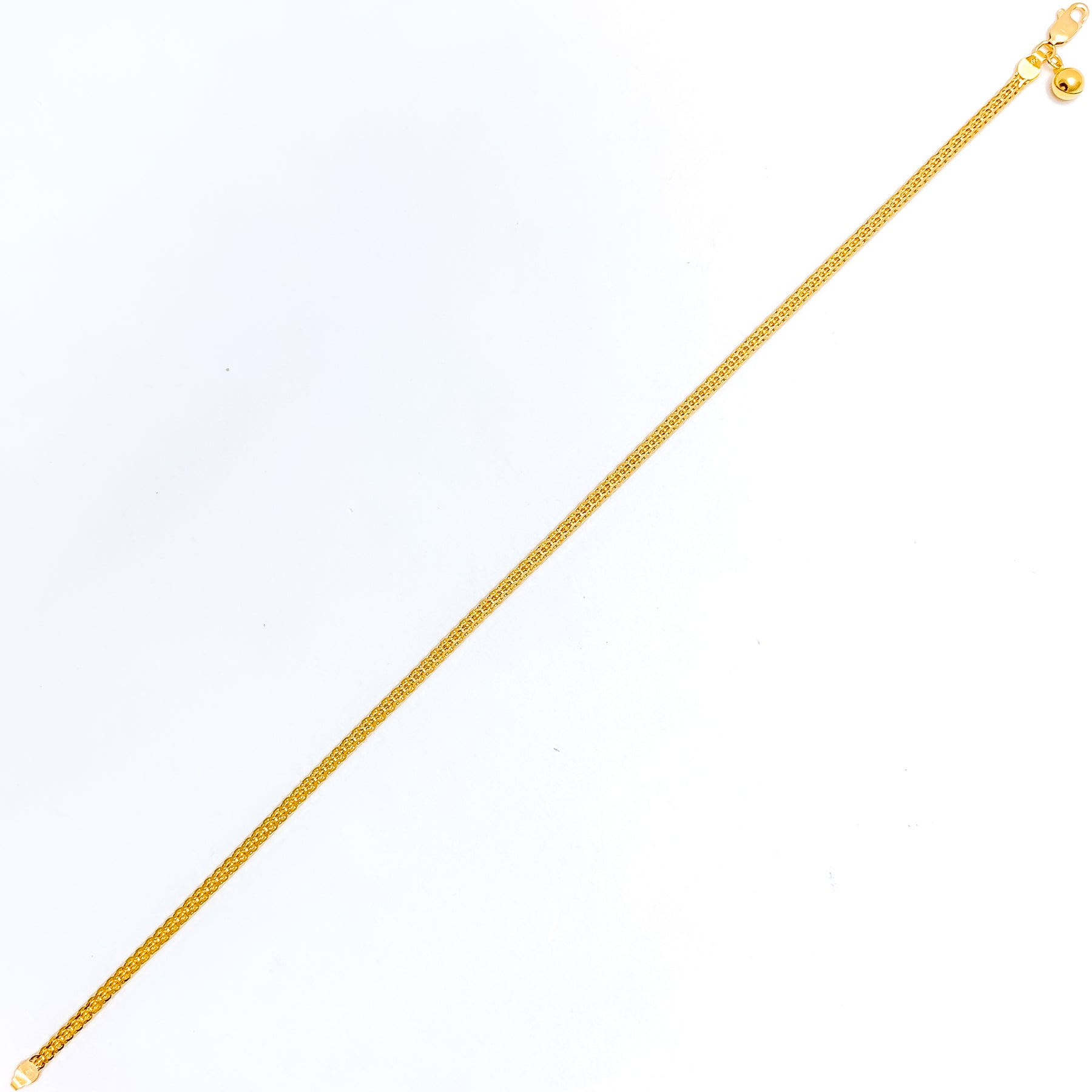 Composed with refined detail, this 22k gold anklet highlights a polished 10.3-gram profile that drapes smoothly along its elegant 10.9-inch length. Its warm yellow-gold finish enhances each textured link with radiant depth and a beautifully defined shimmer. The graceful structure offers a balanced blend of fine sophistication and everyday versatility suited for many styles. Secured with a dependable lobster lock, it brings a distinguished touch of golden refinement to any thoughtfully curated ensemble.