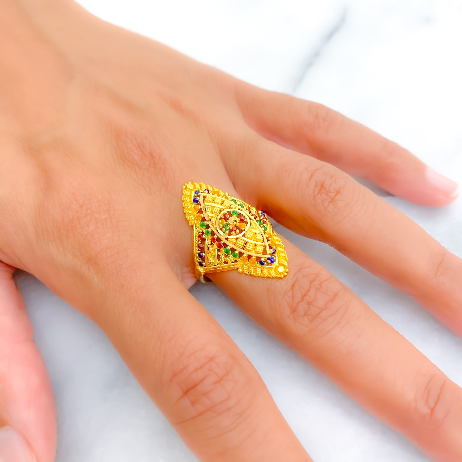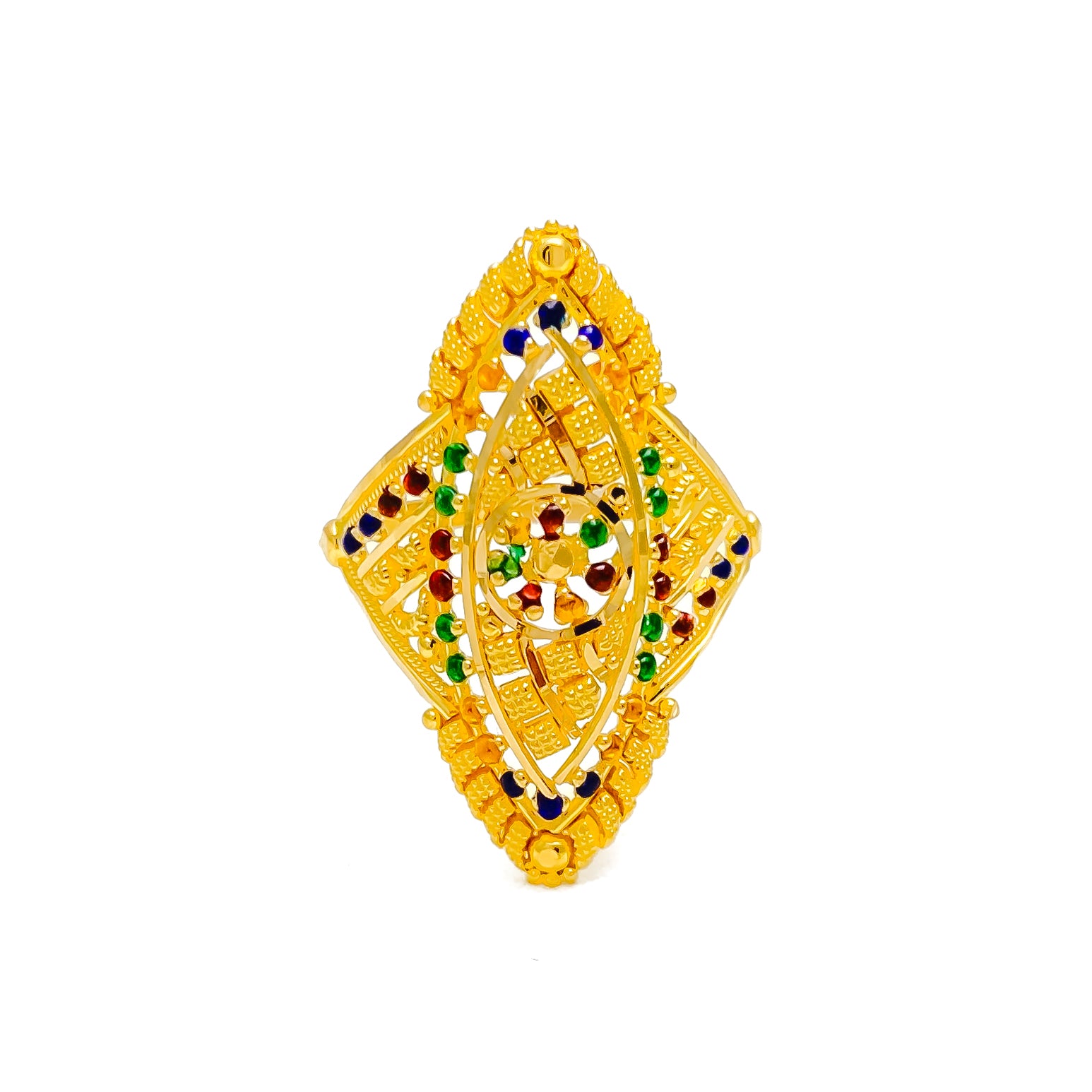 Expertly crafted in 22k yellow gold and weighing 4.3 grams, this ring features a sophisticated design accented with vibrant details for a colorful touch. With a ring size of 7.5, it ensures a comfortable fit, and the option for ring sizing offers a tailored experience. The radiant yellow gold finish highlights its fine elegance, making it a perfect accessory for both everyday wear and special occasions.
