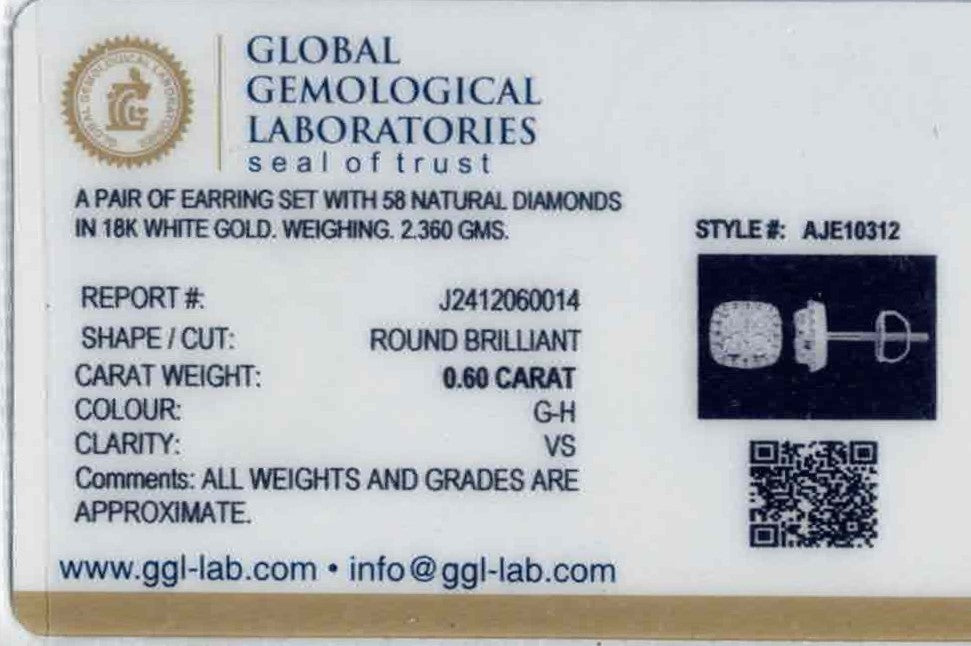 Boldly sculpted, these 18k white gold diamond earrings weigh 2.36 grams and feature round brilliant cut diamonds totaling 0.60 carats in G–H color with VS clarity, finished with a refined polished glow. Designed as elegant tops, the cushioned silhouette presents a balanced 0.3-inch diameter that delivers striking sparkle with modern depth. Secure screw-back posts ensure comfortable, confident wear while maintaining a sleek, structured profile. GGL certified and impeccably crafted, these earrings offer enduring luxury ideal for statement occasions and elevated everyday wear.