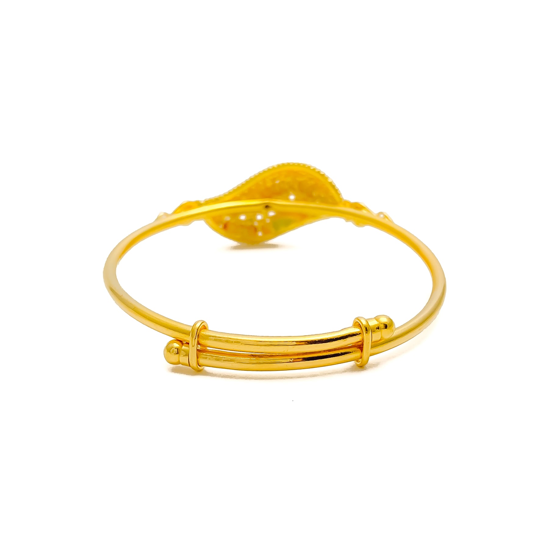 Delicately fashioned in warm 22k yellow gold, this charming baby bangle features a refined, polished finish and a comfortable 1.75" diameter. Weighing 6.8 grams, its adjustable design ensures a secure yet flexible fit. A graceful blend of tradition and timeless elegance.