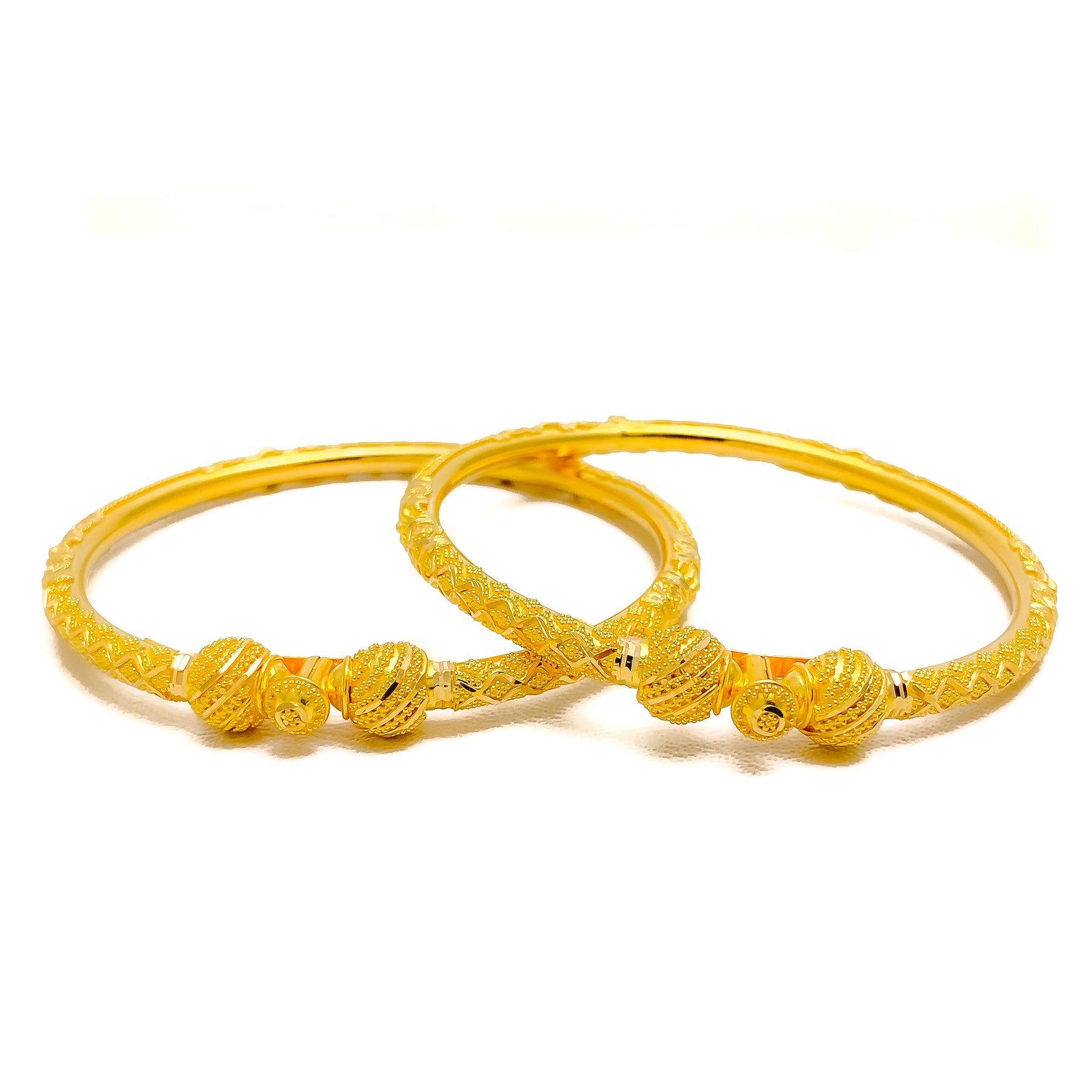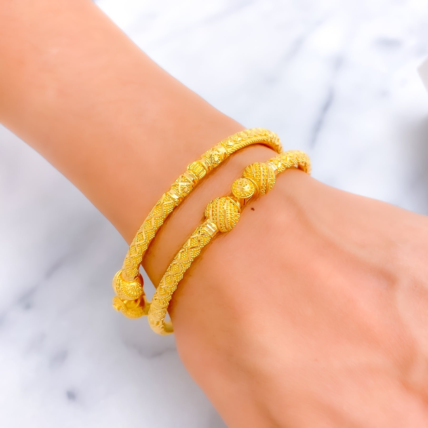 Infused with refined radiance, these 22k gold pipe bangles showcase a graceful 32.0-gram profile shaped into smooth, balanced forms that evoke a blooming, elegant presence. Their warm yellow-gold finish enriches the classic 2.6 size with luminous depth and polished brilliance, while the 2.35-inch opening ensures a comfortable, secure fit. The paired structure offers a harmonious blend of sophisticated beauty and timeless versatility suited for many elevated styles. Perfect for adding an exquisite touch of golden flourish to any thoughtfully curated collection.