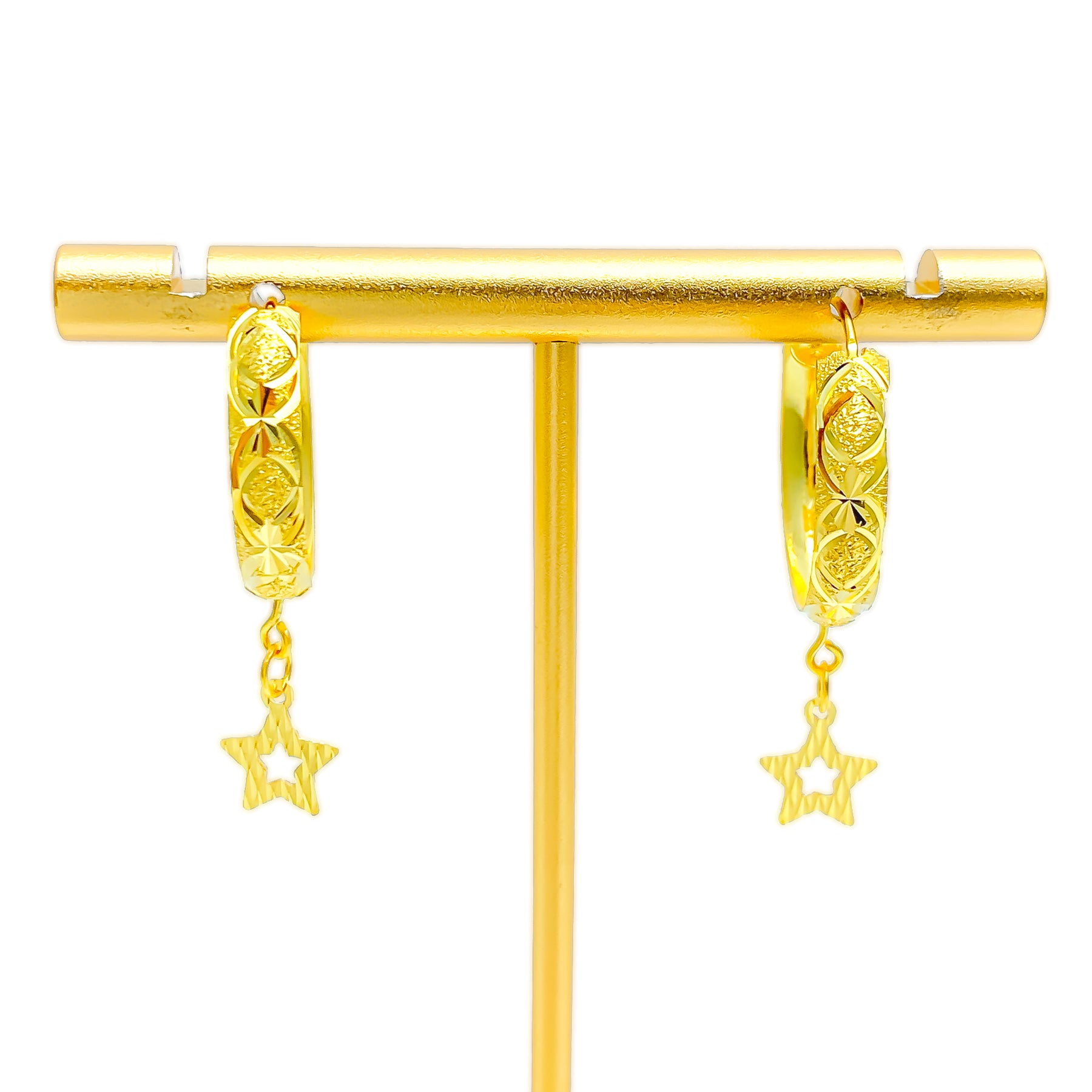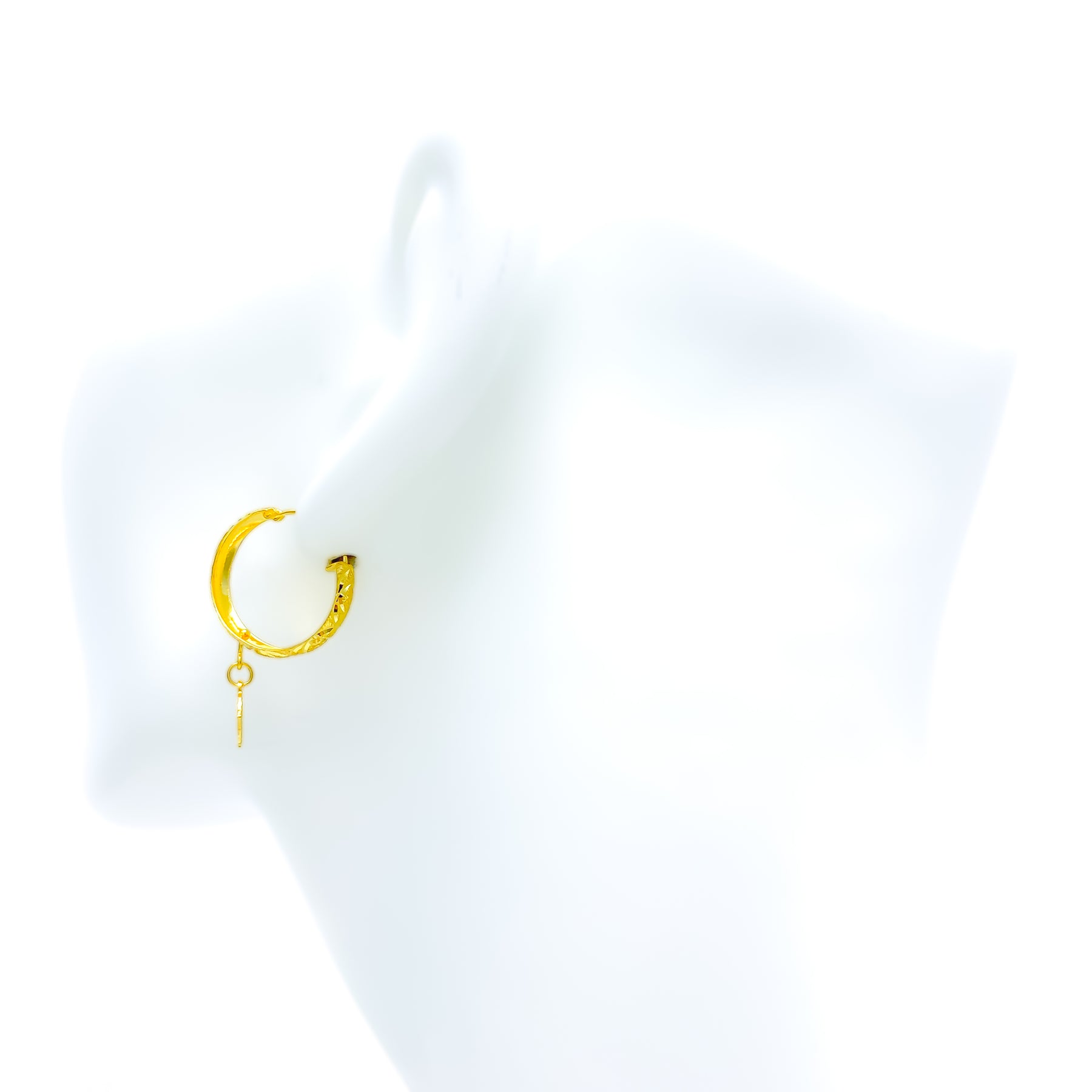 Radiating a modern allure, these 22k gold hoops embody fashion-forward elegance with a timeless twist. Weighing 3.2 grams and featuring a 0.8-inch diameter with a 1.3-inch length, they strike a perfect balance of style and sophistication. The rich yellow gold finish enhances their luminous appeal, ideal for both chic and classic looks.