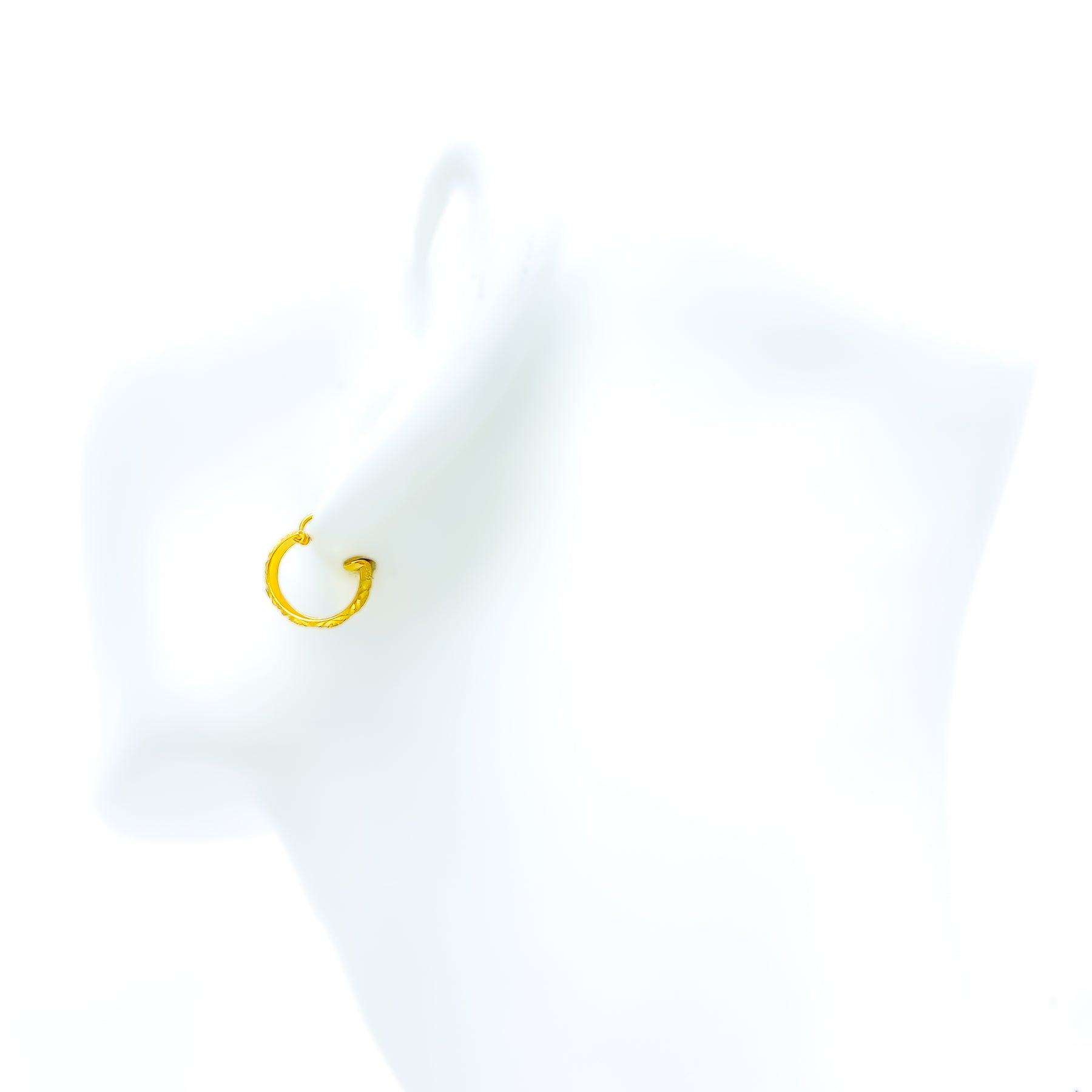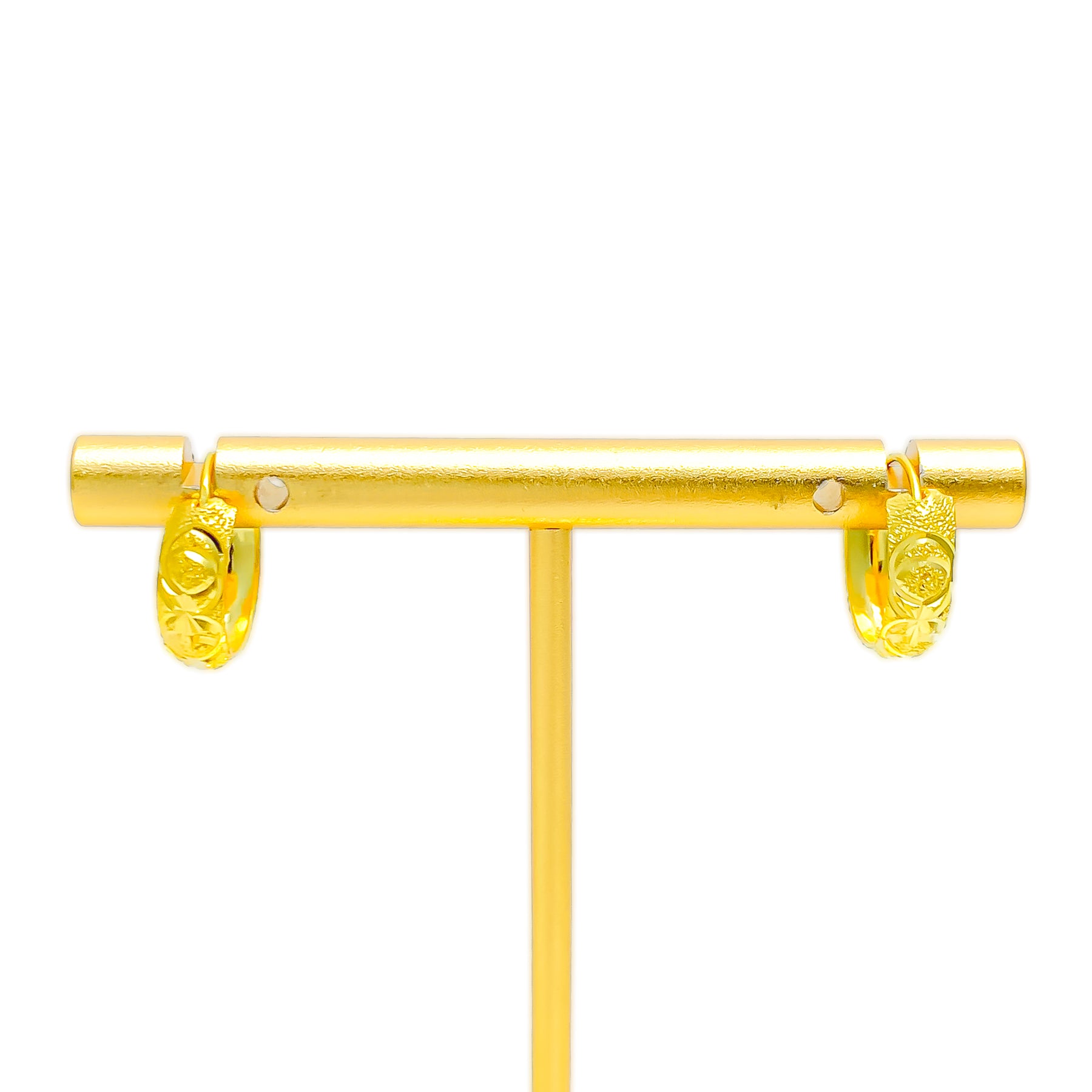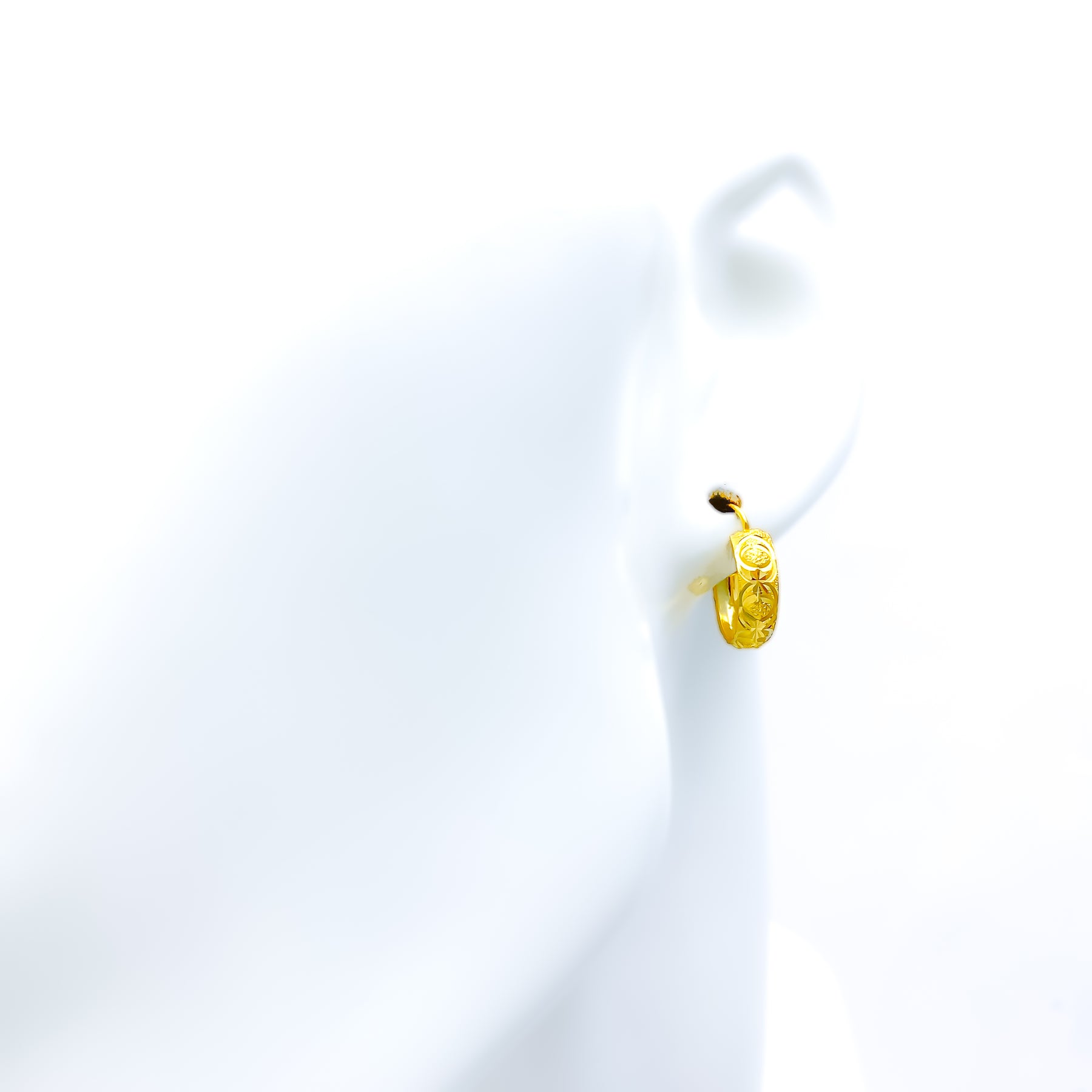Intricately refined, this 22k yellow gold Bali earring weighs 1.8 grams and features an engraved polished finish that enhances its opulent hoop styling with elegant texture. Designed in a classic Bali silhouette, it presents a compact 0.5-inch diameter that delivers subtle shine with a lightweight feel. The smooth hoop construction ensures comfortable wear while maintaining a clean, graceful profile throughout the day. Distinctive yet timeless, this piece offers sophisticated charm ideal for everyday elegance and polished styling.