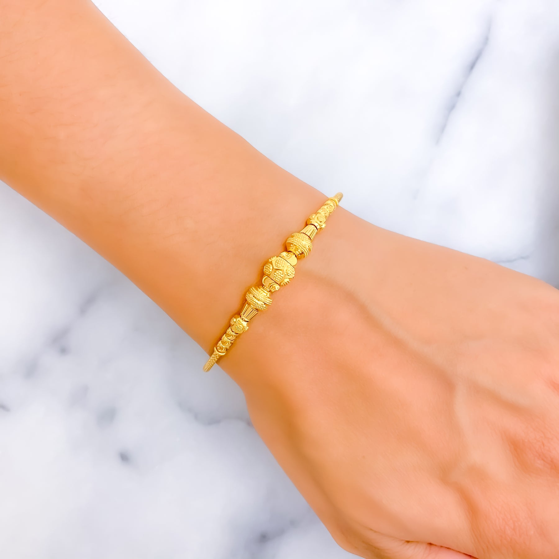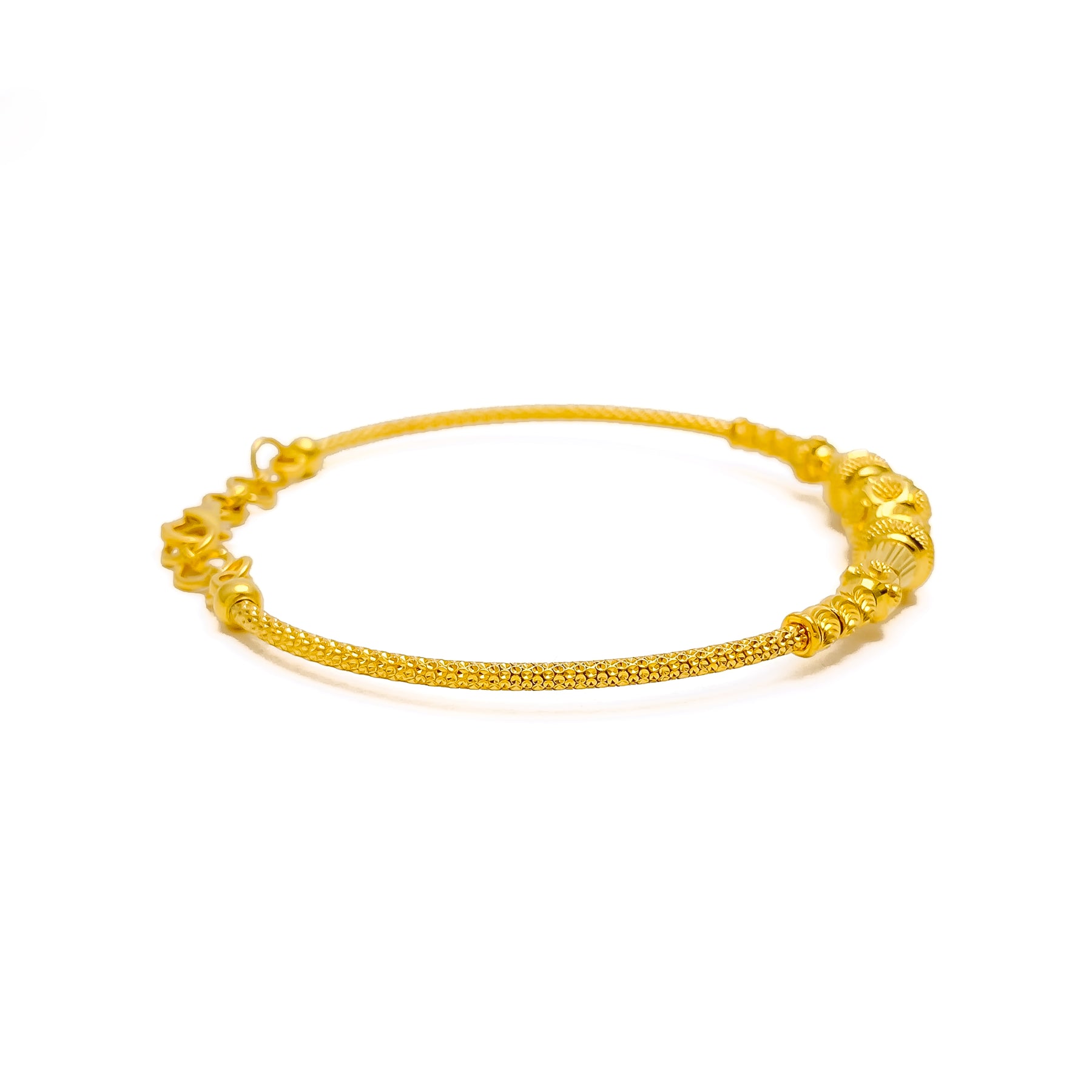 A graceful expression of heritage charm, this bangle radiates warmth in luxurious 22k yellow gold. Its polished round 2.3" design offers a timeless silhouette, while the subtle detailing adds understated elegance. Adjustable links ensure a comfortable fit. Fastened with a secure lobster lock, it’s destined to be treasured.