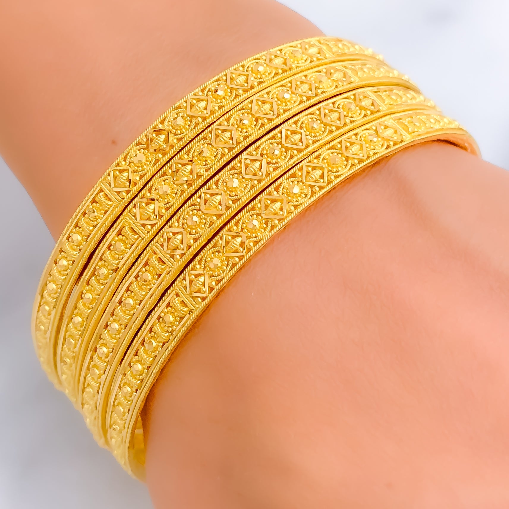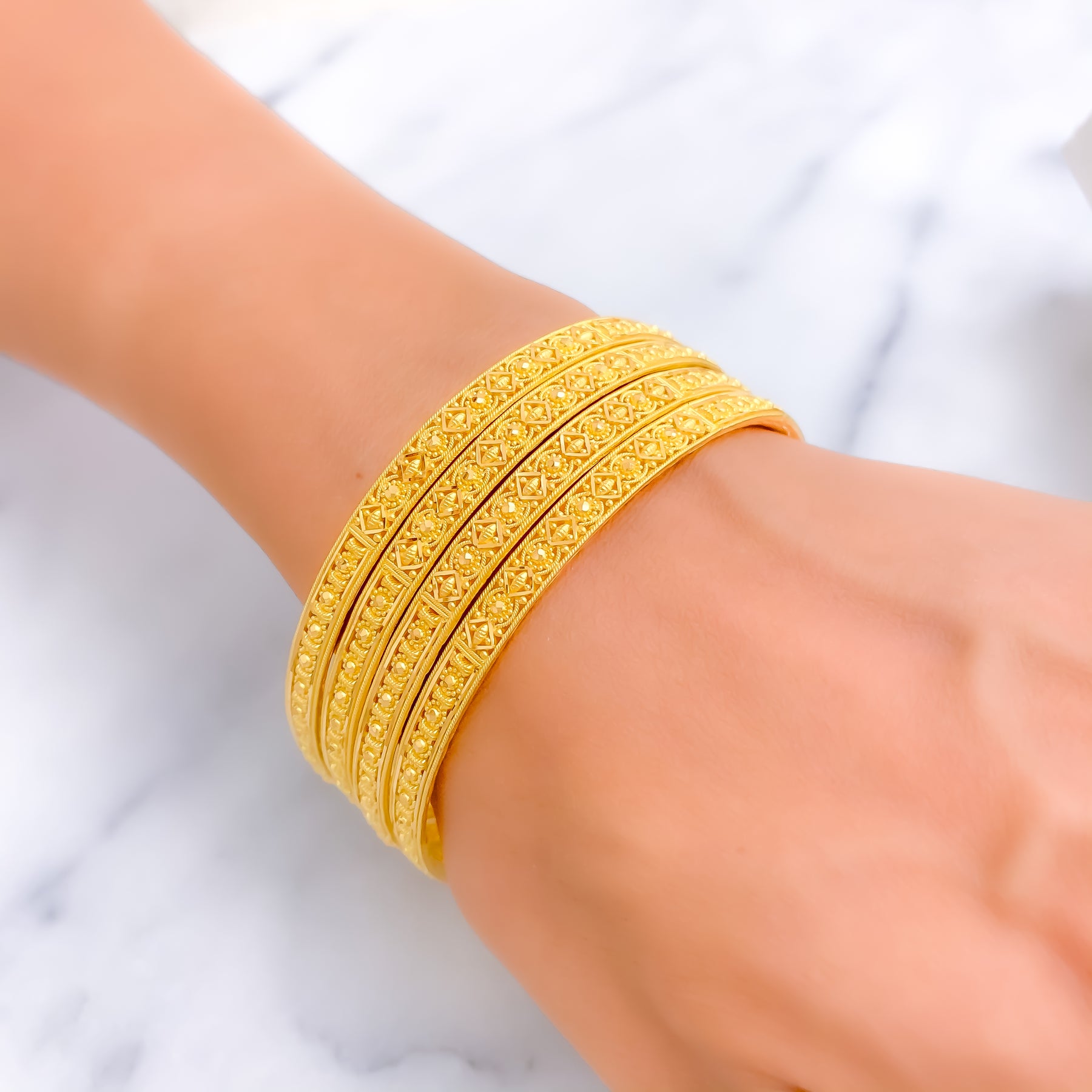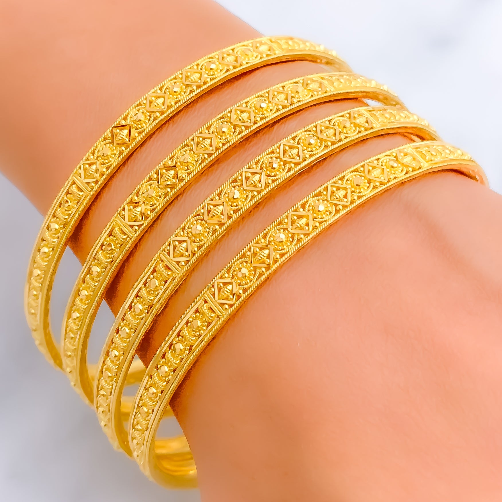 This luxurious 22k yellow gold set, weighing 49.6 grams, features four traditional bangles that radiate elegant sophistication. Crafted in a 2.7 size with a 2.45" opening, they embody timeless charm and cultural grace. The polished finish enhances their golden brilliance, offering enduring allure. A refined four-piece collection that beautifully blends classic tradition with dressy elegance, perfect for both festive occasions and daily sophistication.
