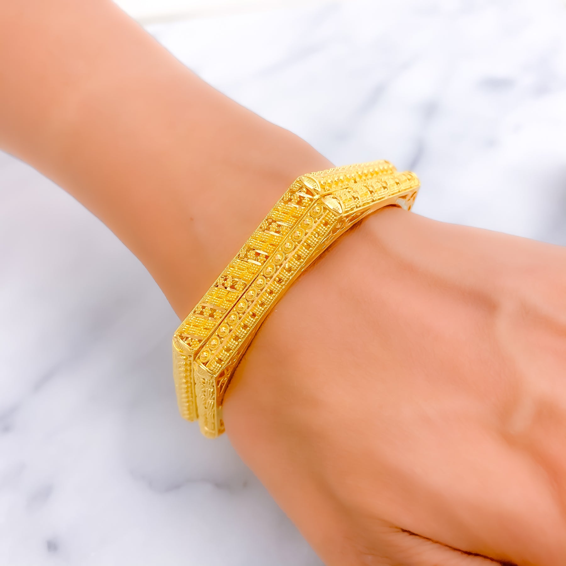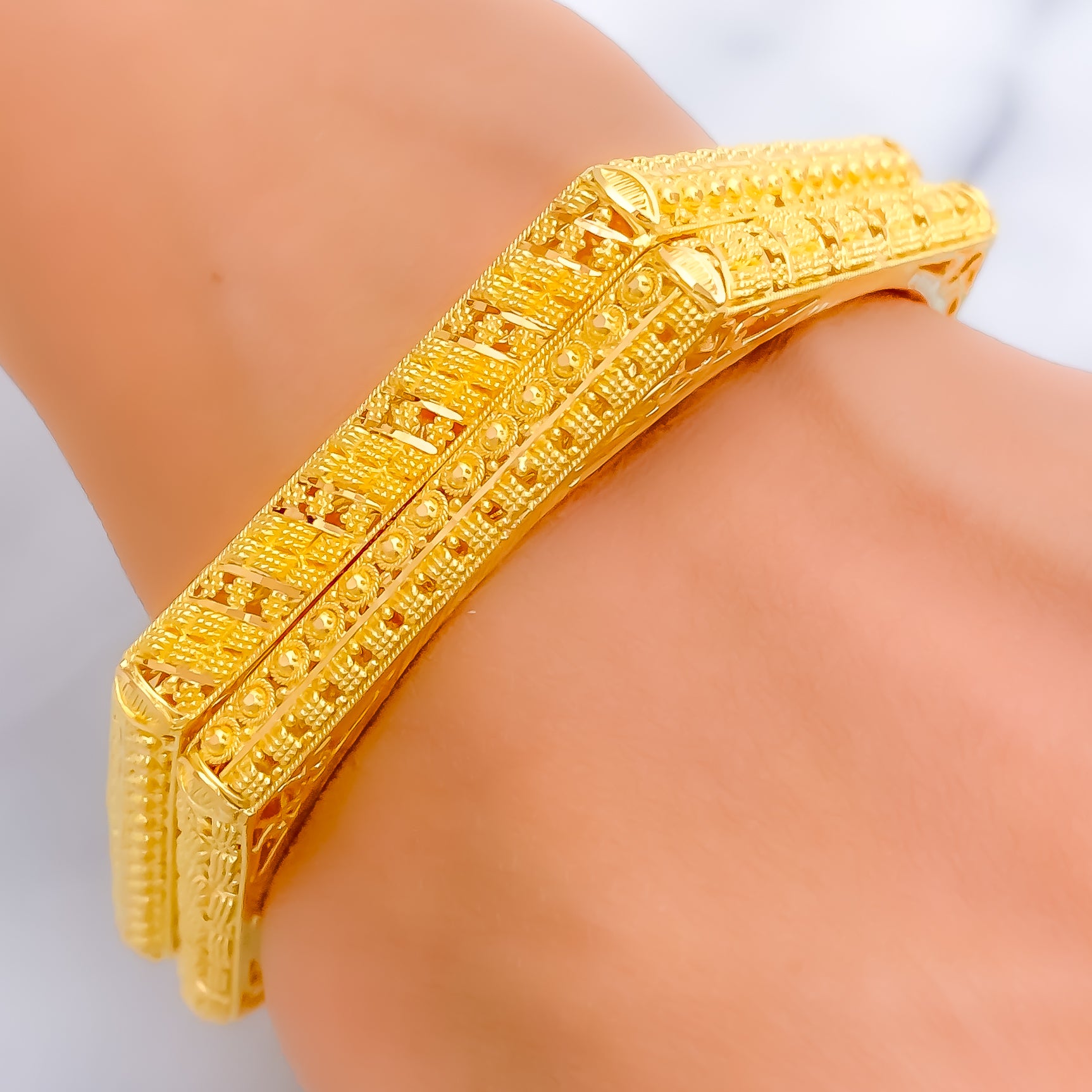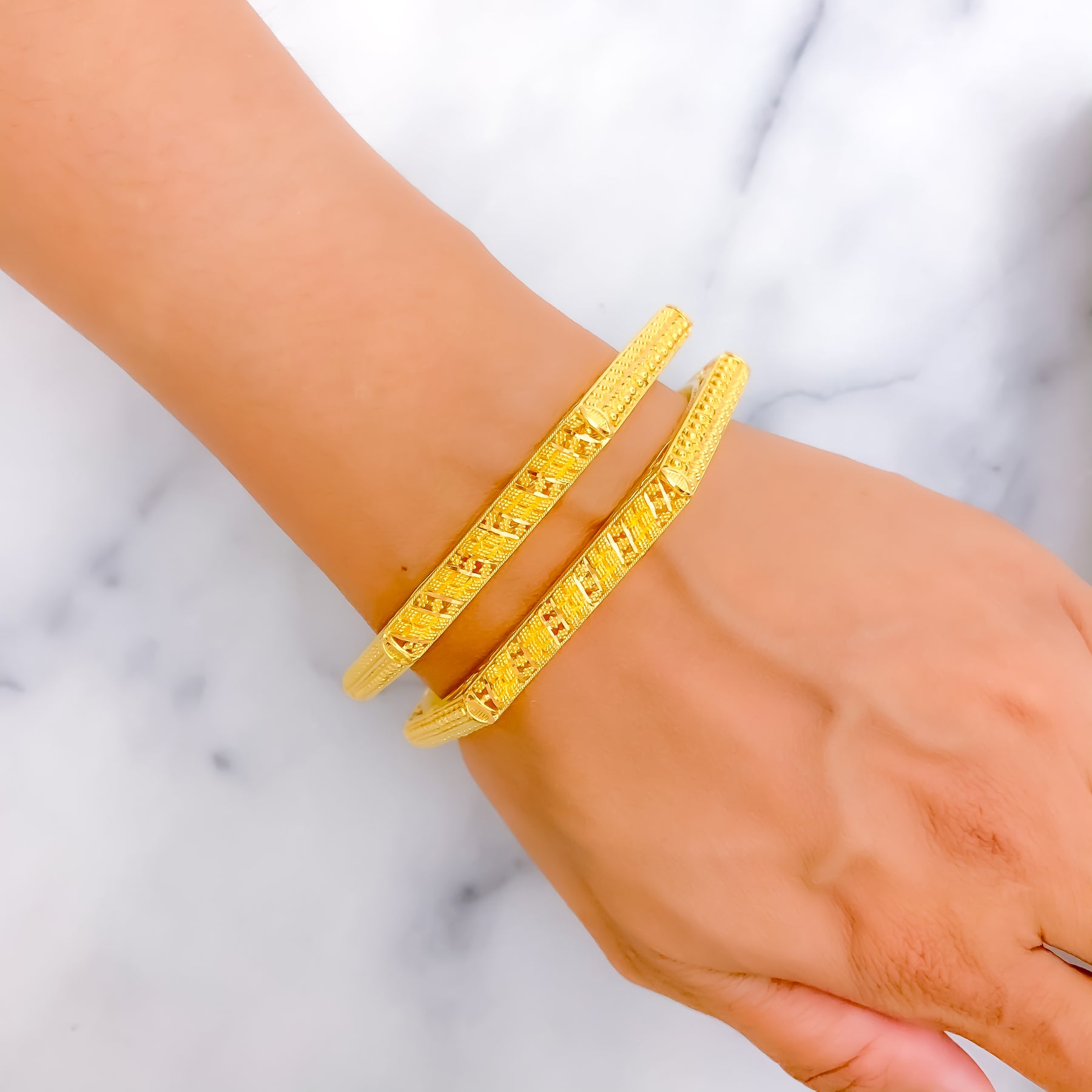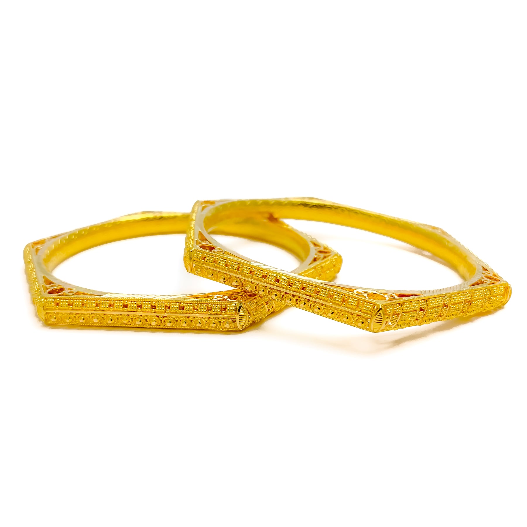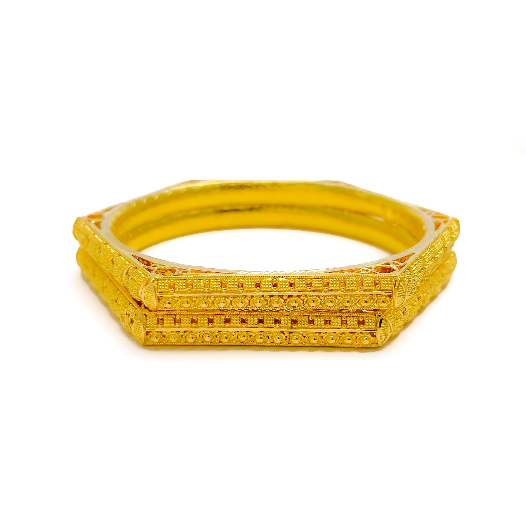 Crafted with intricate detail, this distinctive 22k gold bangle pair blends rich artistry with enduring charm. Weighing 35.0 grams and measuring 2.35" in diameter, the solid, non-openable design ensures a secure fit and timeless appeal. An opulent statement for refined tastes.
