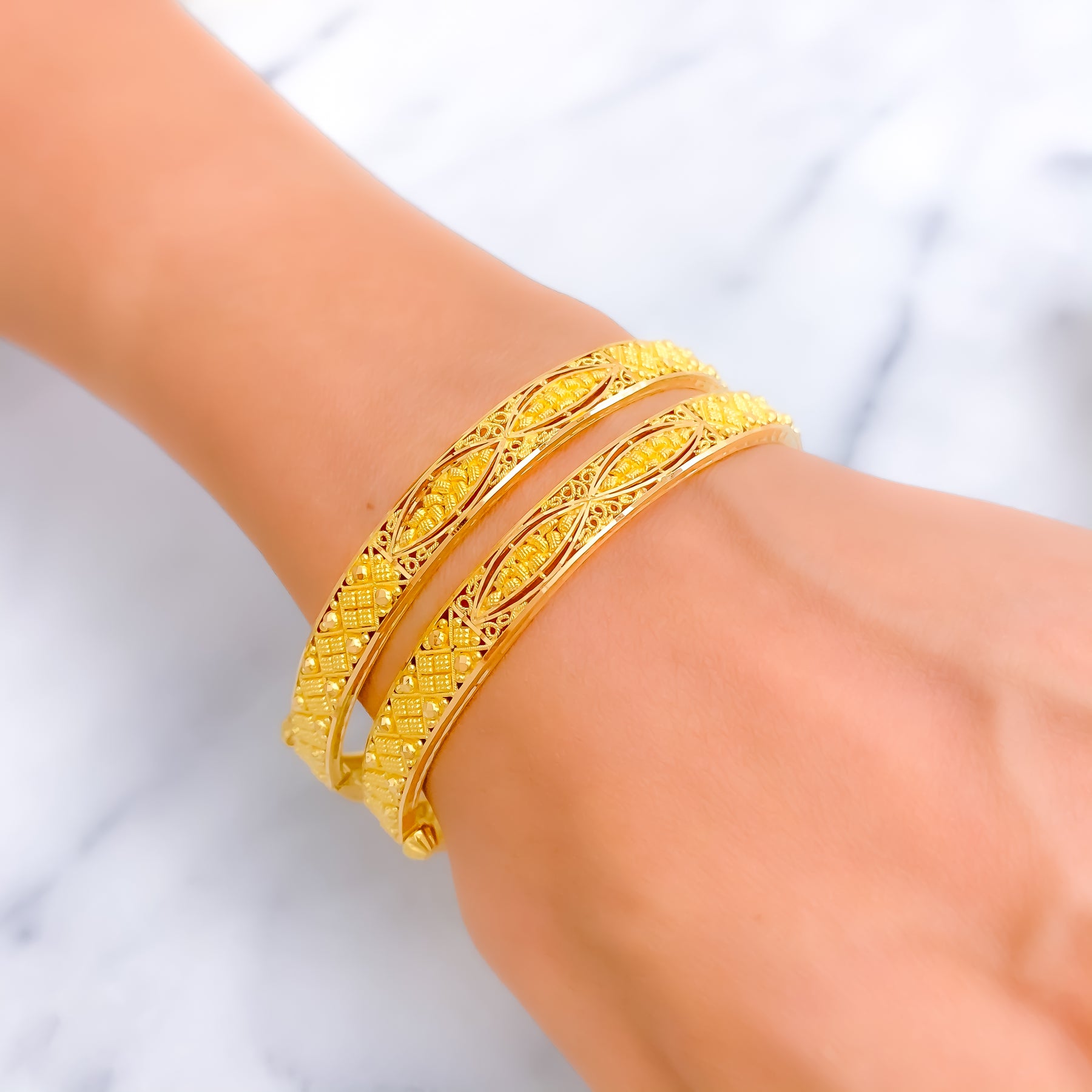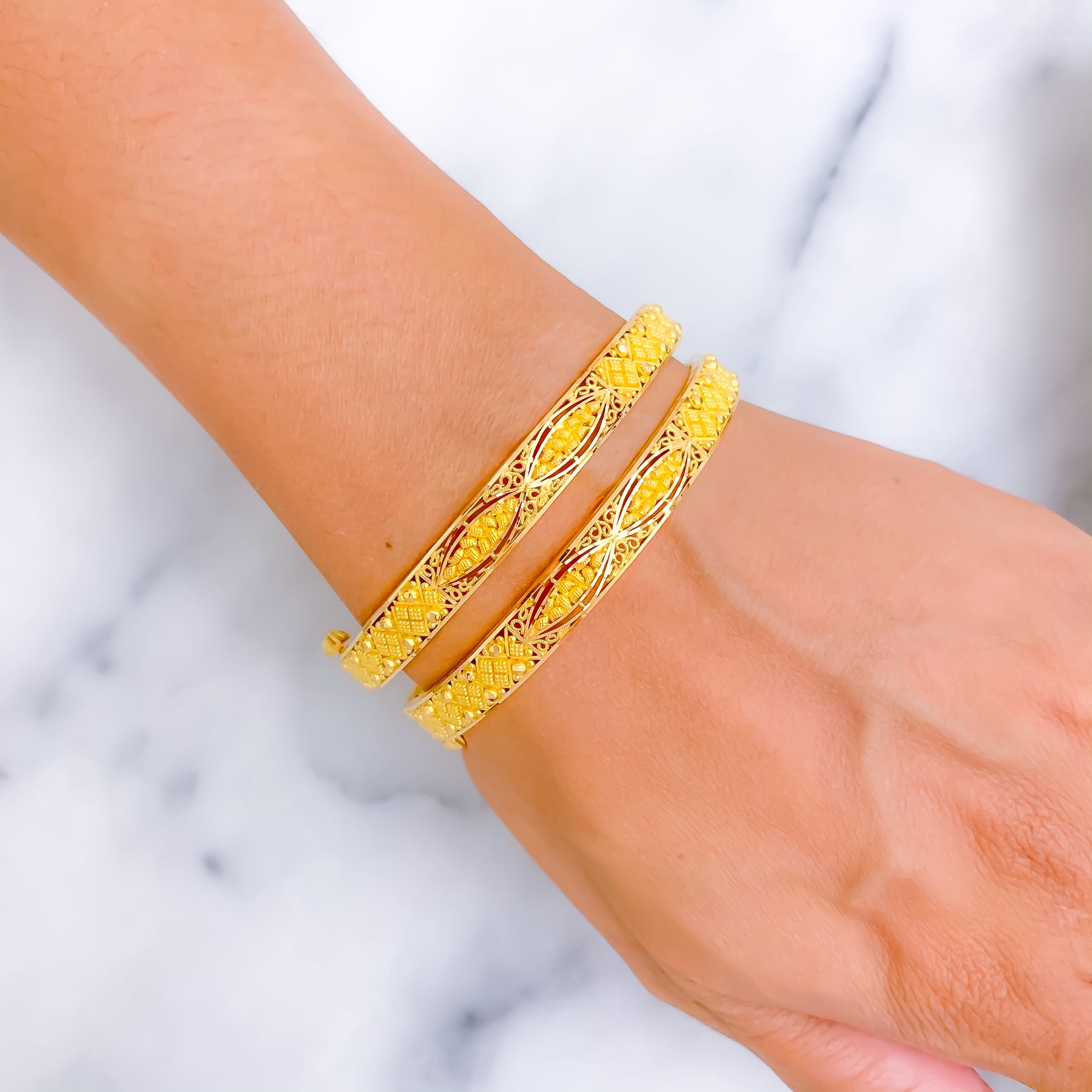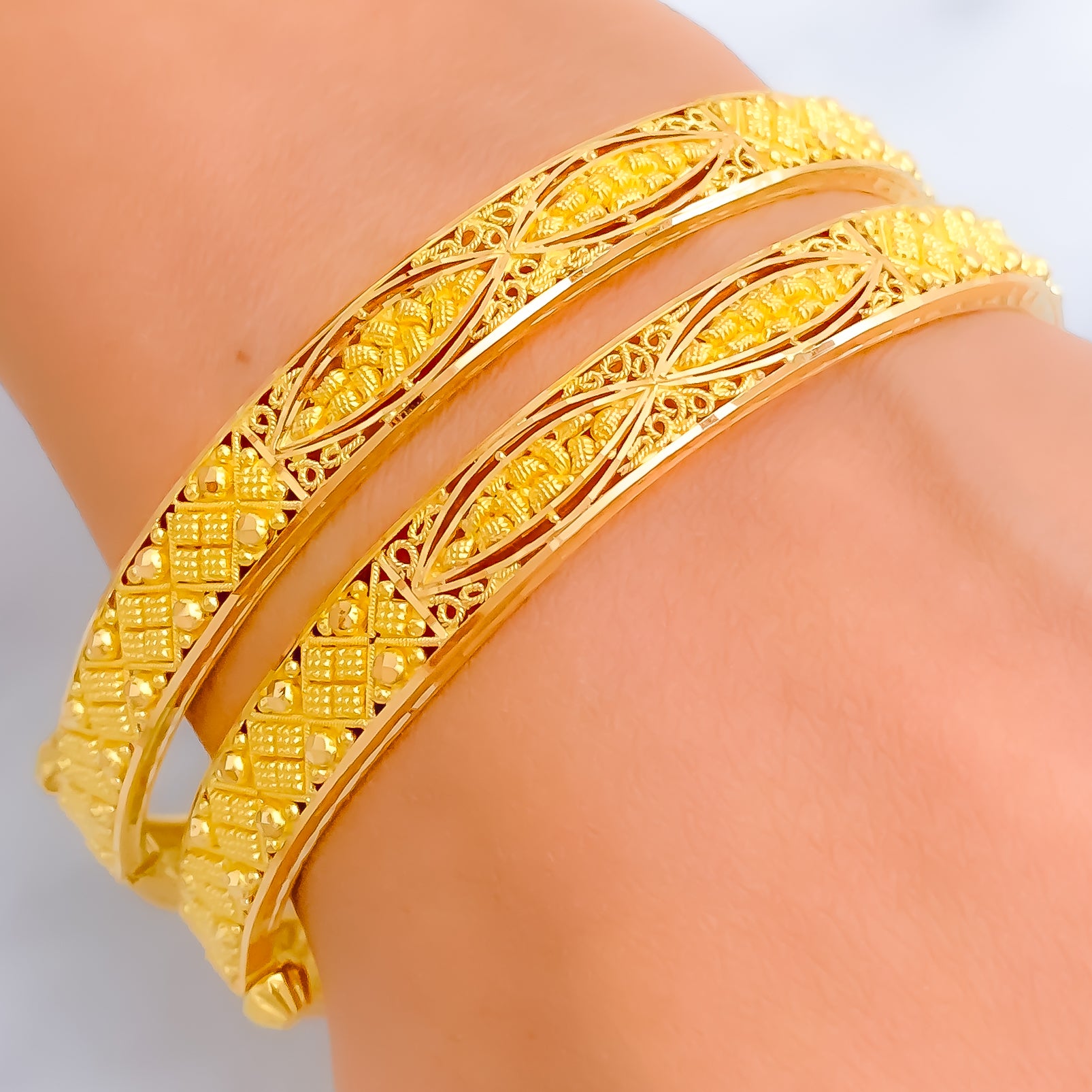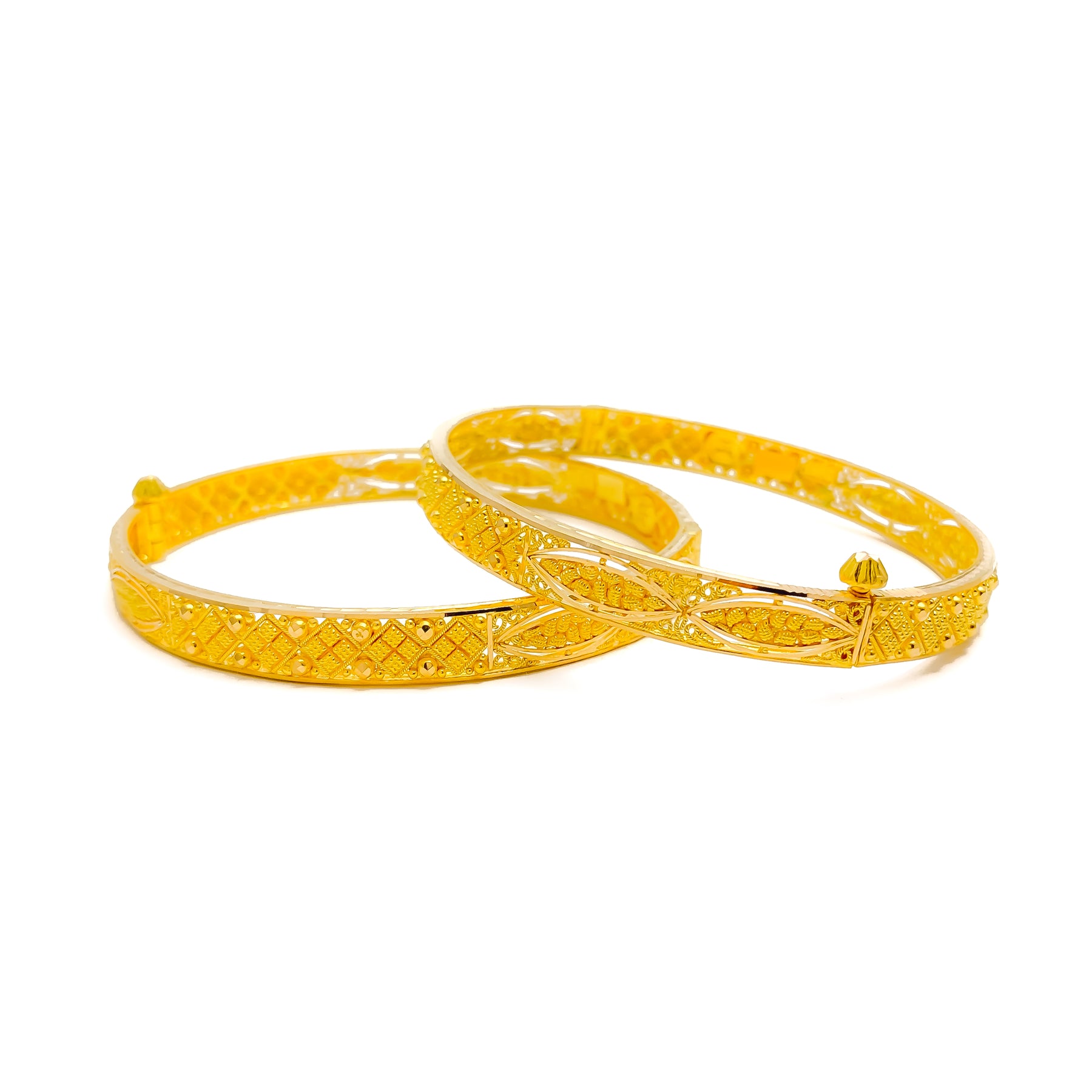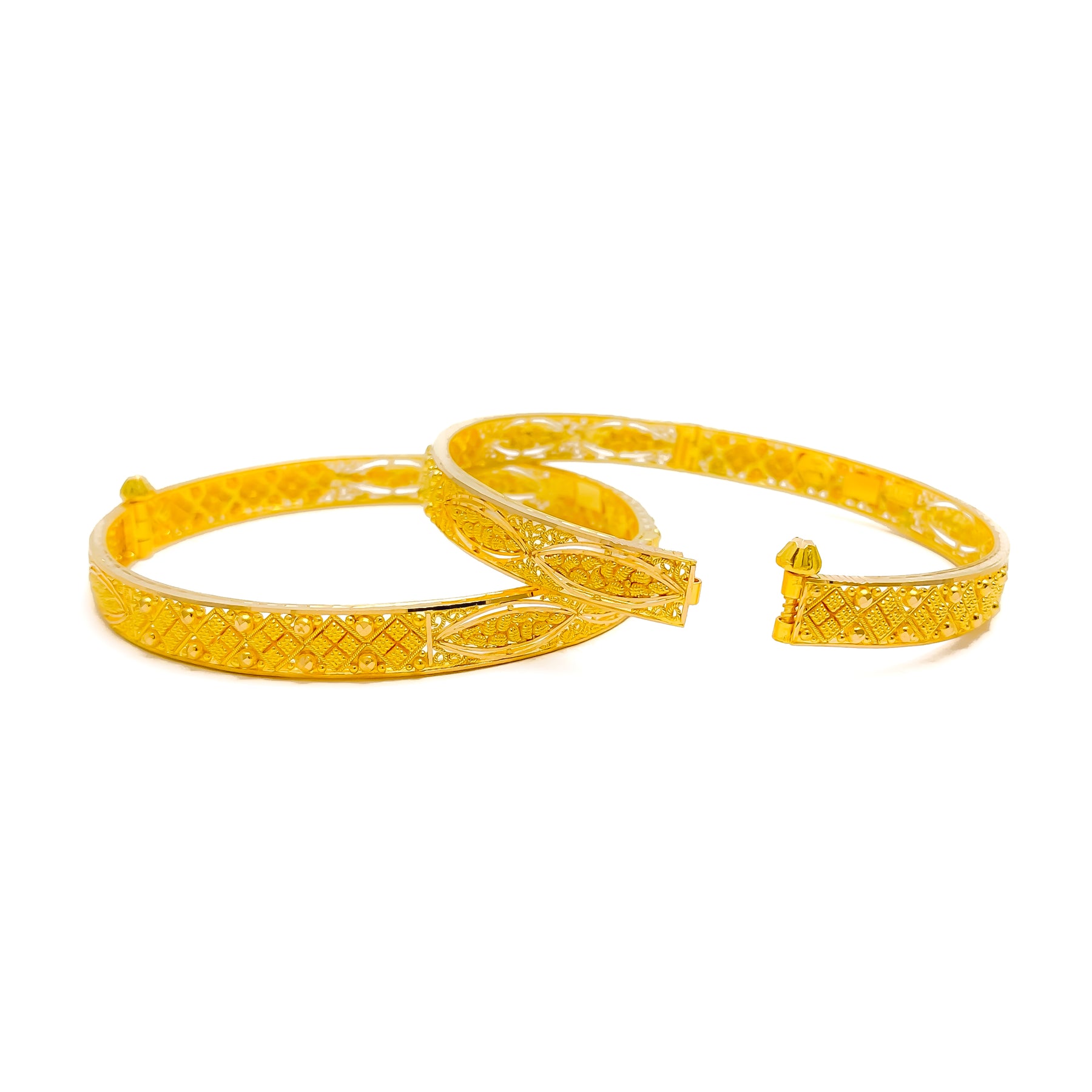 This exquisite 22k yellow gold bangle pair, weighing 29.7 grams, features a checkered leaf motif that radiates festive charm. Designed in a 2.5 size with a 2.3" diameter, these screw bangles embody refined elegance. The polished finish enhances their luminous brilliance, offering timeless appeal. A graceful two-piece set that beautifully blends traditional artistry with celebratory sophistication, perfect for both daily wear and special occasions.