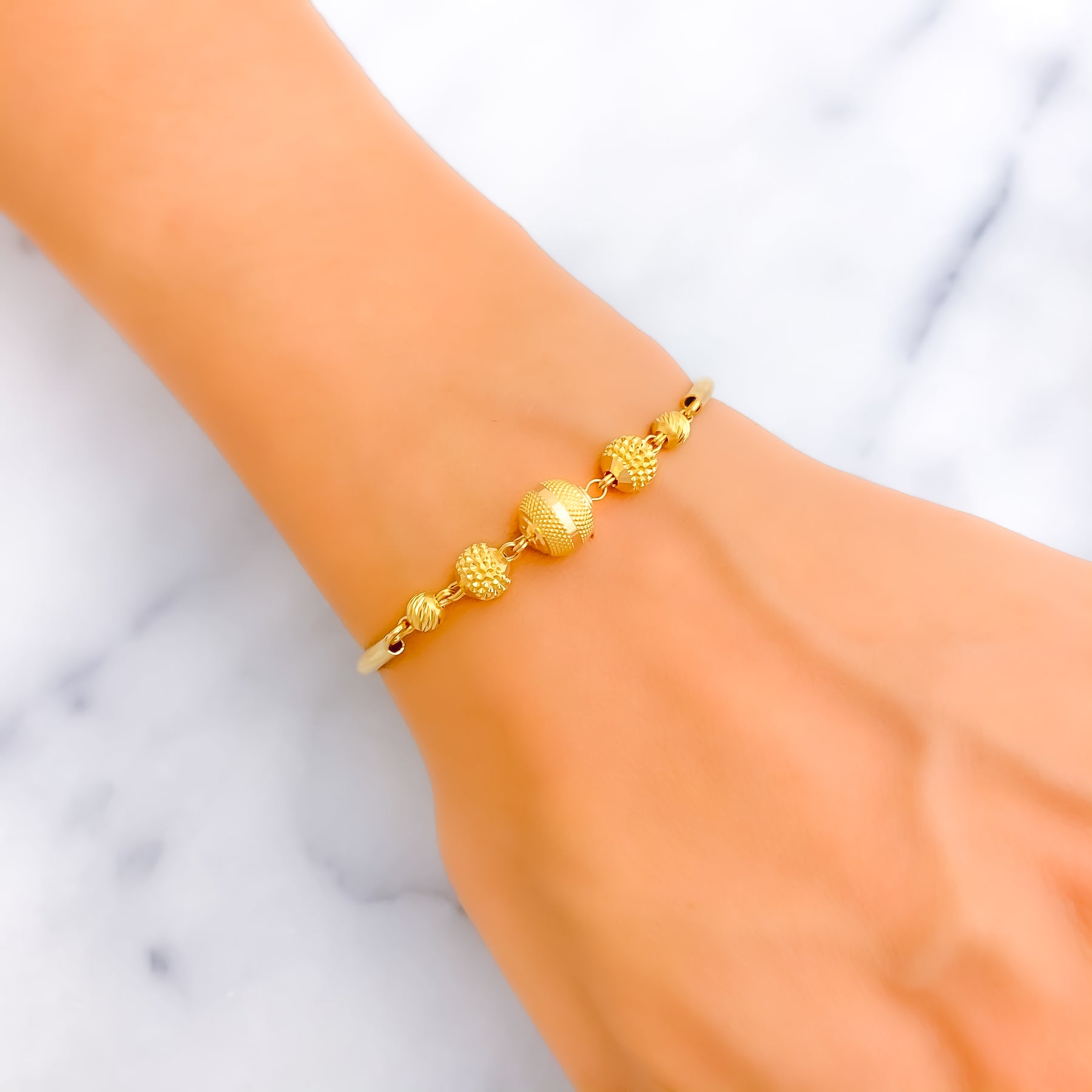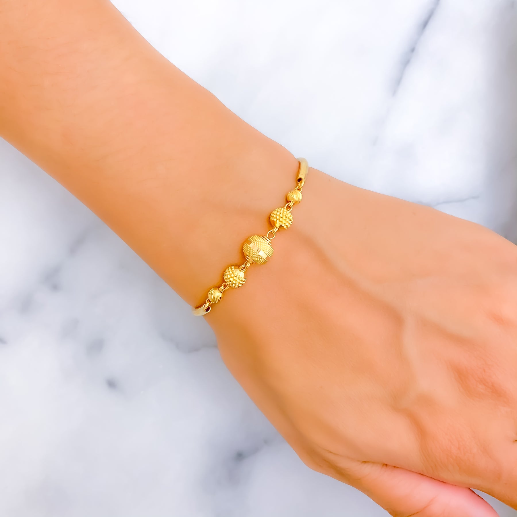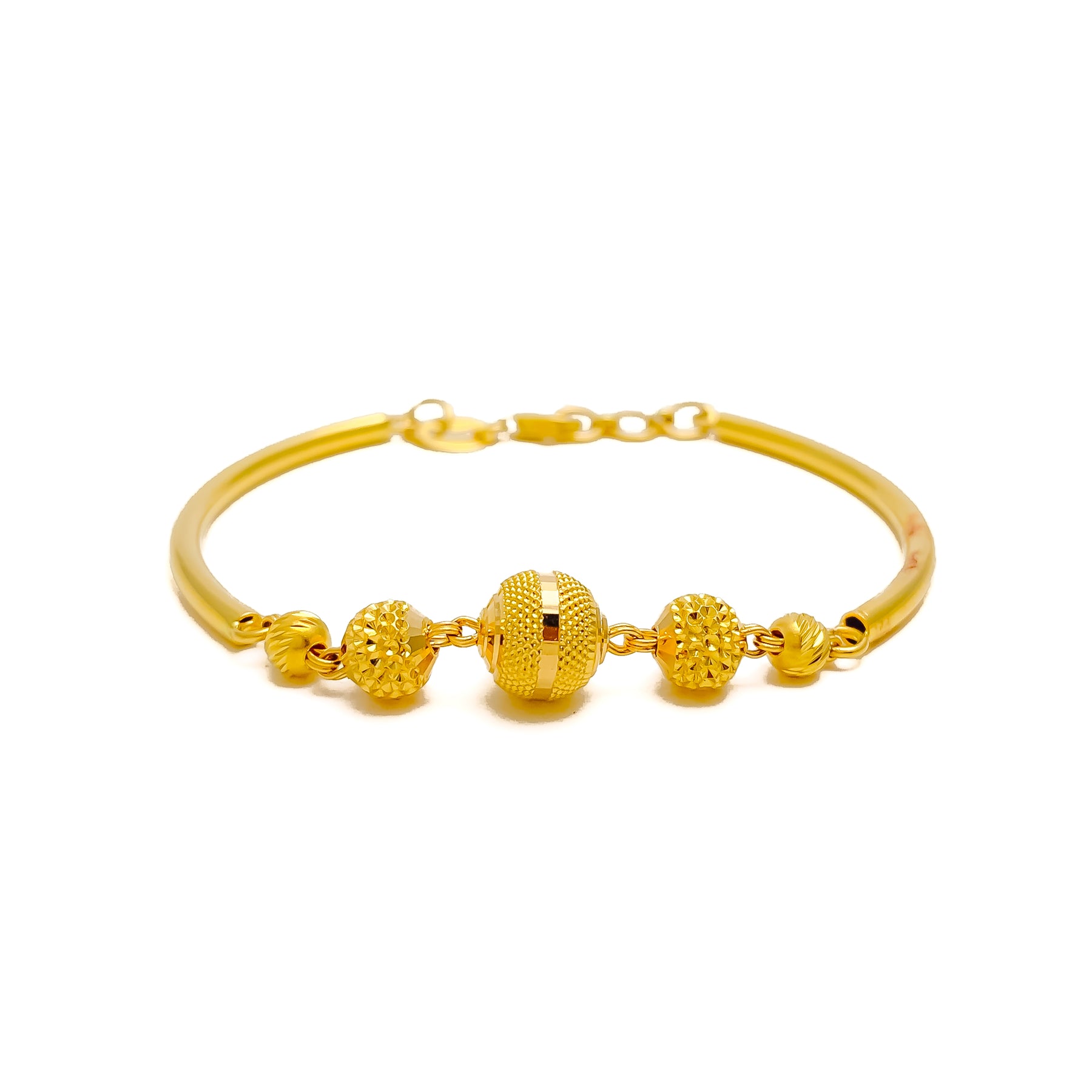 Beautifully crafted in rich 22k yellow gold, this bangle showcases a graceful graduating design that adds depth and elegance. The 2.2" round shape provides a classic fit, while 0.5" adjustable links allow for versatile wear. Finished with a secure lobster lock, it blends luxury with everyday comfort.