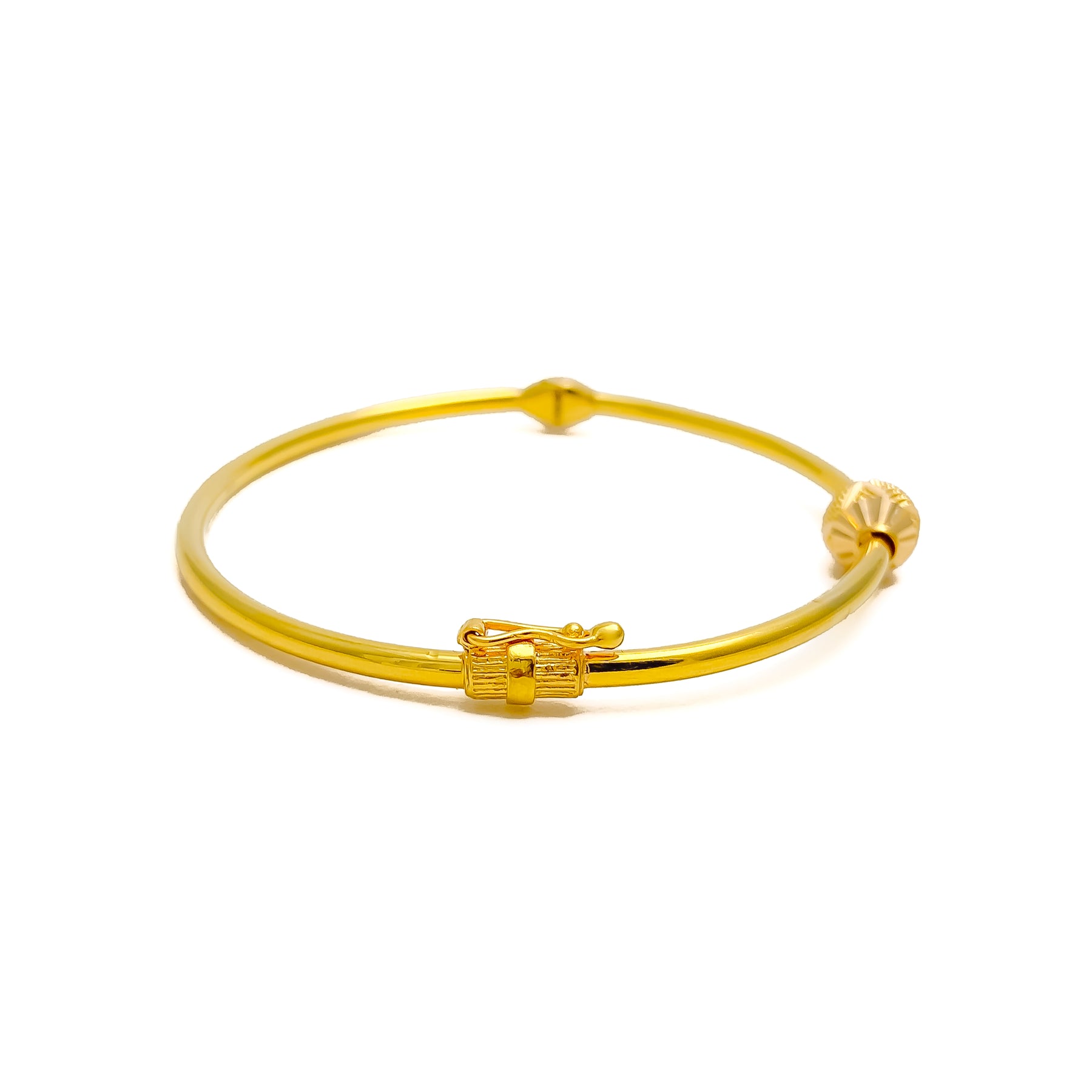 Refined and contemporary, this 22k yellow gold bangle exudes understated elegance with its sleek oval silhouette. Designed with a comfortable 2.3" diameter, it features a smooth polished finish for a timeless appeal. The spring hinge and push lock ensure effortless wear, making it a versatile statement piece.