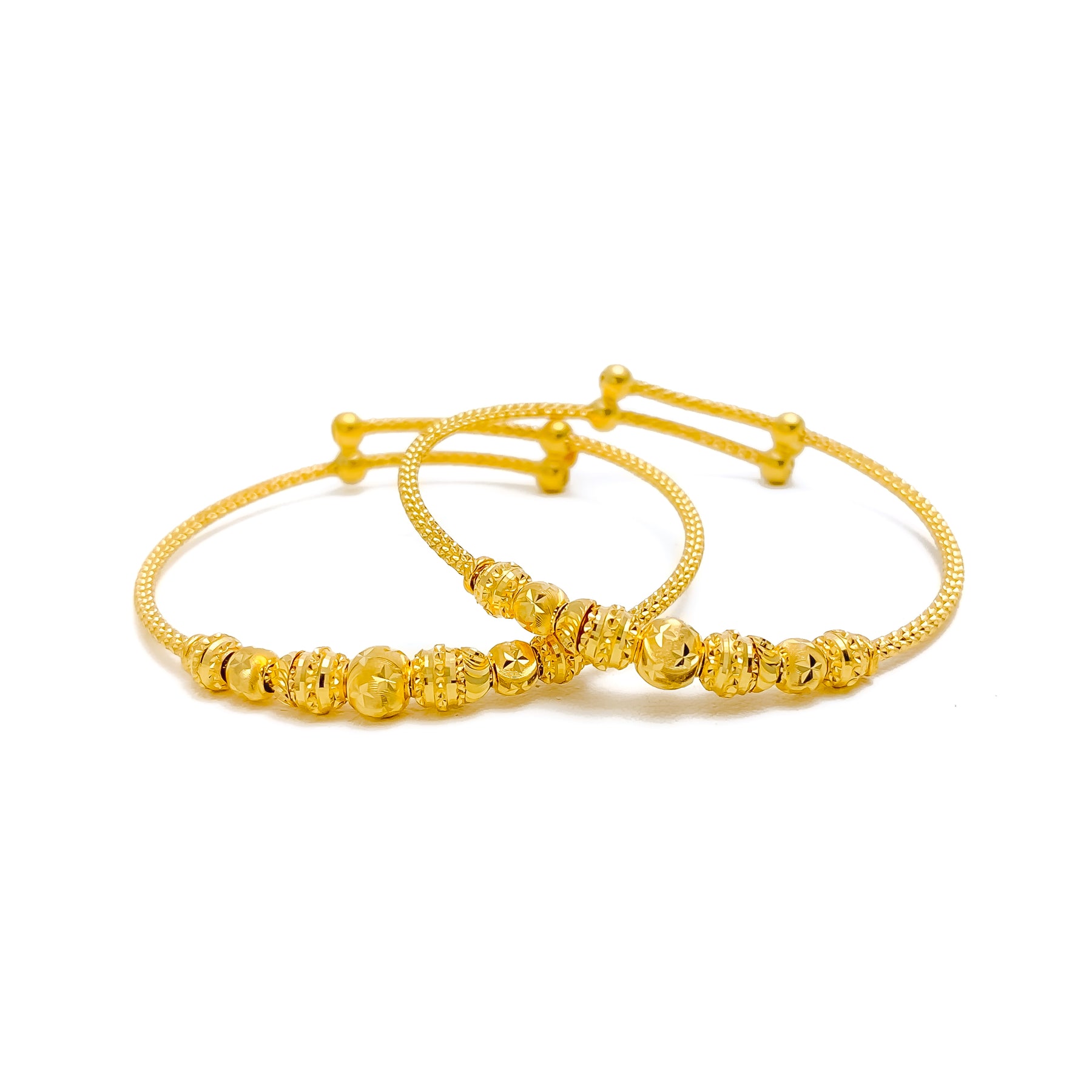 This radiant 22k yellow gold bangle pair, weighing 11.3 grams, features a lush design that exudes both elegance and charm. With a 1.7" diameter and adjustable fit, it ensures comfort and adaptability as little ones grow. The polished finish highlights its brilliant glow, creating timeless appeal. A graceful two-piece set that perfectly combines tradition with modern practicality, making it an ideal keepsake or thoughtful gift.