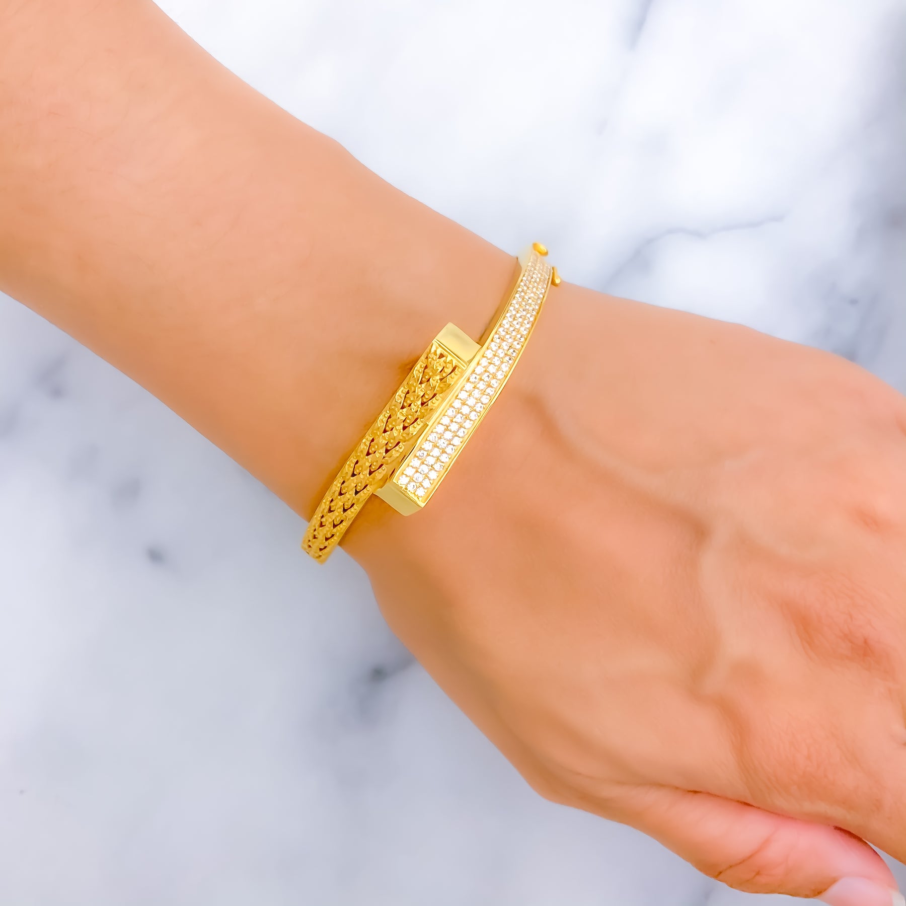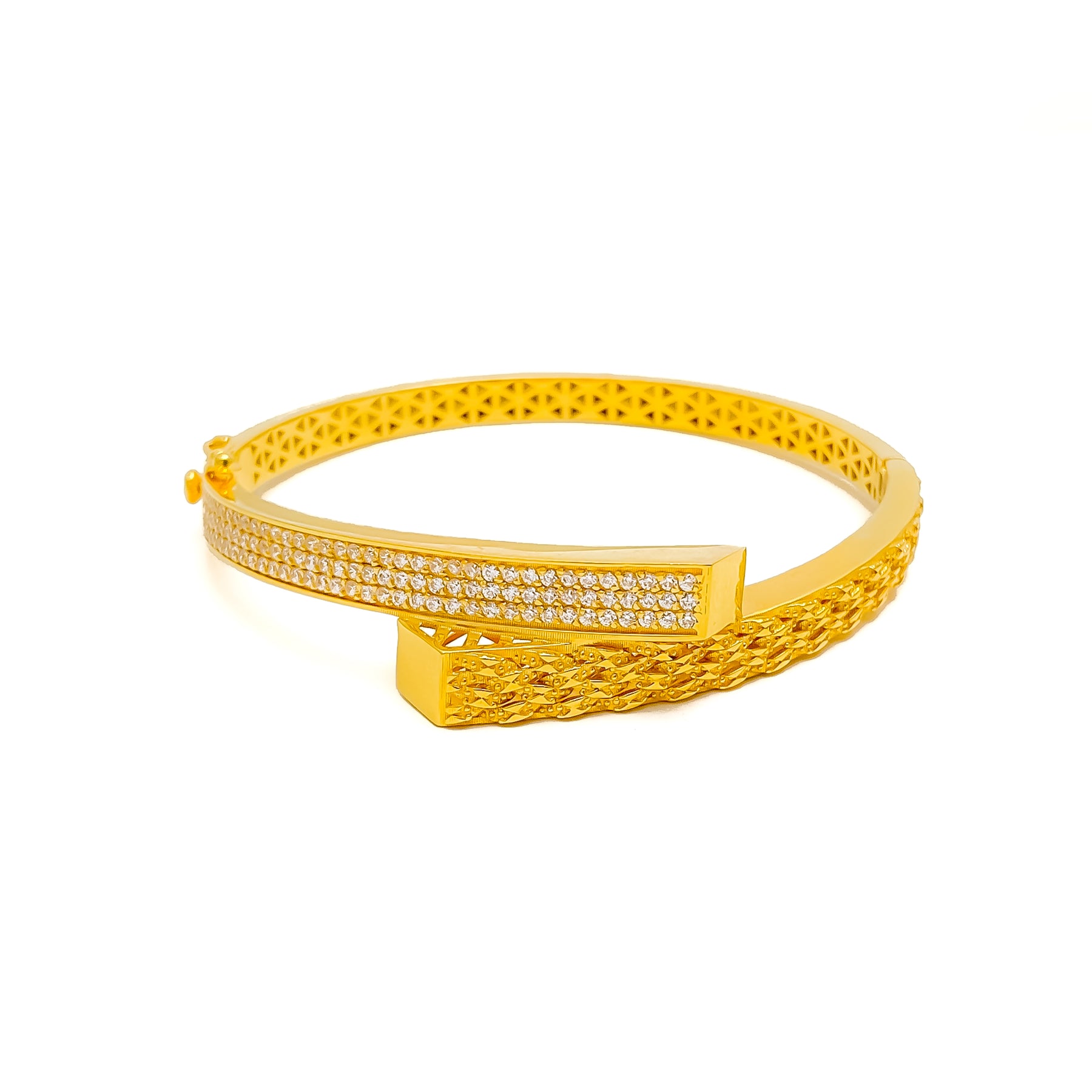 Classic and radiant, this 21k gold bangle bracelet weighs 17.7 grams and features a timeless oval shape adorned with shimmering cubic zirconia for elegant sparkle. With a 2.25" diameter, it offers a graceful fit and is designed with an openable spring hinge and push lock for ease and security. The warm yellow gold finish enhances its refined charm, making it a perfect standalone statement or complement to layered bangles. A stunning blend of tradition and beauty in a single, versatile piece.