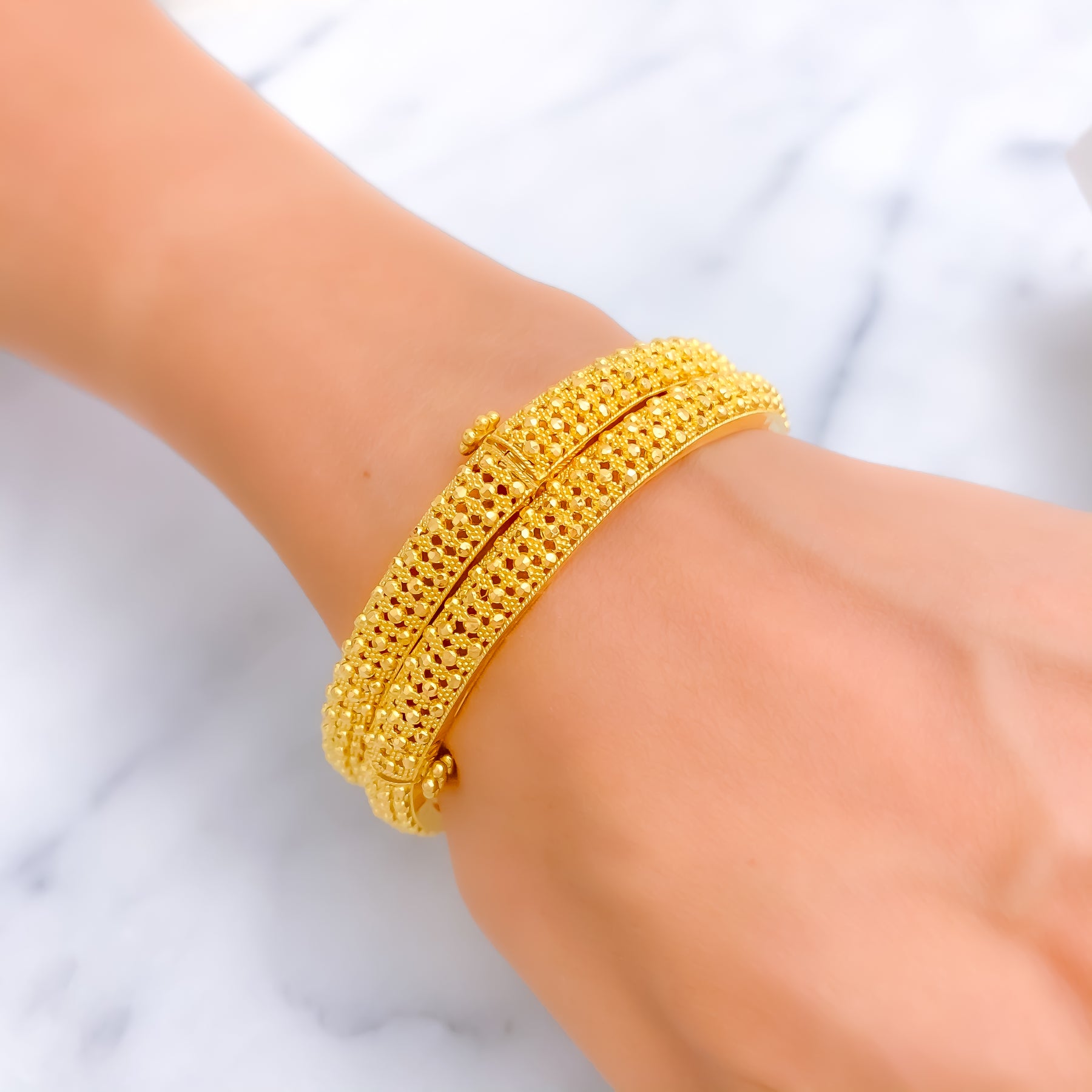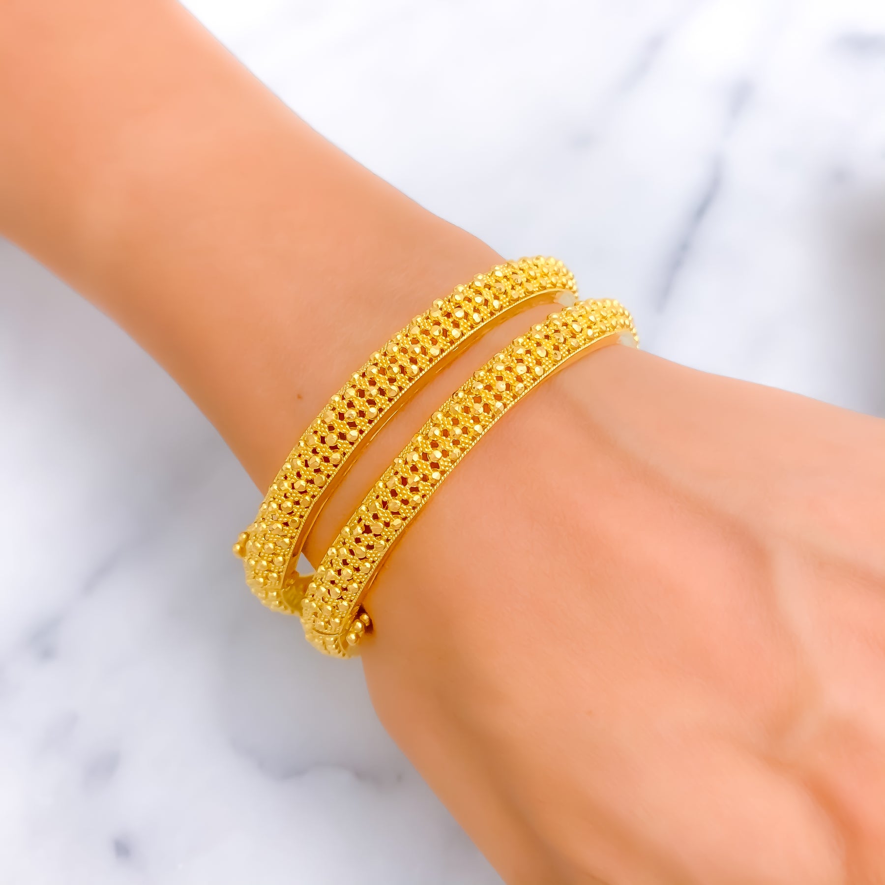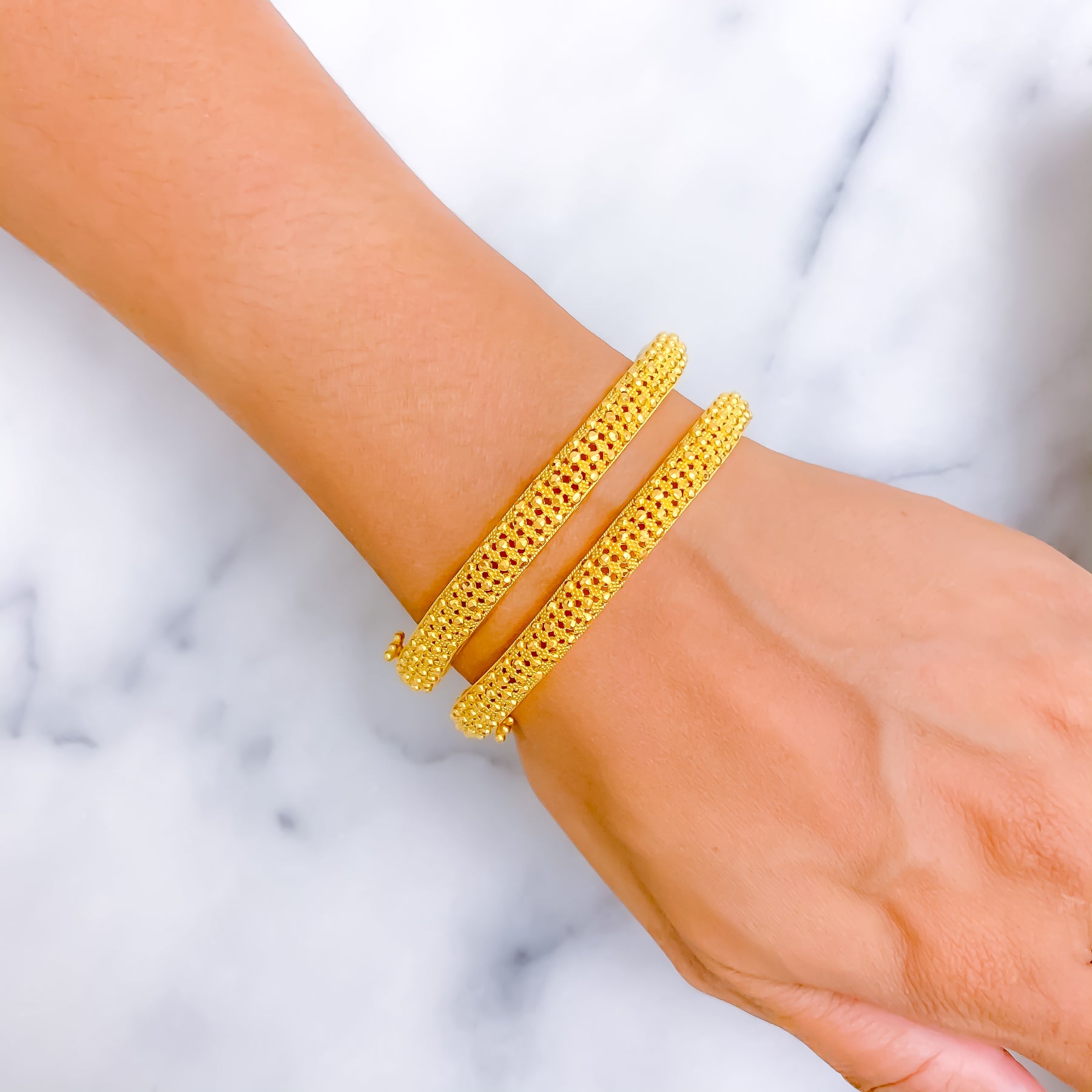 This refined 22k yellow gold bangle pair, weighing 31.6 grams, showcases a traditional screw design that radiates timeless elegance. Crafted in a 2.4 size with a 2.25" diameter, these bangles embody classic sophistication. The polished finish enhances their radiant brilliance, adding enduring charm. A distinguished two-piece set that beautifully blends cultural tradition with graceful craftsmanship, perfect for both daily elegance and celebratory occasions.