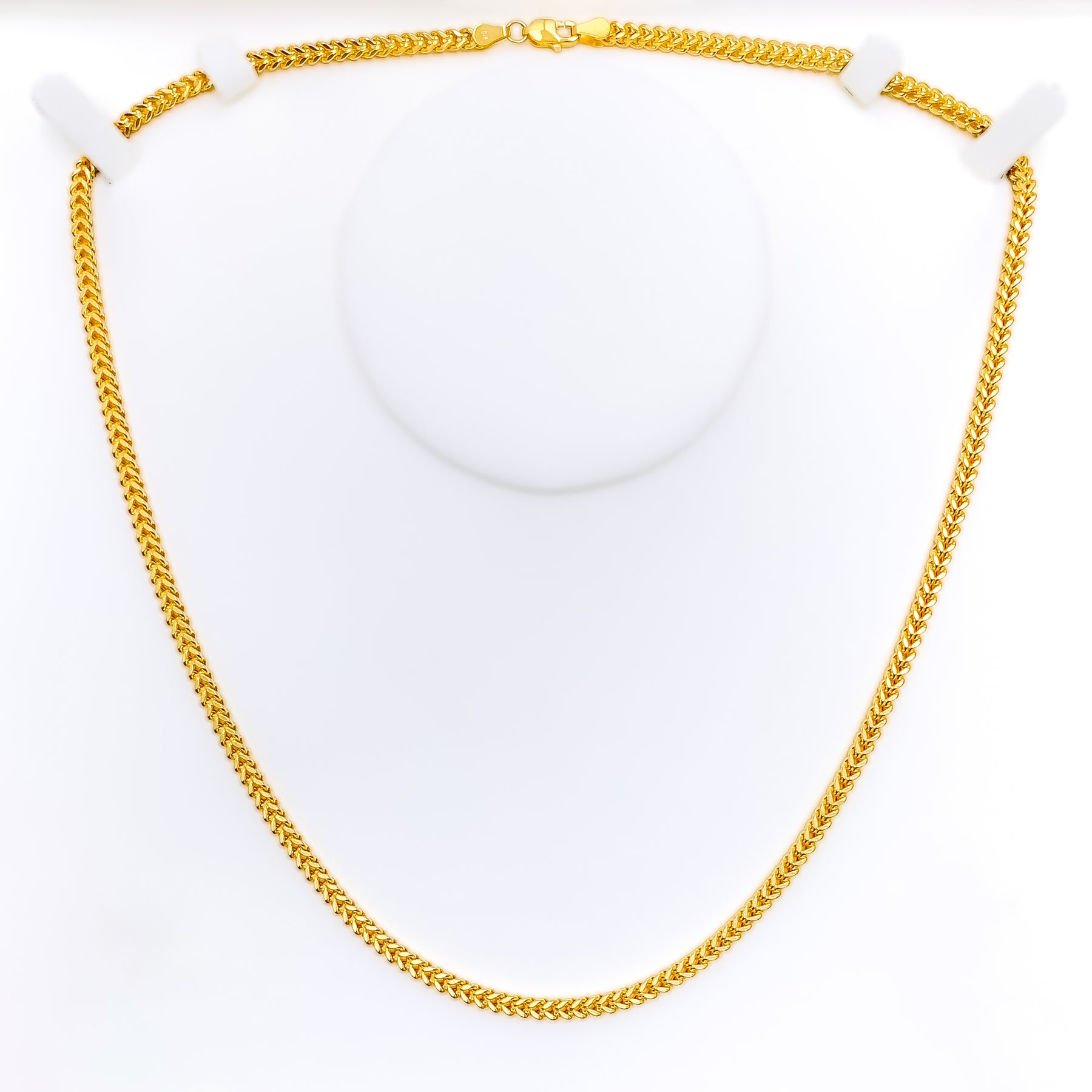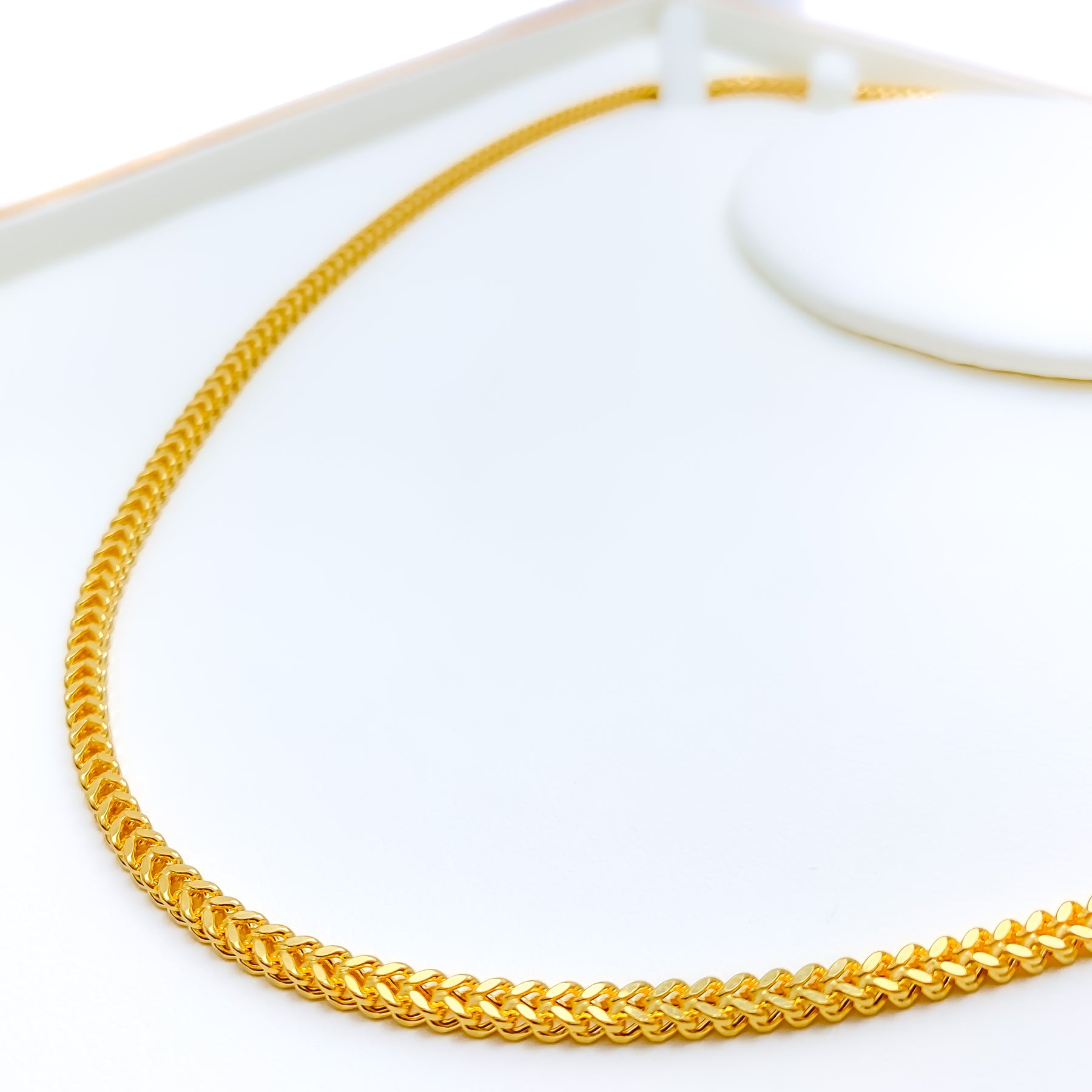 Showcasing intricate links and a bold presence, this 22k gold fox chain features a fancy weave that balances elegance with edge. The hollow, thick 3.25mm design offers volume without extra weight, ideal for daily wear or layering. Finished in radiant yellow gold, it gleams with refined charm. A sturdy lobster lock ensures a secure and stylish closure.
