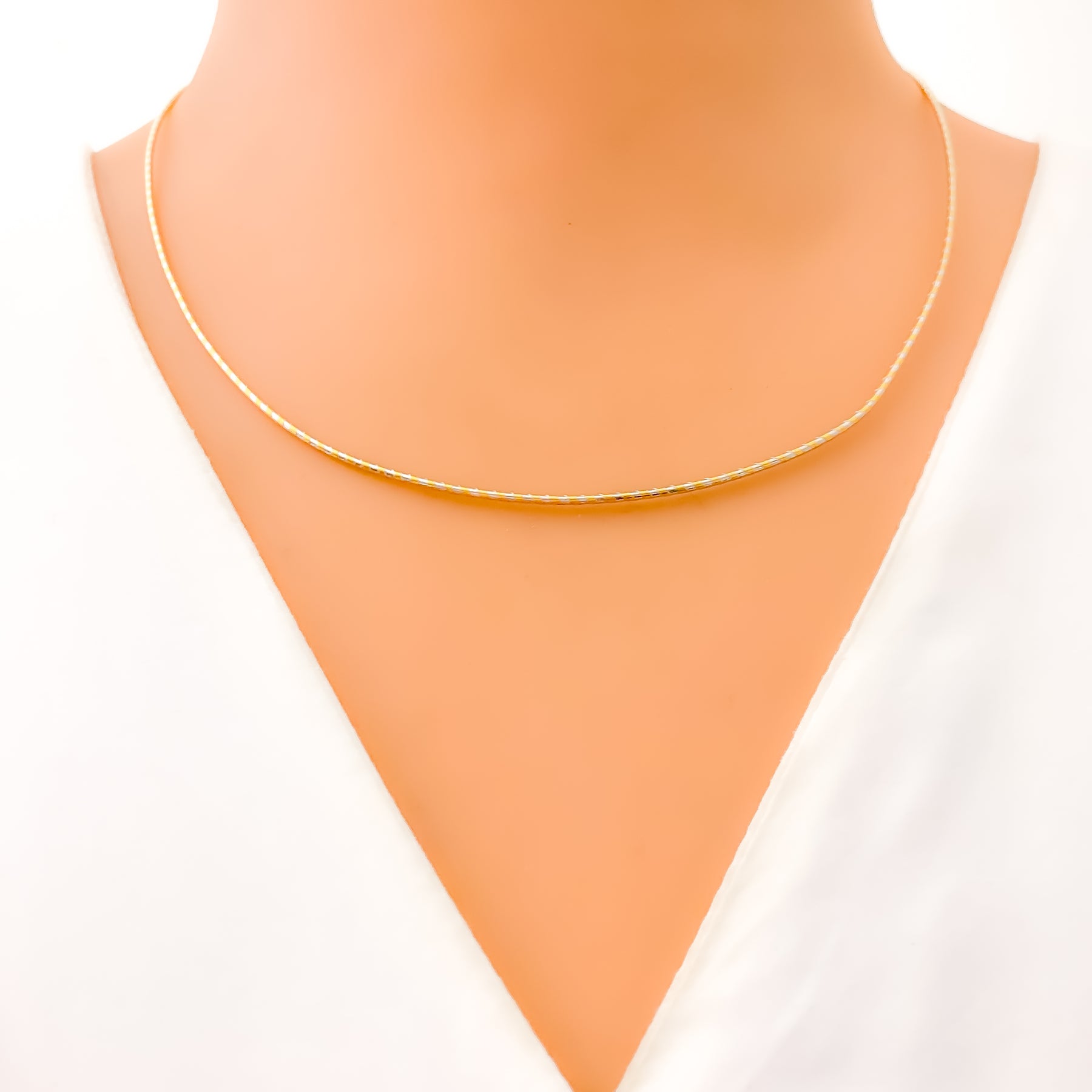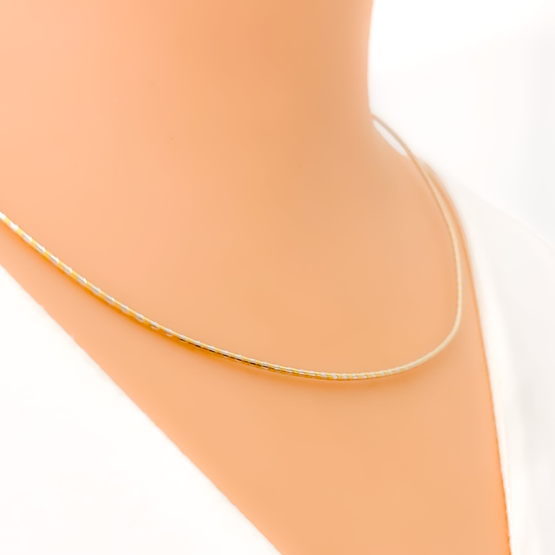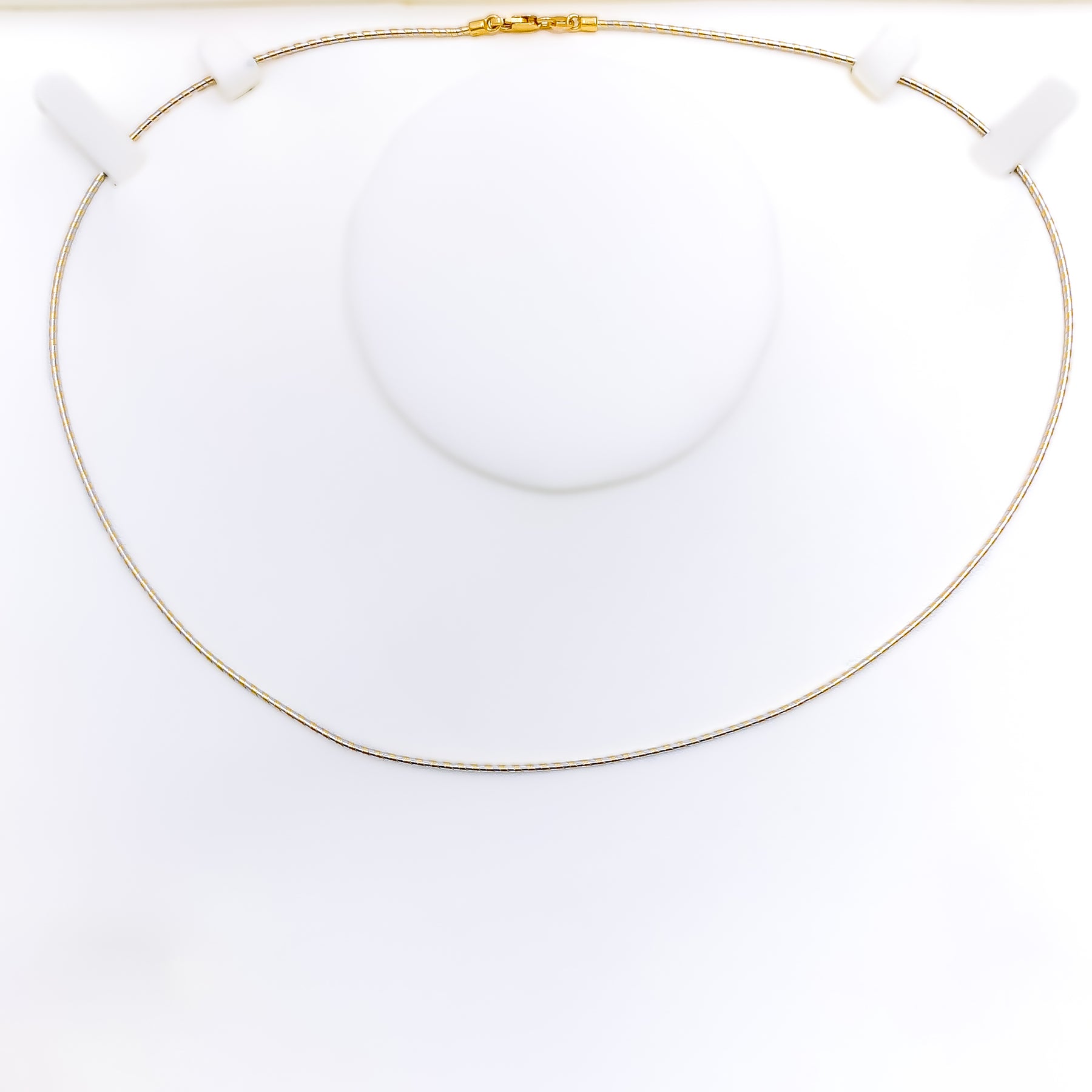 Radiating graceful contrast, this 22k gold necklace blends yellow and white gold finishes and weighs 7.9 grams. Measuring 16" and secured with a lobster lock, it offers elegant dual-tone brilliance. A luminous and alluring piece that adds refined dimension to any sophisticated ensemble.