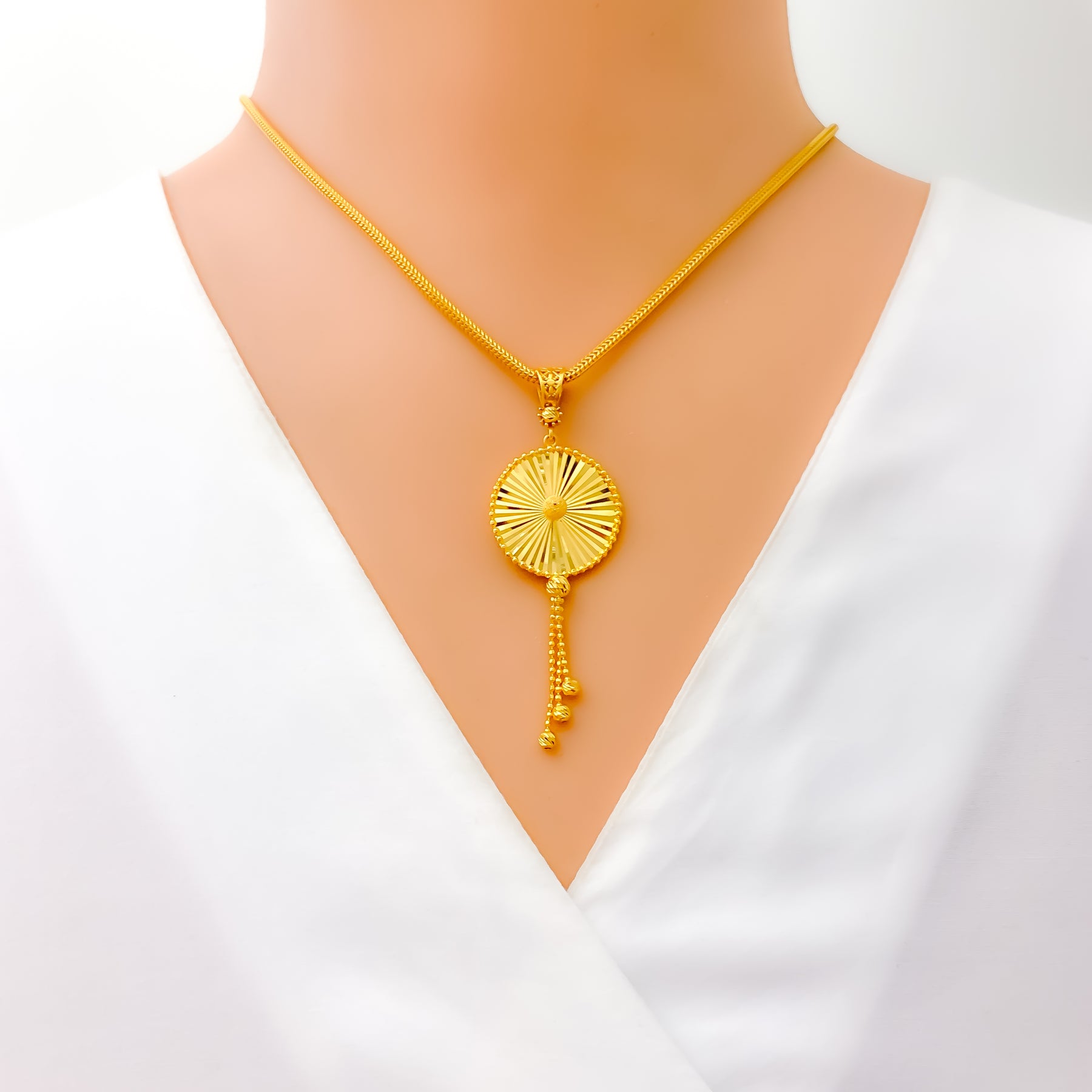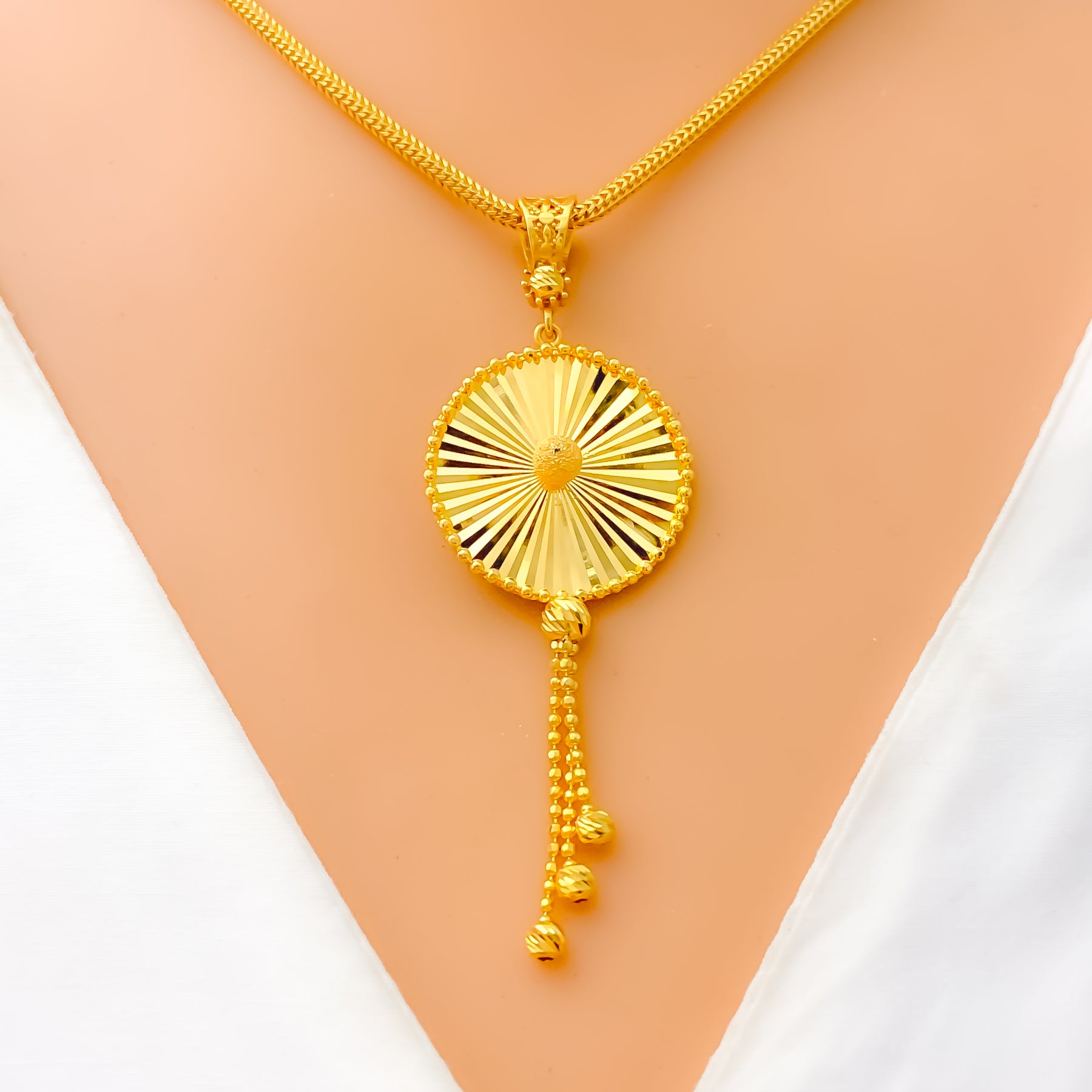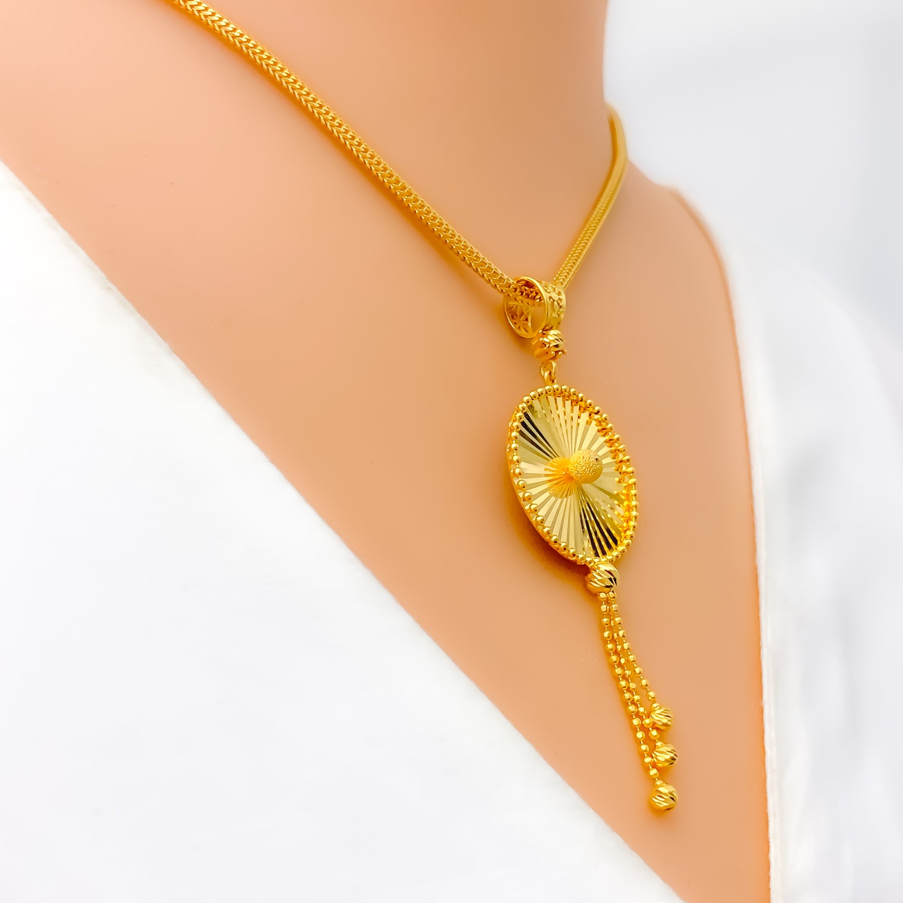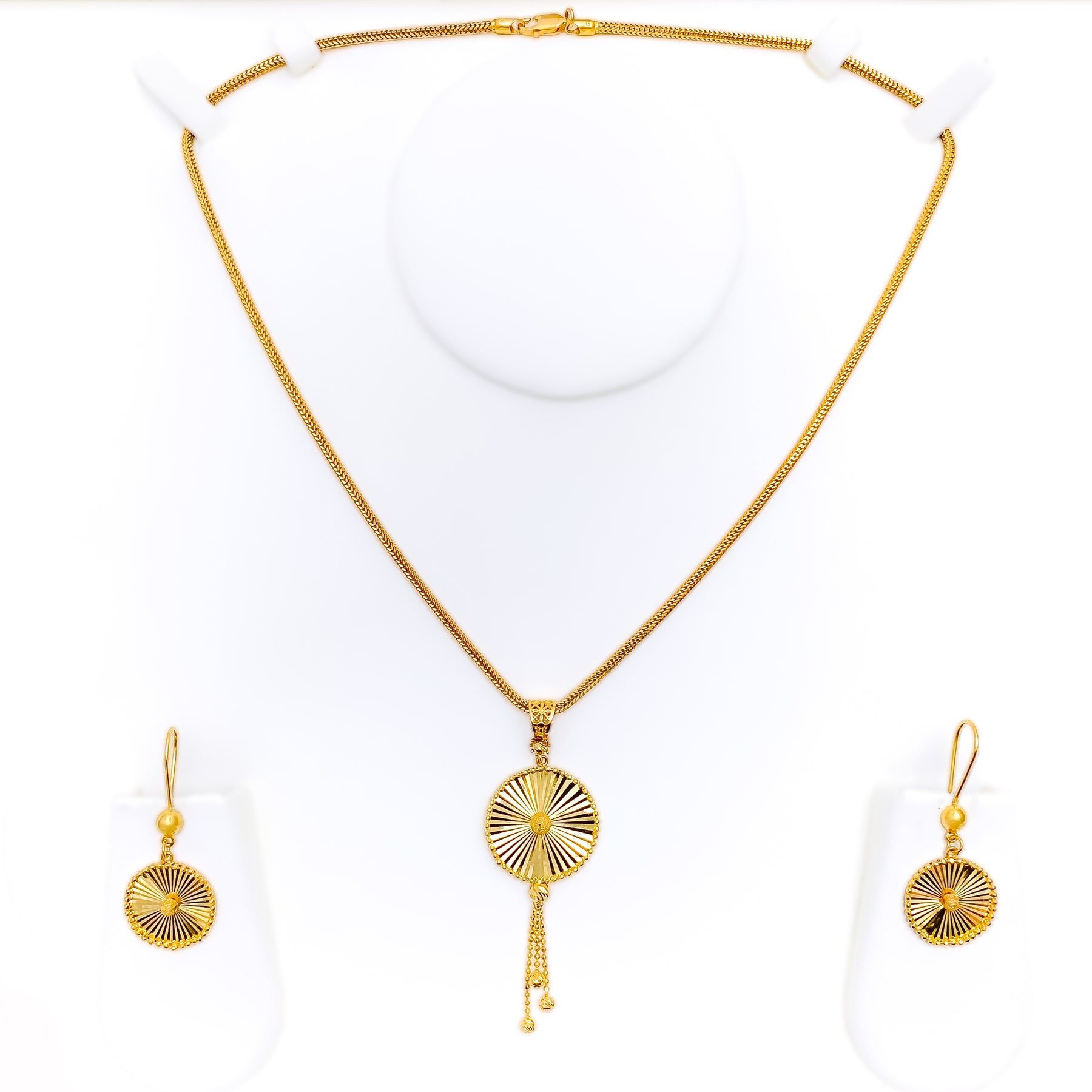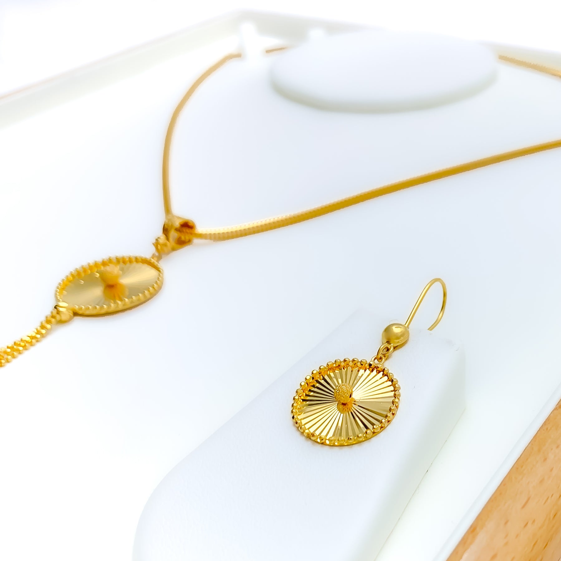Stylishly crafted with graceful detailing, this 21k gold pendant set offers a stunning balance of elegance and charm. The elongated 2.6" pendant is perfectly complemented by matching 1.75" hook-back earrings. Its lightweight yet luxurious feel makes it ideal for special occasions. Includes all three pieces for a complete, coordinated look.