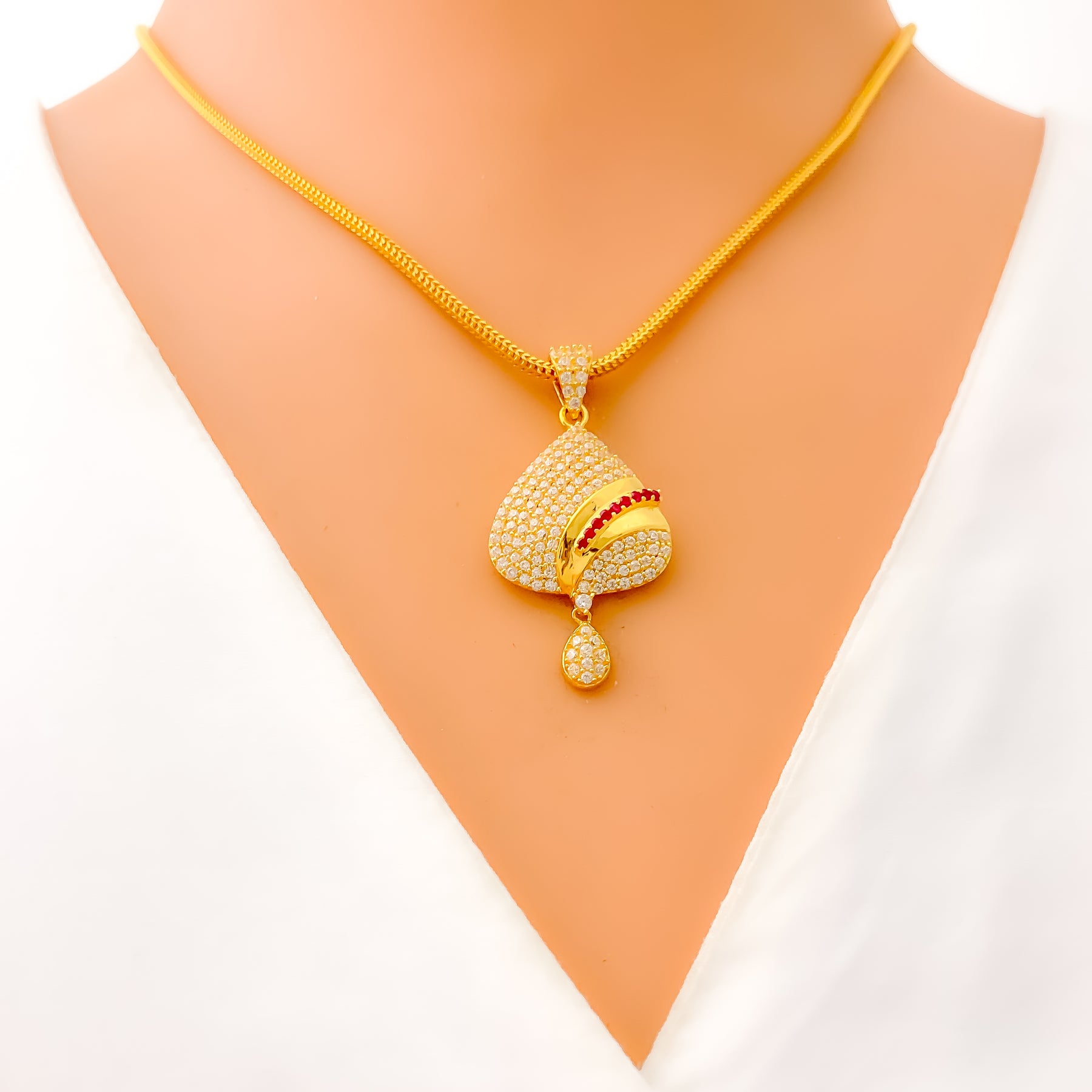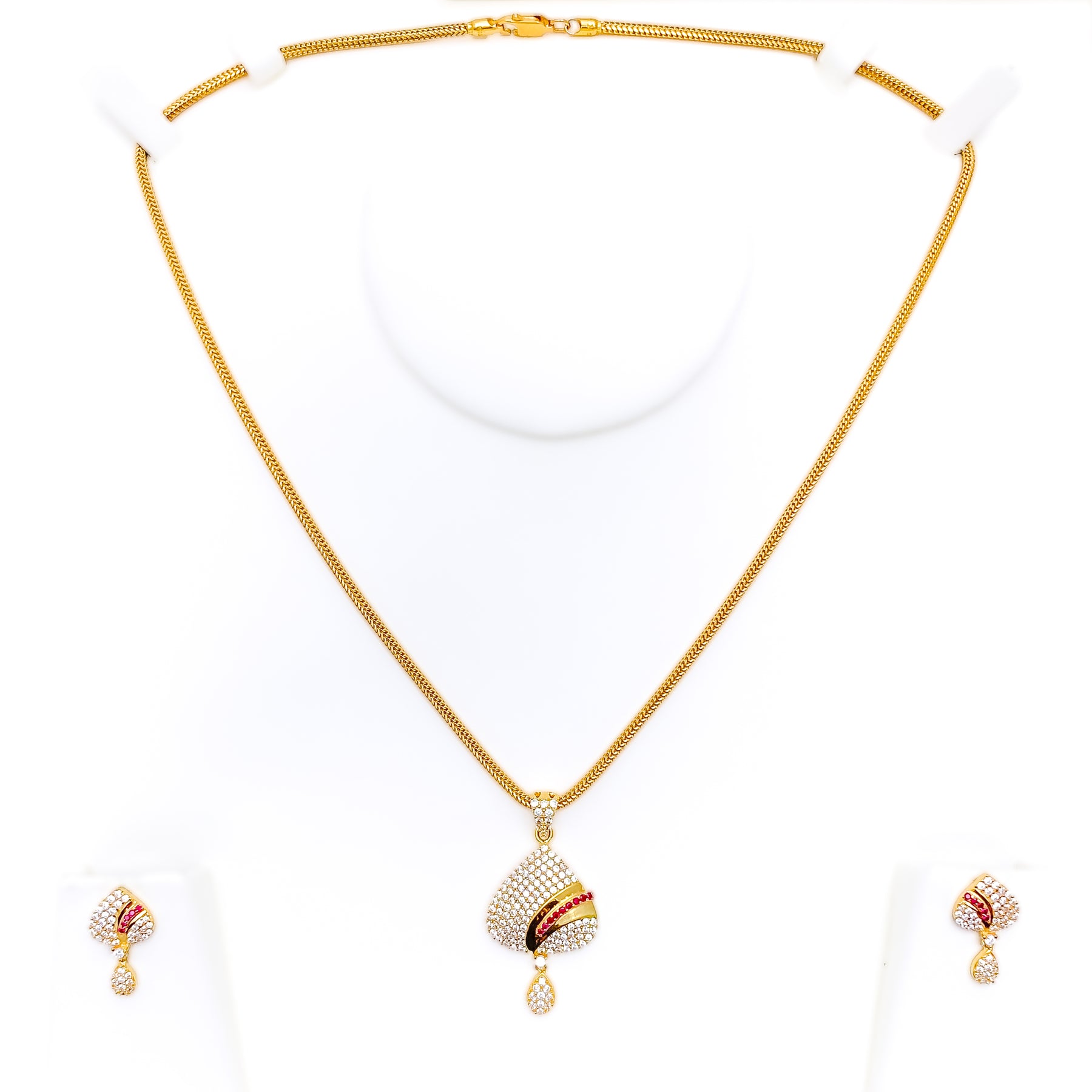 Brimming with brilliance, this 9.8-gram 22k yellow gold pendant set showcases timeless craftsmanship and radiant sparkle. The 1.6-inch pendant glows with precision-cut cubic zirconia stones that capture the light beautifully. Accompanied by 0.75-inch screw-back earrings, it offers a cohesive and graceful appeal. A three-piece statement of luxury that elevates every ensemble with classic elegance and modern refinement.