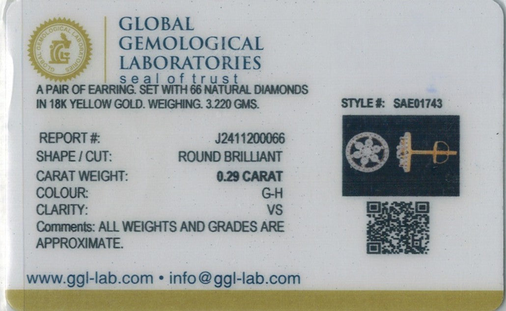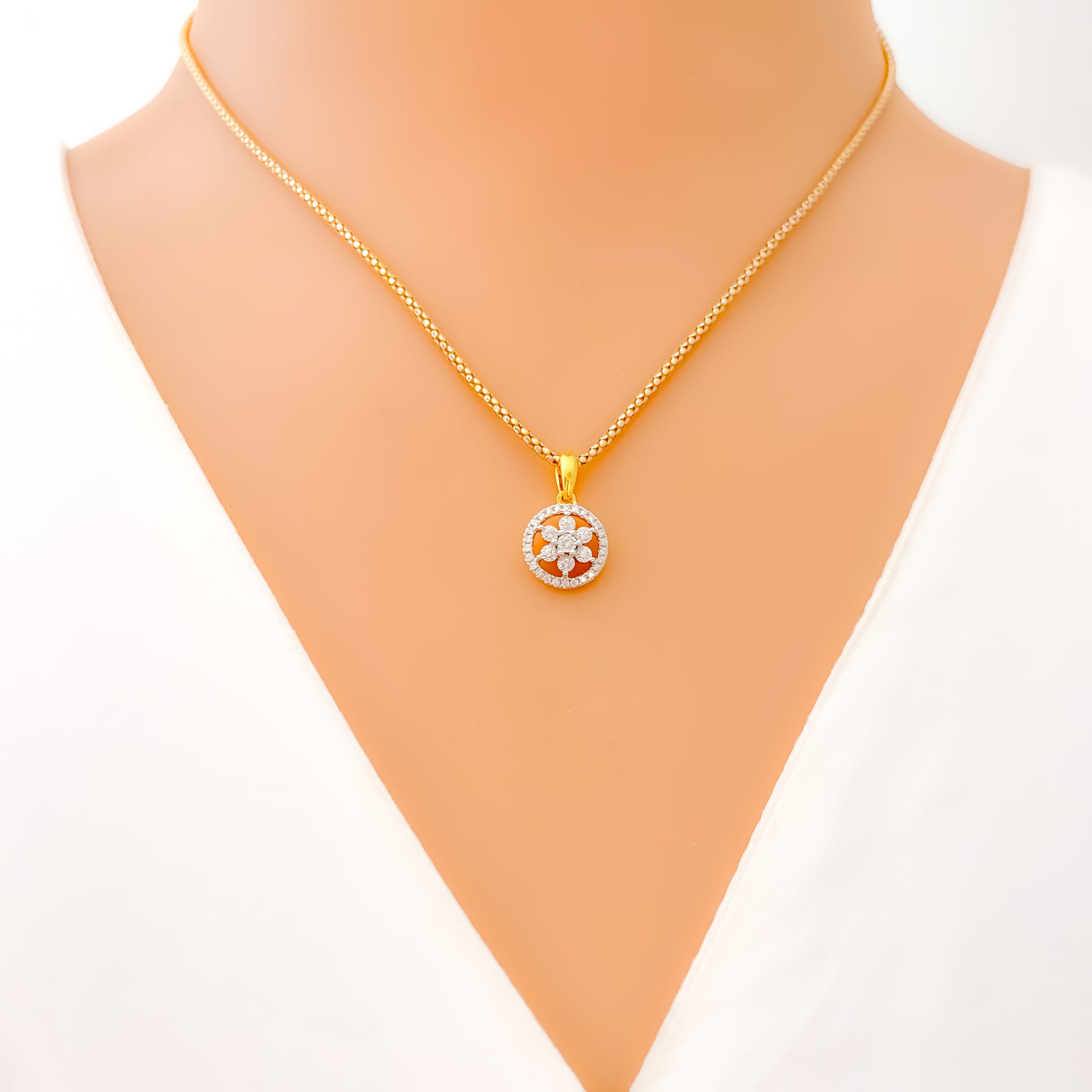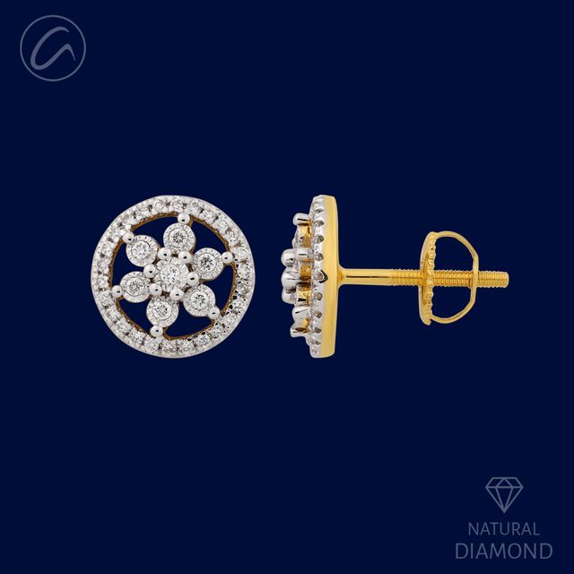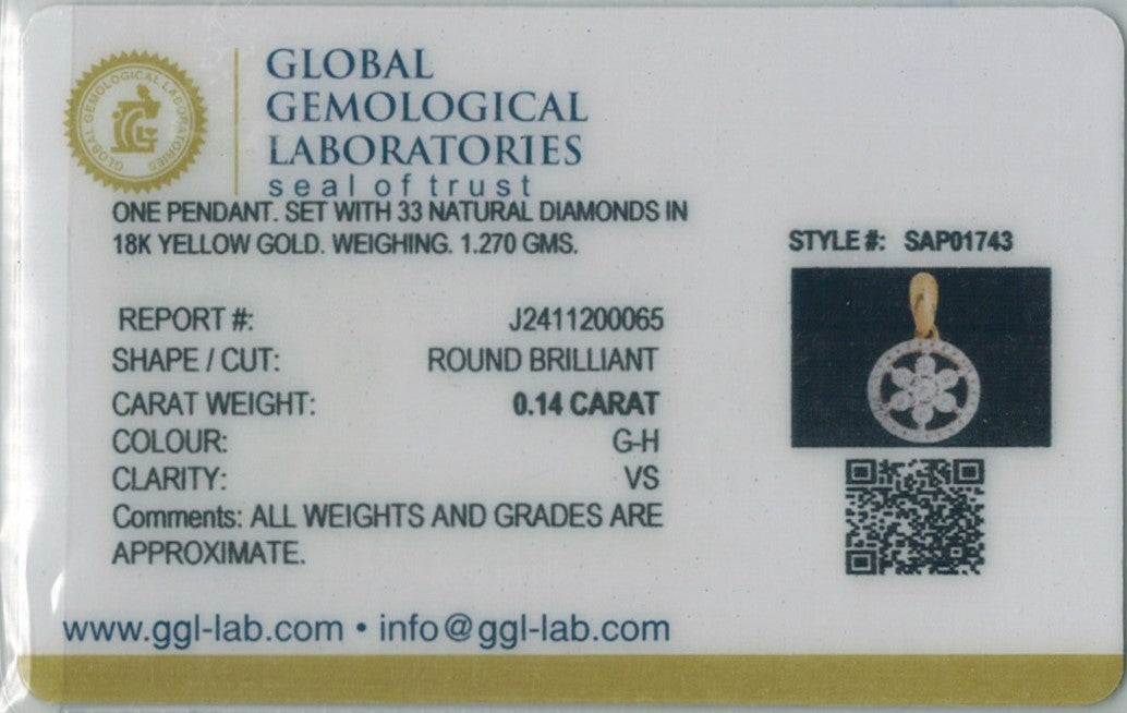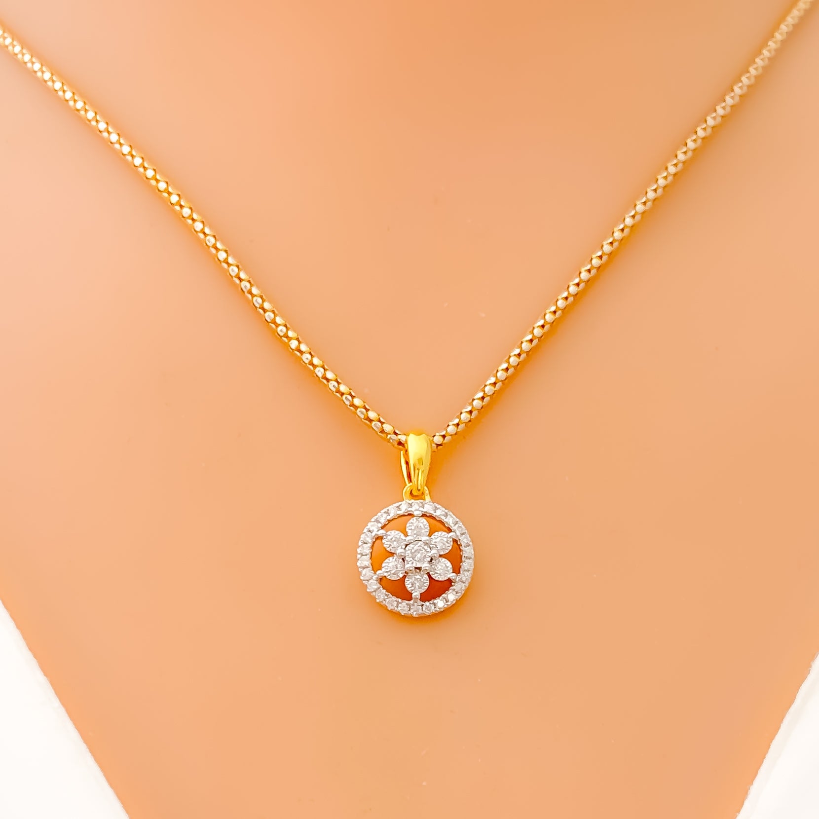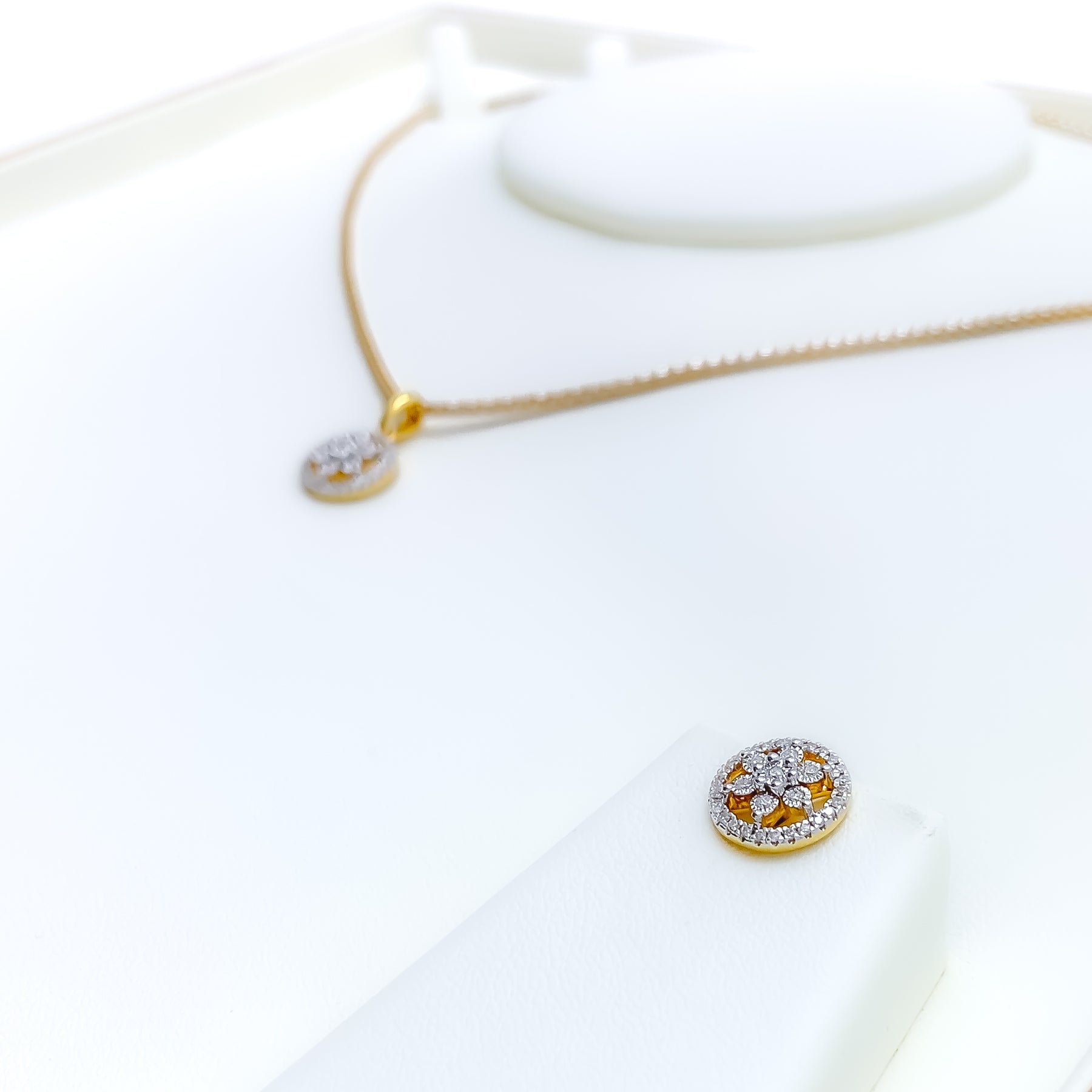 Exuding timeless charm, this 18k yellow gold pendant set showcases a delicate floral motif adorned with 0.43ct of round brilliant-cut diamonds. The pendant, measuring 0.6 inches, radiates intricate craftsmanship, making it a refined statement piece. Designed to be worn with your preferred chain, it is complemented by 0.4-inch matching earrings featuring secure screw-back posts. The harmonious blend of traditional aesthetics and modern brilliance makes this set a must-have for those who appreciate classic elegance with a luxurious sparkle.