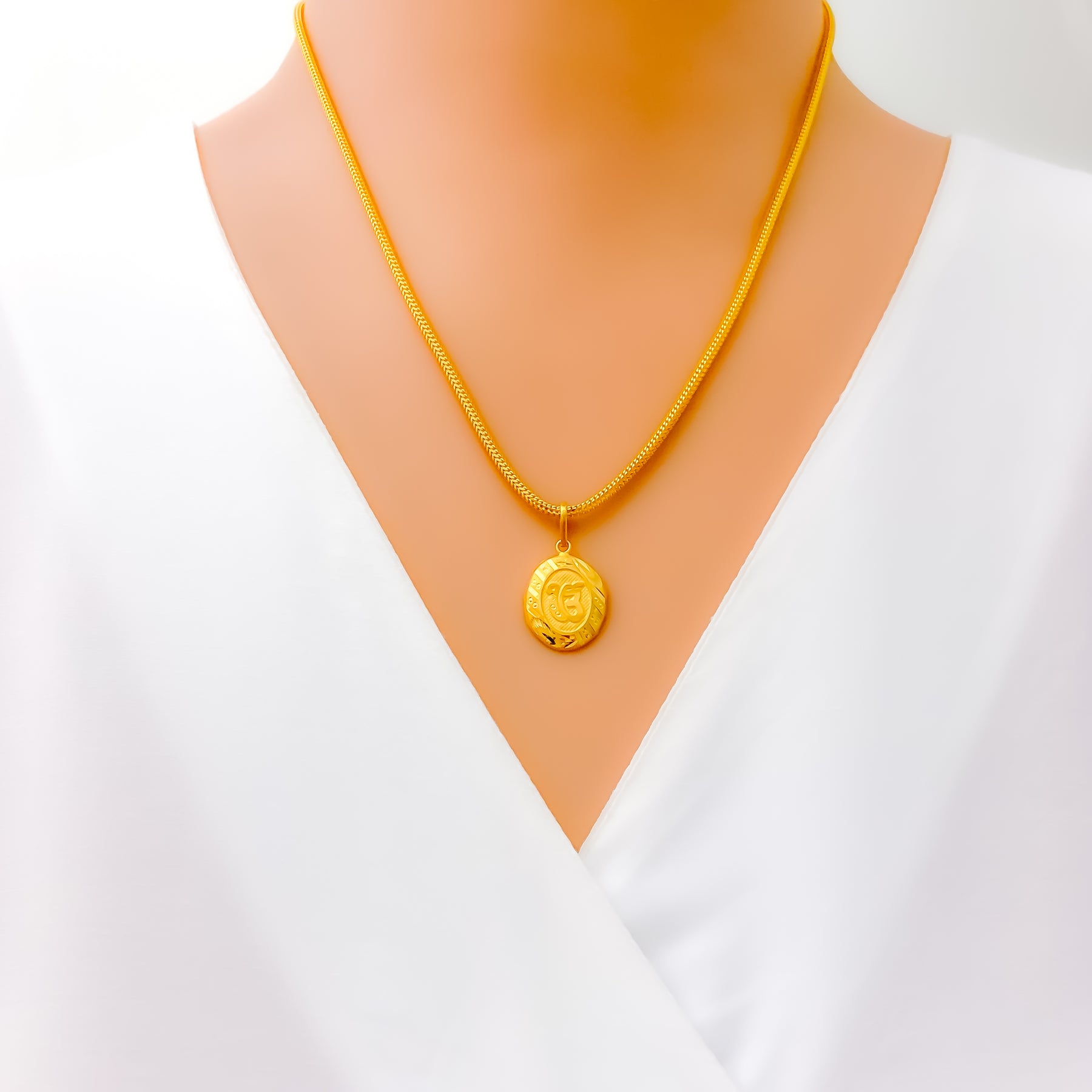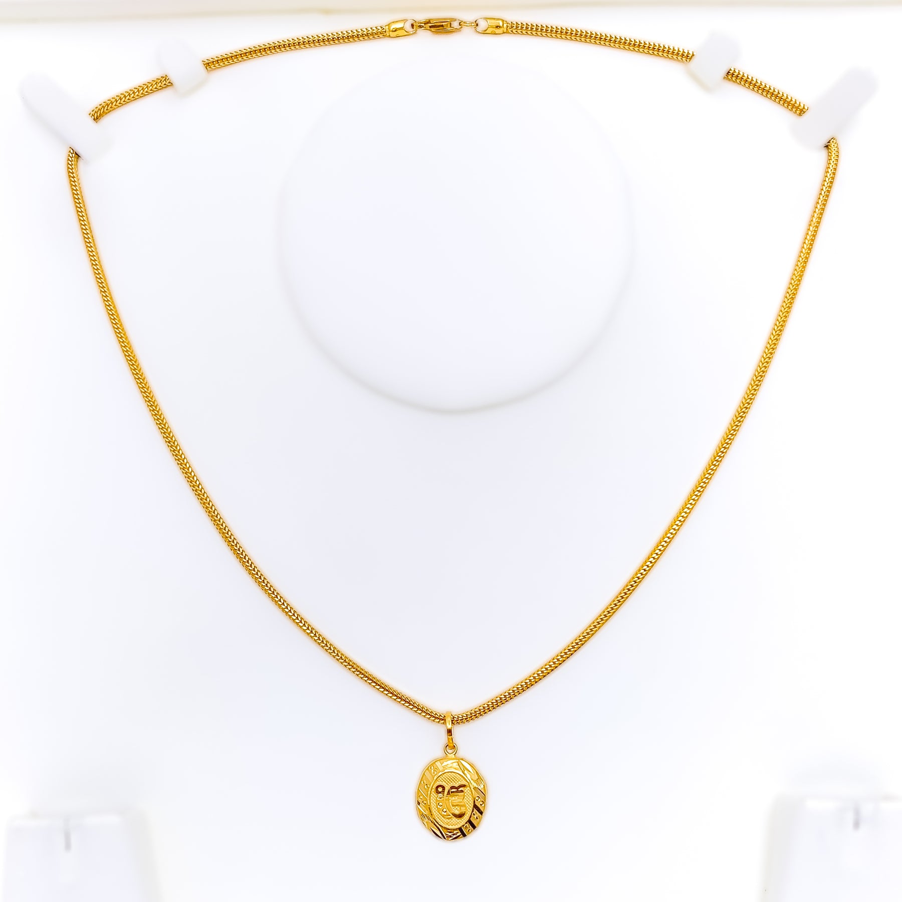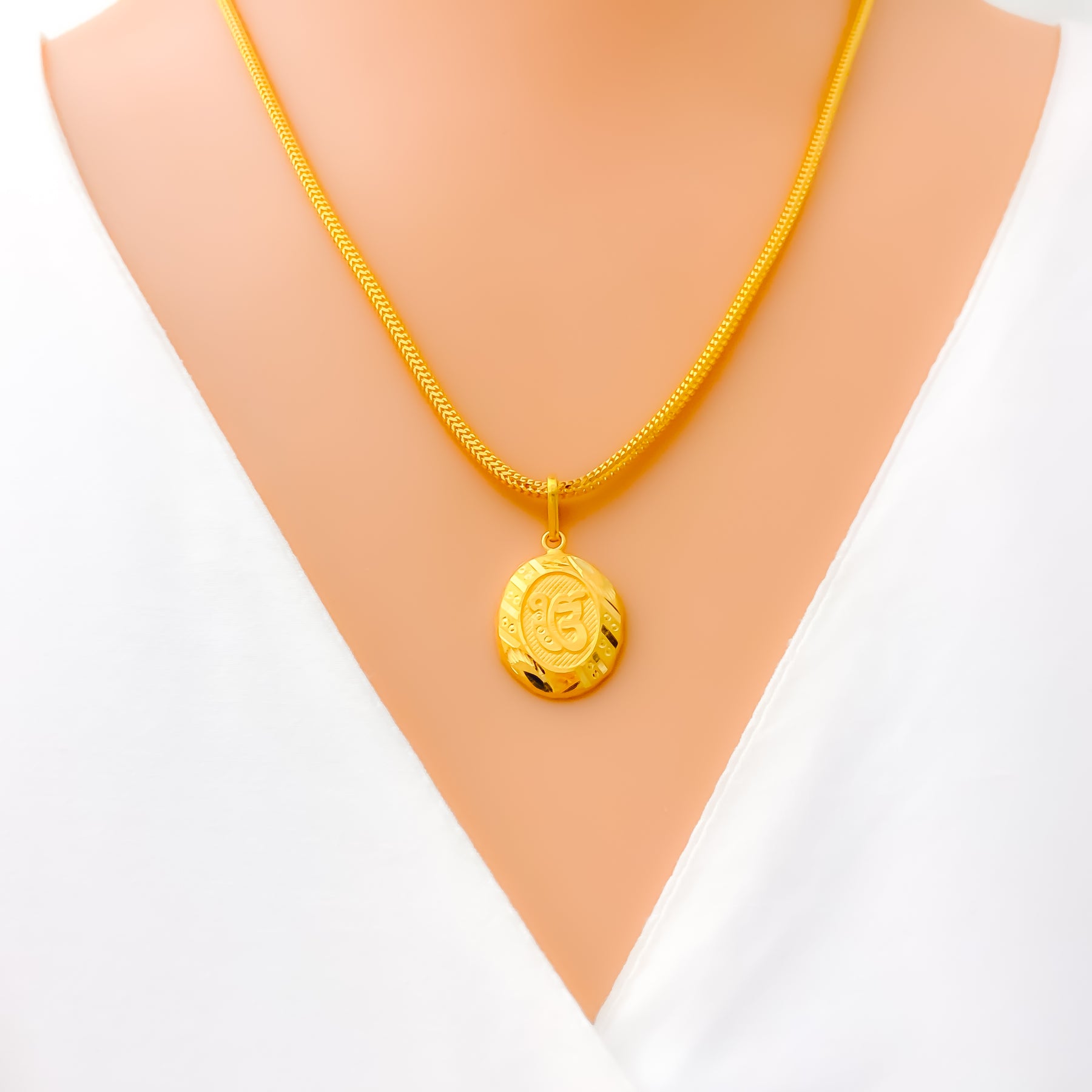 This finely crafted Khanda pendant in 22k yellow gold offers a perfect blend of devotion and elegance. With a weight of 0.8 grams, it remains lightweight yet striking, making it ideal for everyday wear. The polished finish enhances its refined look, while its 1-inch length gives a graceful presence. Designed without a chain, it allows you to personalize your look with any preferred chain style.