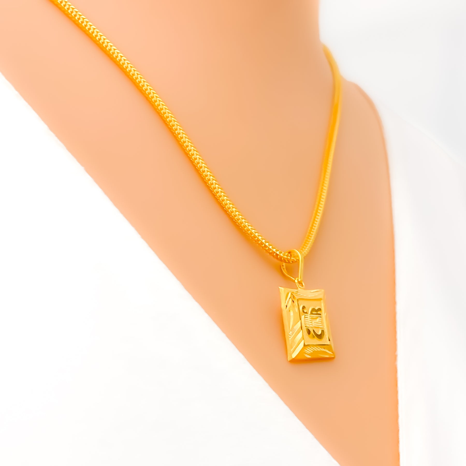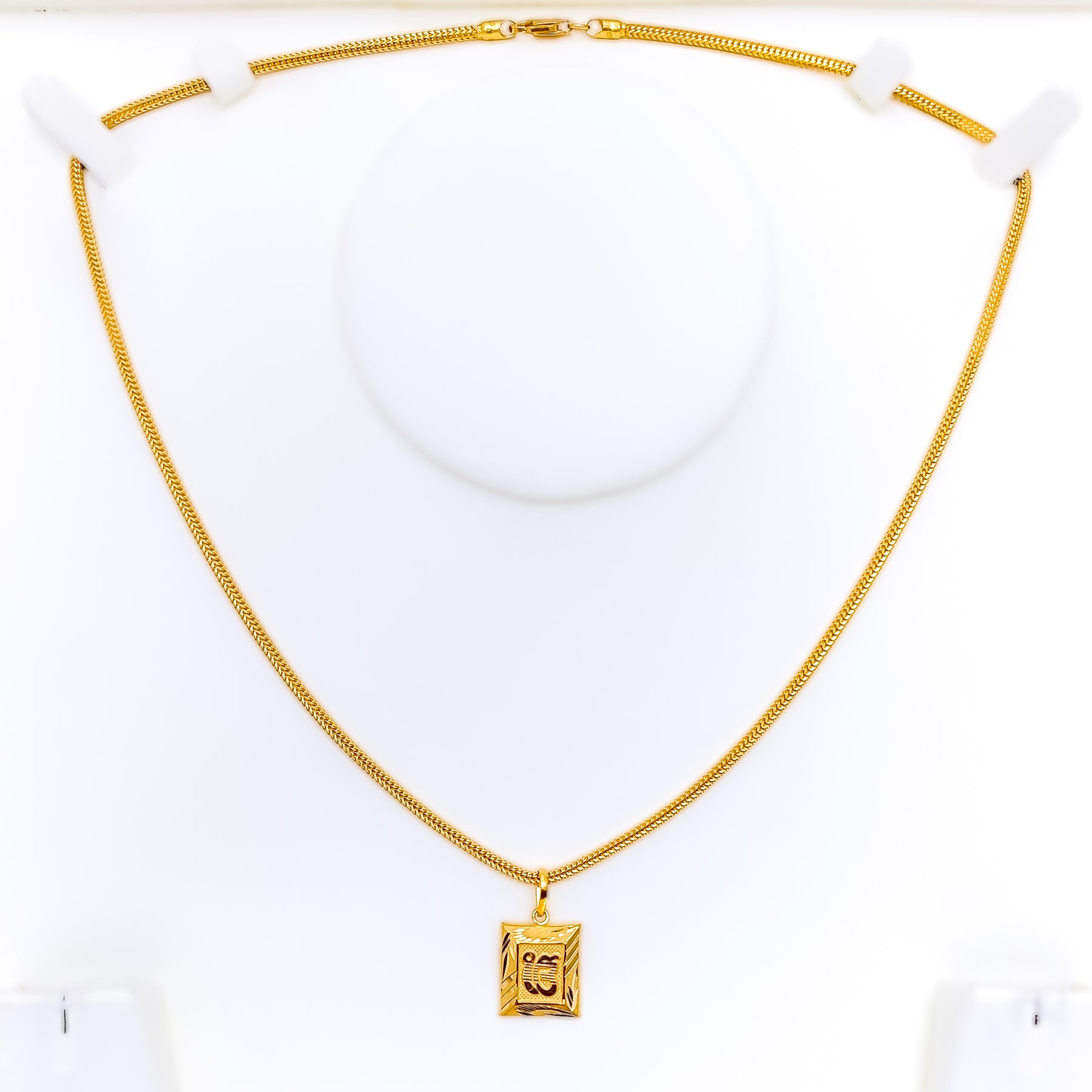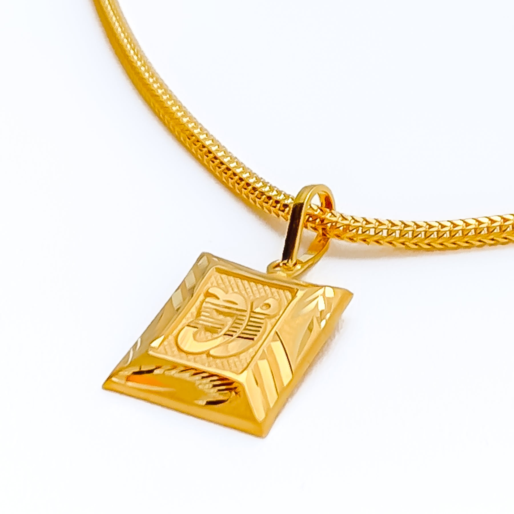 This finely crafted Khanda pendant in 22k yellow gold weighs 0.9 grams, offering a lightweight yet meaningful design. Measuring 0.8 inches in length, it presents a compact and stylish look with spiritual depth. The geometric detailing adds a modern touch while the polished finish enhances its golden brilliance. Designed without a chain, it allows versatile pairing with your favorite styles.