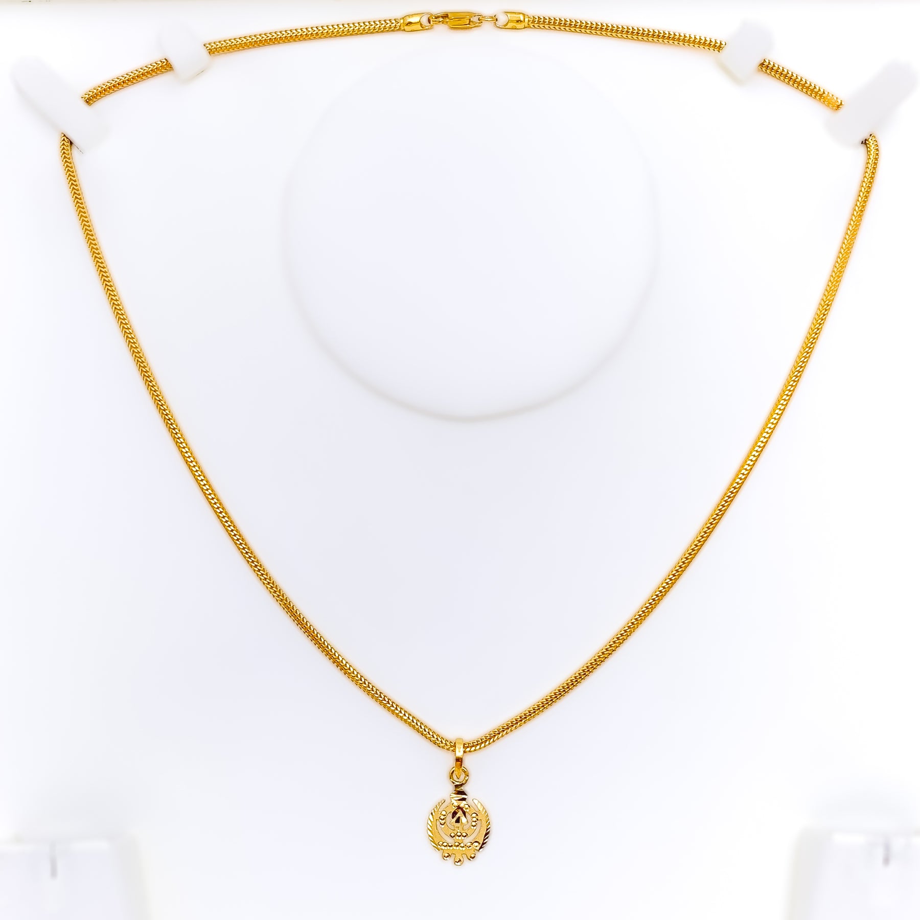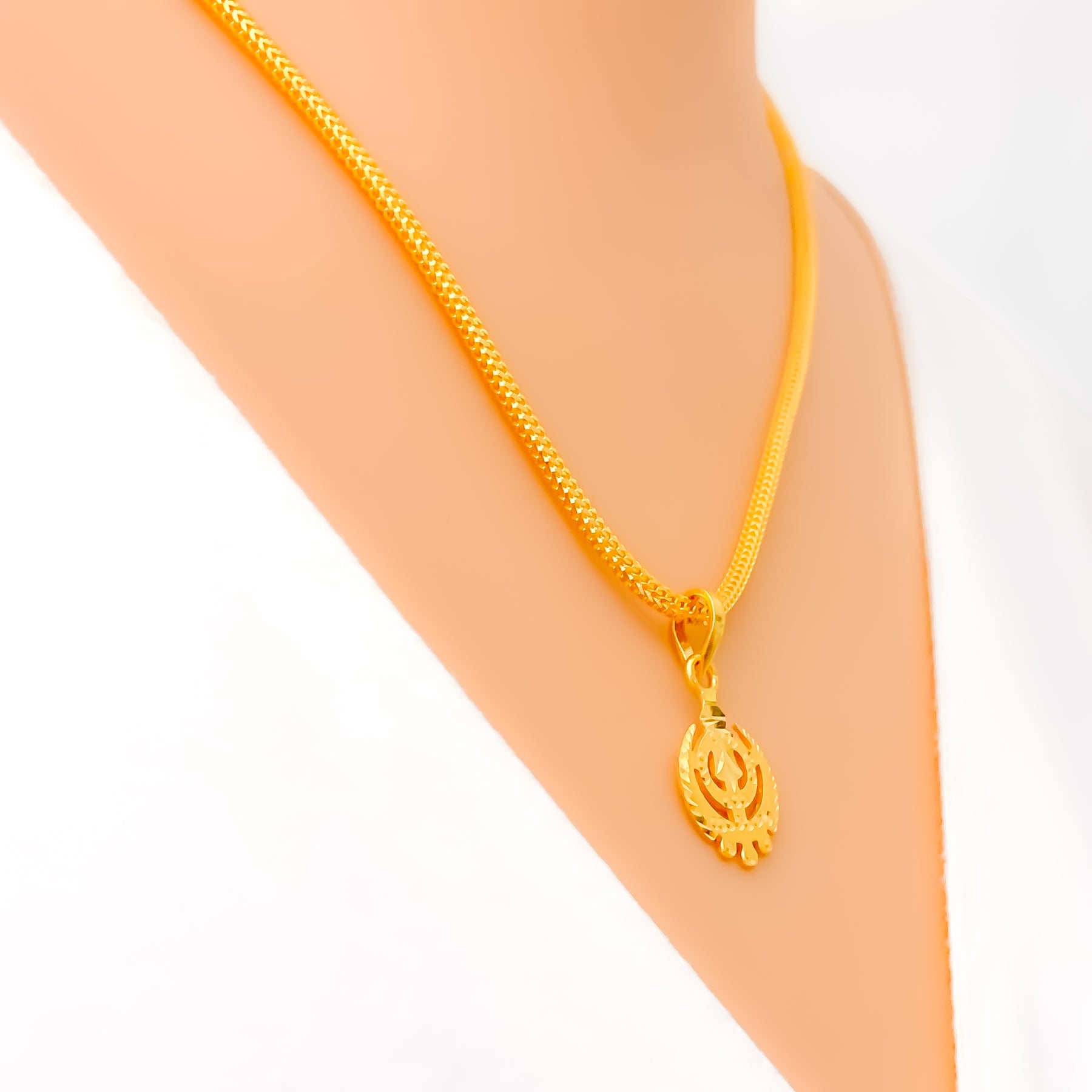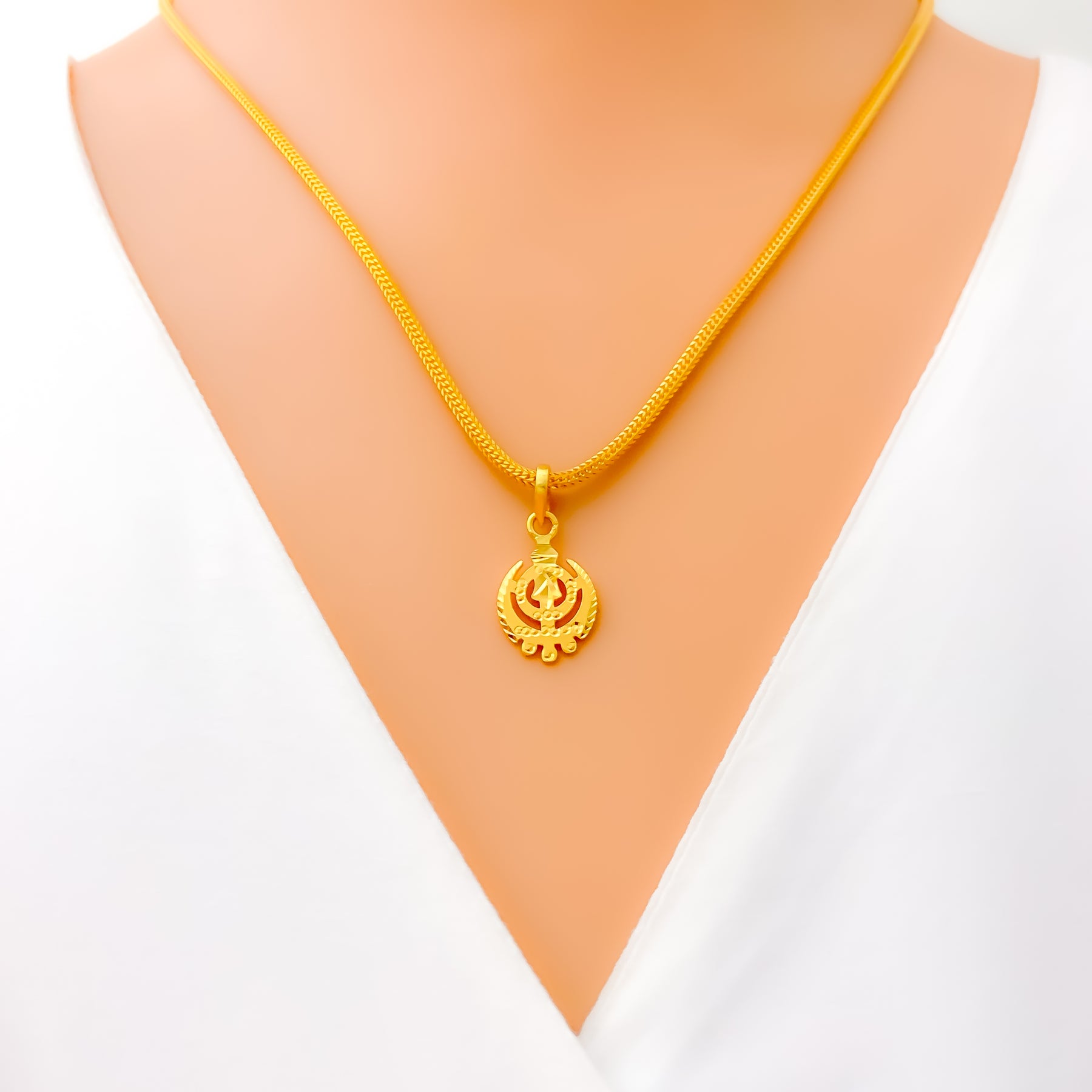 This finely crafted Khanda pendant in 22k yellow gold weighs 1.3 grams, offering a lightweight yet meaningful design. At 0.9 inches in length, it balances subtle elegance with spiritual significance. The polished finish enhances its radiant golden glow, making it versatile for daily wear or ceremonial occasions. With no chain included, it allows pairing with your preferred style.
