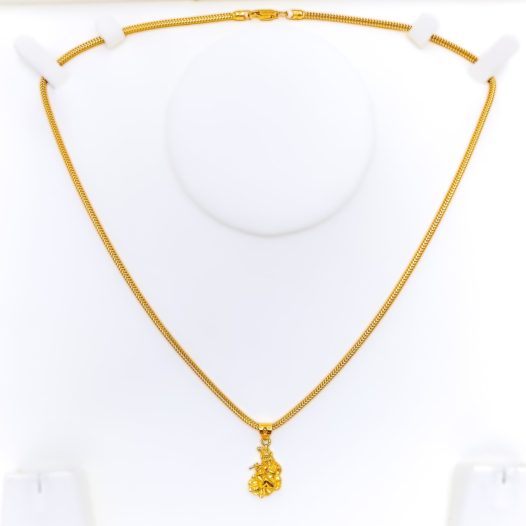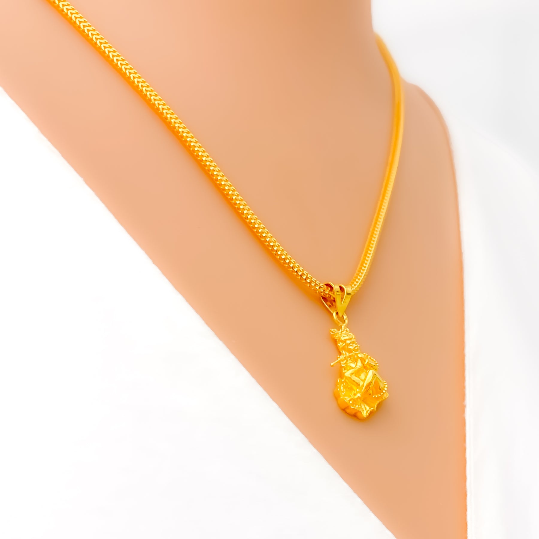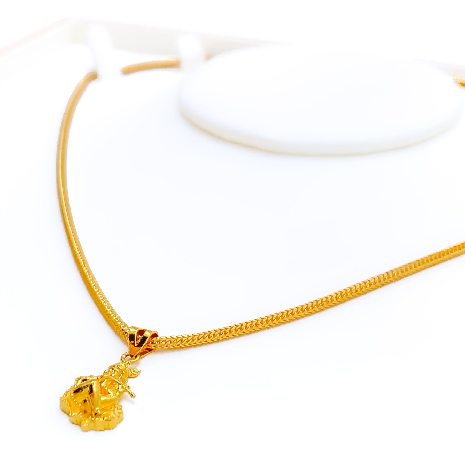 This refined 22k yellow gold pendant, weighing 2.6 grams, showcases a stately design that radiates special elegance. The polished finish enhances its golden brilliance, creating timeless allure. Measuring 0.9" in length, it presents a graceful yet versatile presence. A sophisticated accessory that beautifully blends classic charm with modern refinement, perfect for both everyday wear and festive occasions, with chain not included.