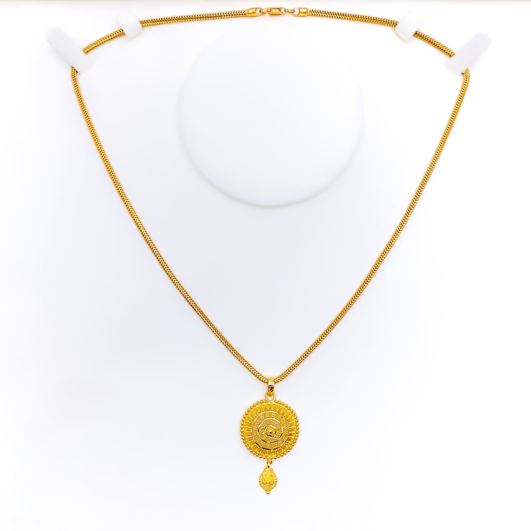 This refined 22k yellow gold pendant, weighing 3.8 grams, features an upscale design that radiates timeless sophistication. The polished finish enhances its golden brilliance, offering enduring allure. Measuring 1.7" in length, it presents a graceful yet striking presence. A versatile accessory that beautifully blends classic artistry with modern refinement, perfect for both daily wear and special occasions, with chain not included.