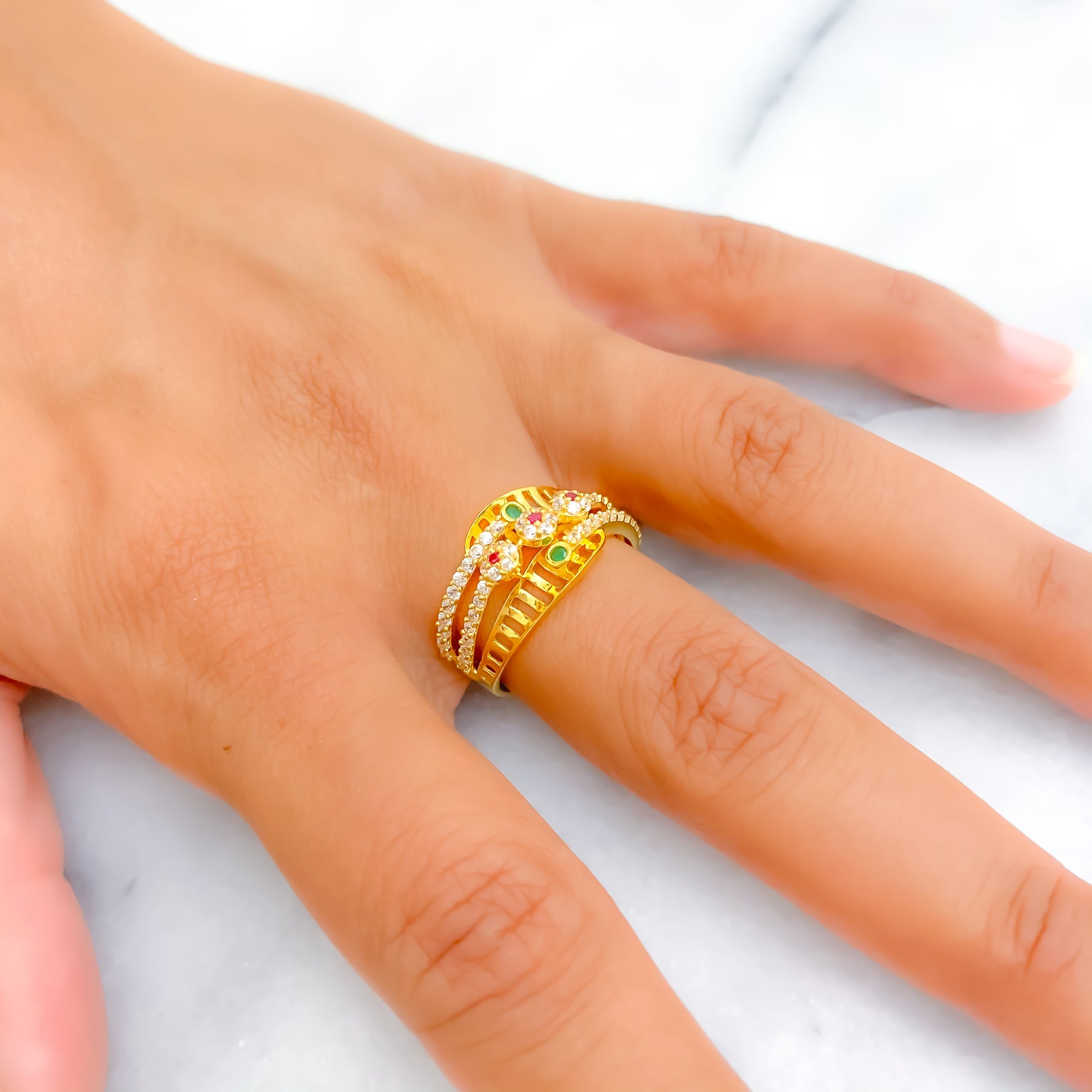 Crafted in 22k yellow gold with a weight of 3.1 grams, this radiant ring exudes lively brilliance. Sparkling cubic zirconia stones illuminate its polished finish, creating a luminous balance of elegance and charm. The sleek silhouette embodies both timeless appeal and modern sophistication. Offered in size 7.75 with resizing available, it is a versatile treasure suited for any collection.