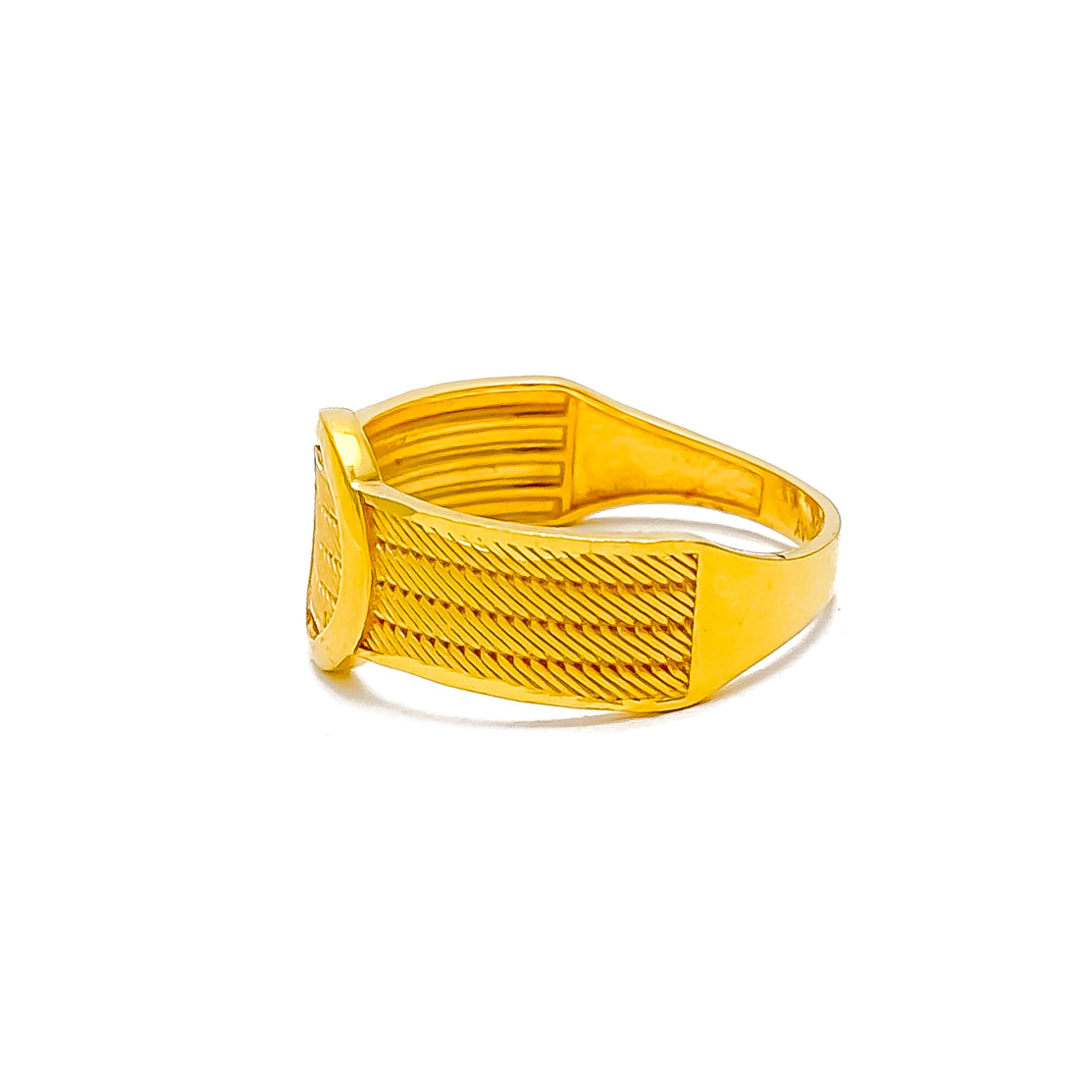 This stylish 22k yellow gold ring, weighing 4.0 grams, embodies refined elegance with its distinctive design. The polished finish enhances its radiant glow, creating a luminous presence. Sized at 8.25, it can be resized for a tailored fit. A sophisticated accessory that adds a touch of exclusivity to any jewelry collection.