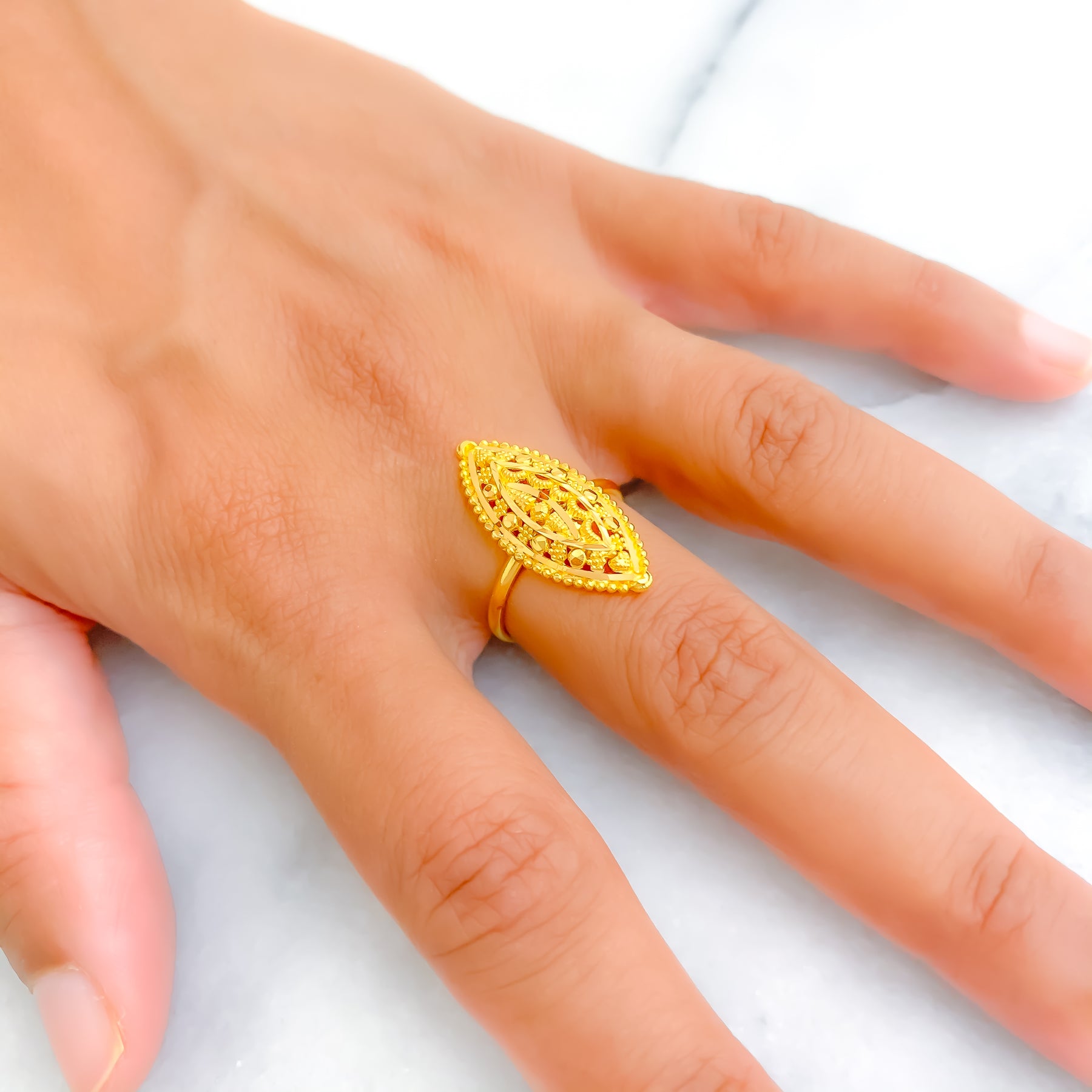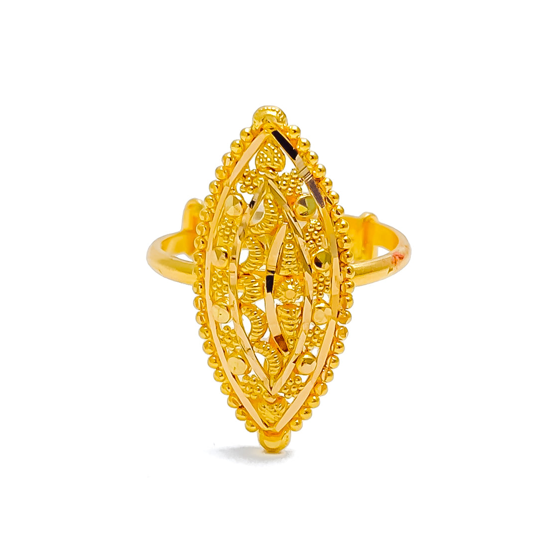 This striking 22k yellow gold ring, weighing 4.3 grams, showcases an elongated design that exudes bold refinement. The polished finish enhances its radiant appeal, making it a standout accessory. Sized at 6.5, it offers resizing options for a perfect fit. A luxurious statement piece ideal for elevating both classic and modern looks.
