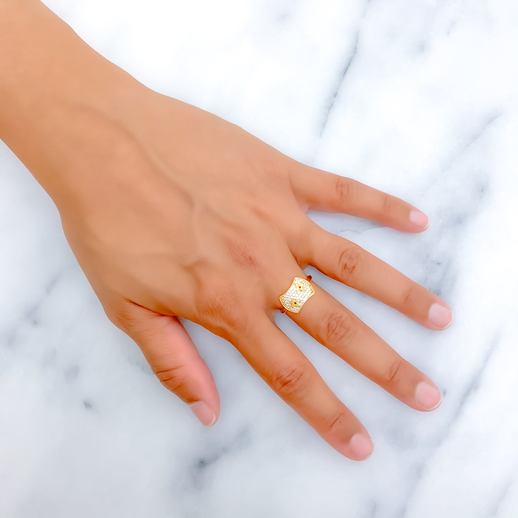 Vibrant and intricate, this 2.1-gram 21k yellow gold ring showcases detailing accented with sparkling cubic zirconia. Sized at 7.5 and offering sizing options, it ensures a comfortable fit. A stunning fusion of traditional artistry and modern elegance, perfect for any occasion.