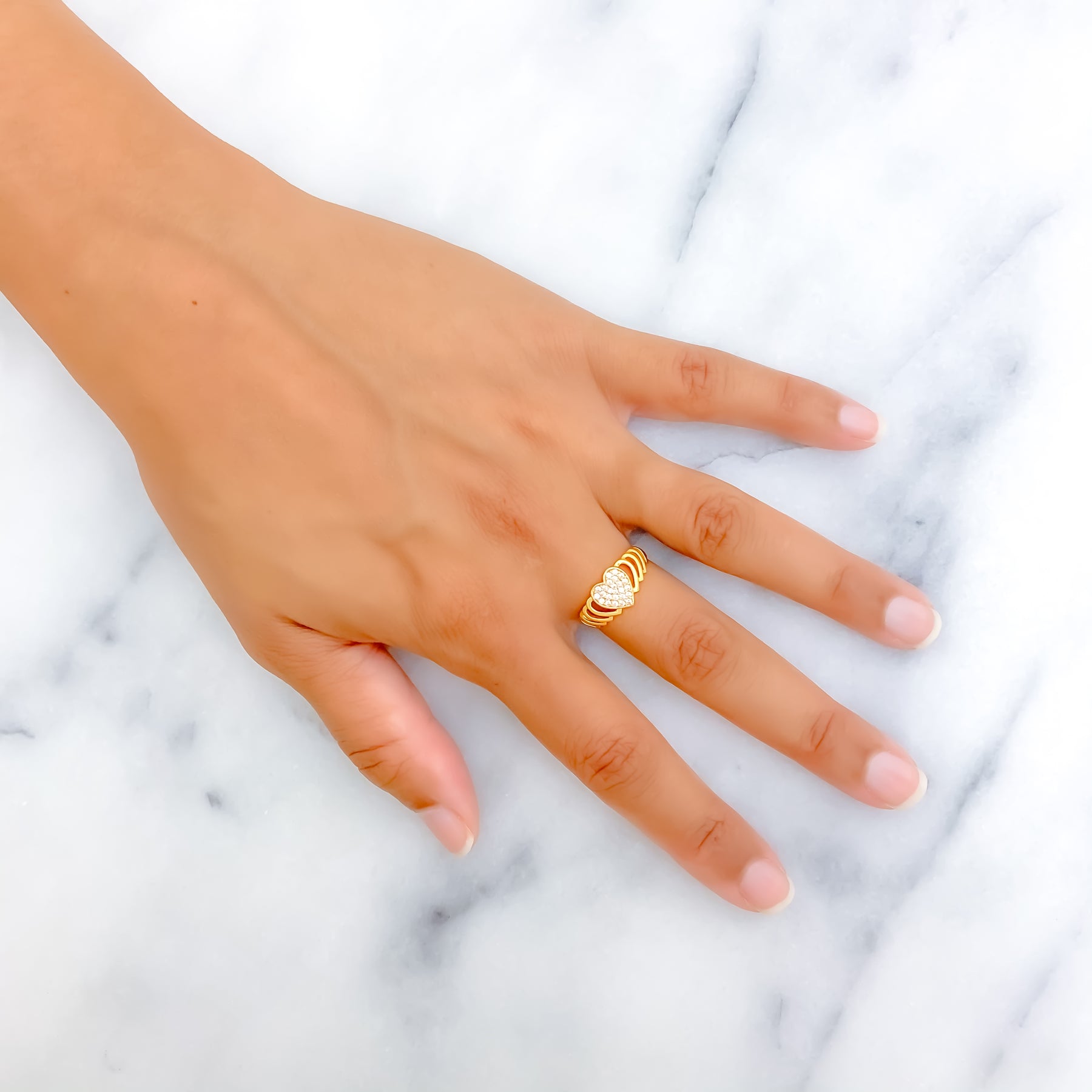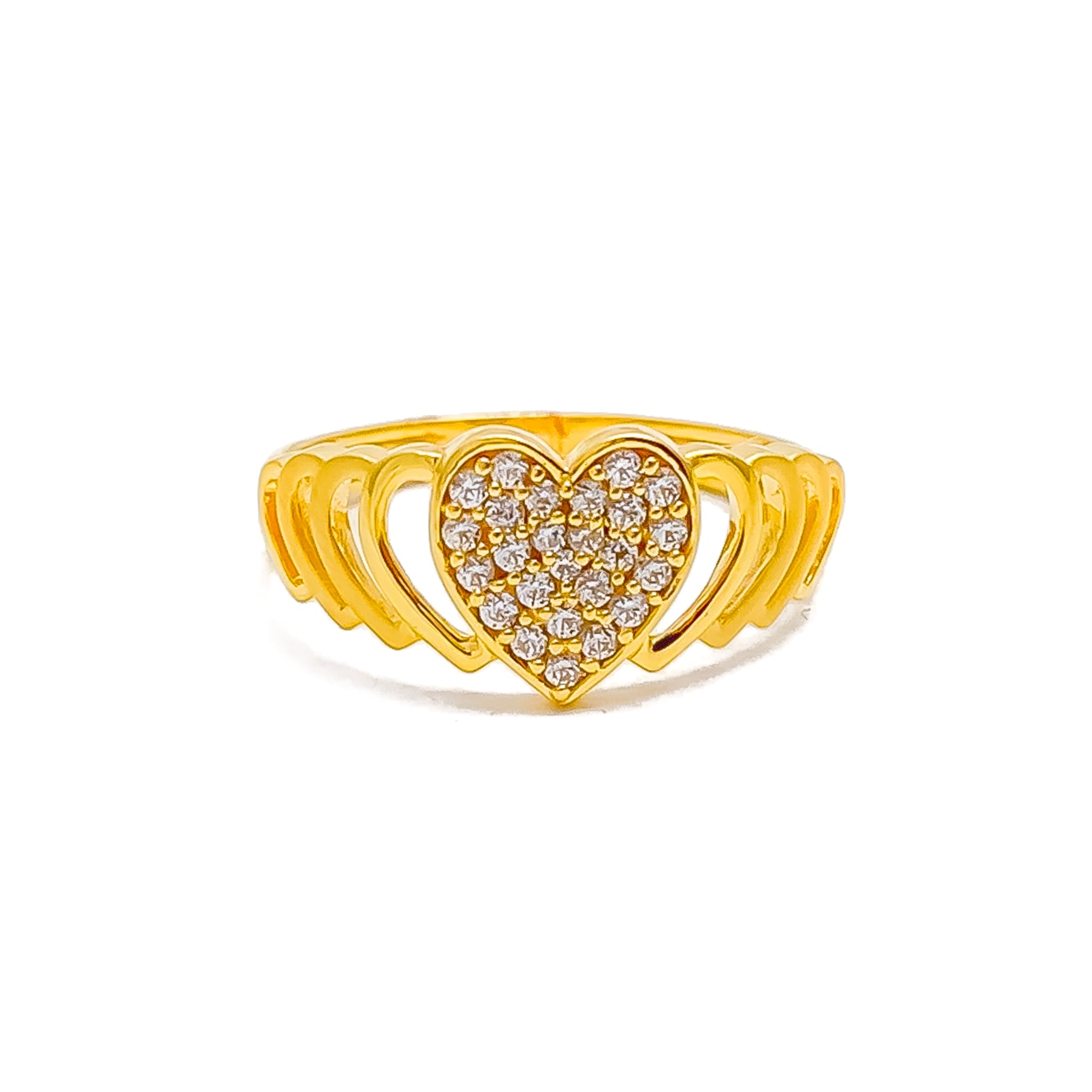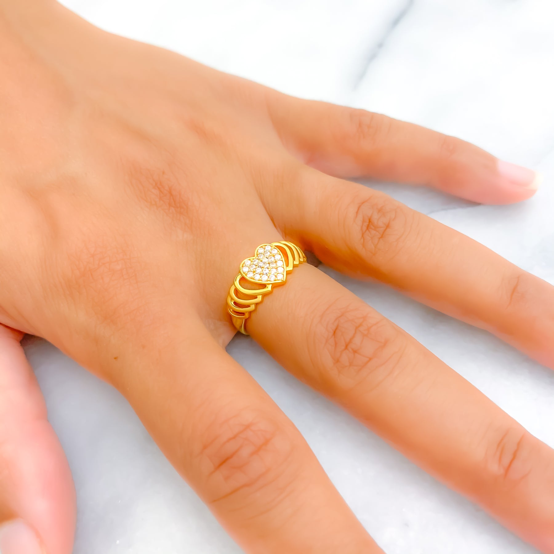This romantic 22k yellow gold ring, weighing 2.8 grams, features a heart-inspired design adorned with radiant cubic zirconia. Its polished finish enhances the luminous sparkle, creating a refined and elegant look. Sized at 6.25, it can be resized for a comfortable fit. A meaningful piece that beautifully symbolizes enduring love and style.