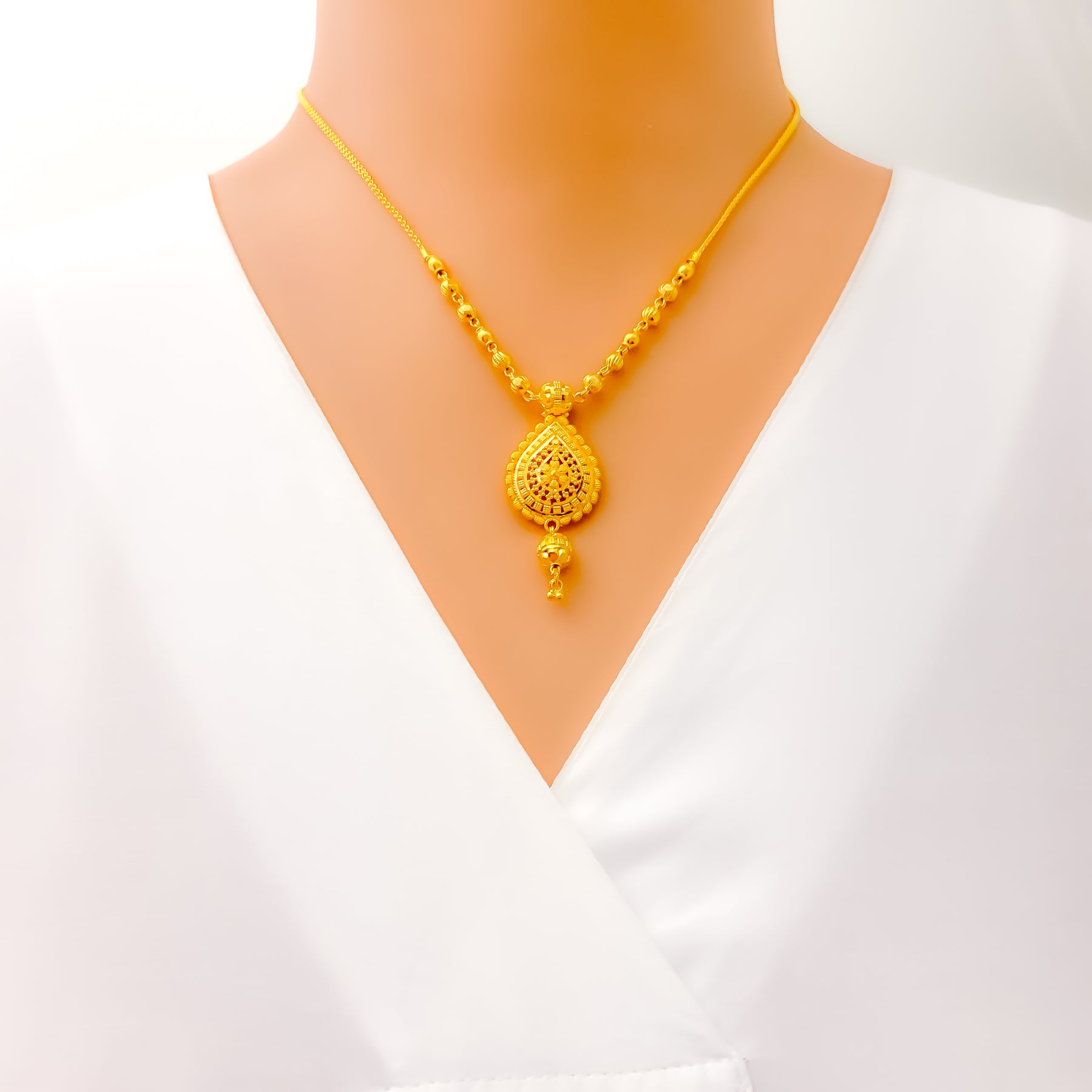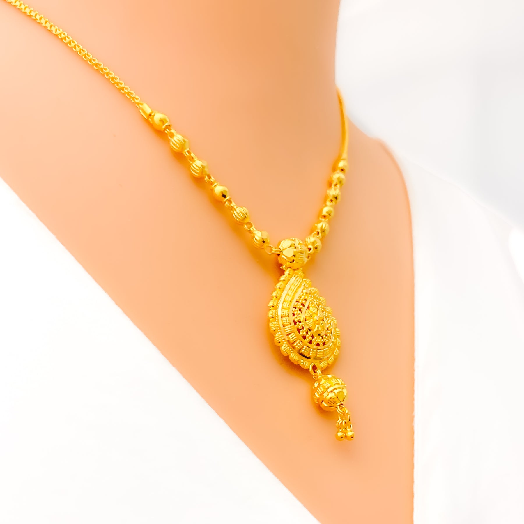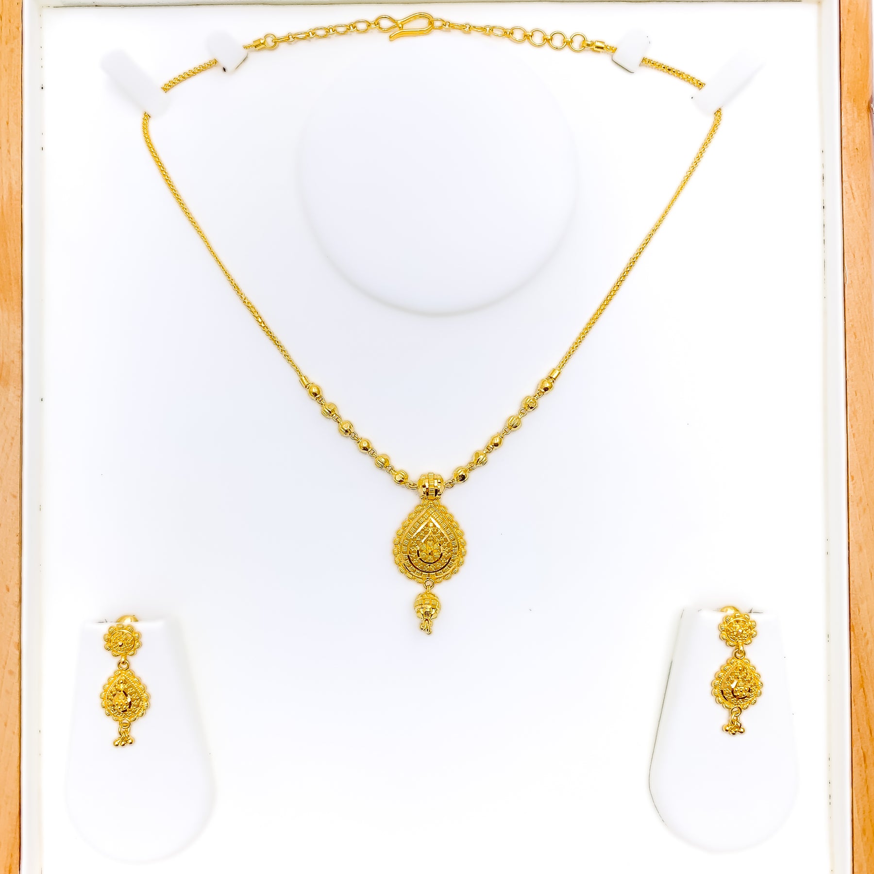 Exquisitely designed, this 22k gold necklace set radiates brilliance with its intricate craftsmanship and graceful silhouette. Weighing 19.5 grams, it blends opulence with refined sophistication. The polished yellow gold finish enhances its luminous glow and timeless charm. Measuring 16 inches with 1.25-inch earrings, it’s a captivating reflection of classic elegance.